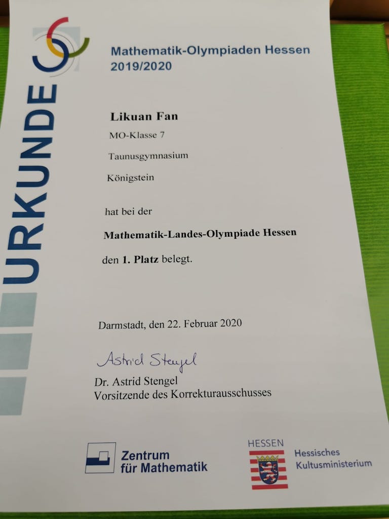 Likuan Fan hat am Taunusgymnasium Geschichte geschrieben und als erster Schüler der Königsteiner Schule den hessischen Olympiasieg bei der 59. Mathematik-Olympiade erreicht!