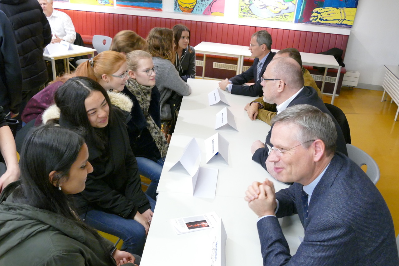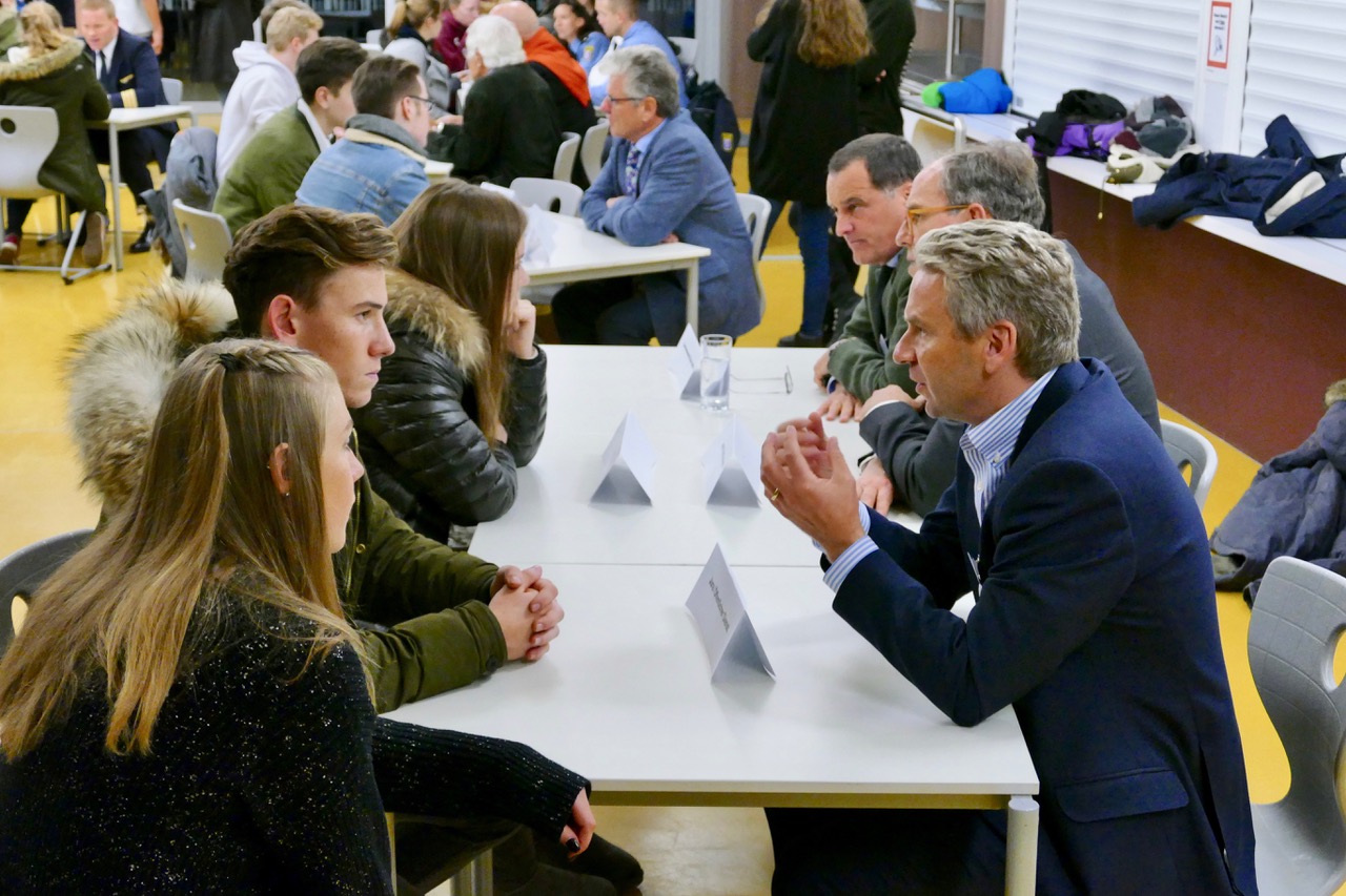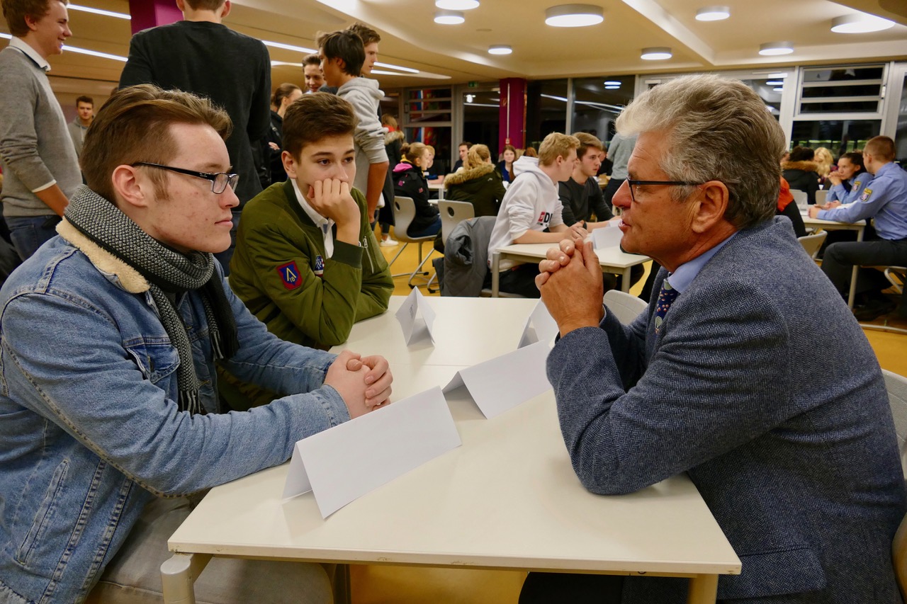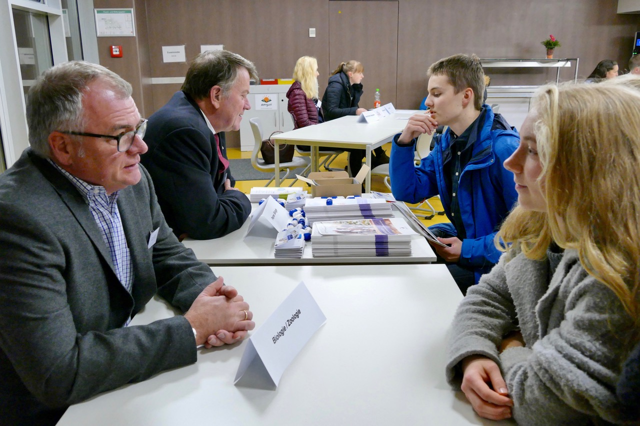 Schülerinnen und Schüler der Q1-Phase der Oberstufe haben hier Gelegenheit, mit Vertretern unterschiedlichster Berufe und Branchen ins Gespräch zu kommen und sich für ihr späteres Berufsleben zu orientieren. Dirk Mälzer vom Rotary Club Bad Soden-Königstein und Jochen Henkel, Schulleiter des Taunusgymnasiums, begrüßten die Schülerinnen und Schüler in der Cafeteria, wo schon kleine, thematisch geordnete Tischgruppen für die dann folgenden Gespräche vorbereitet waren.