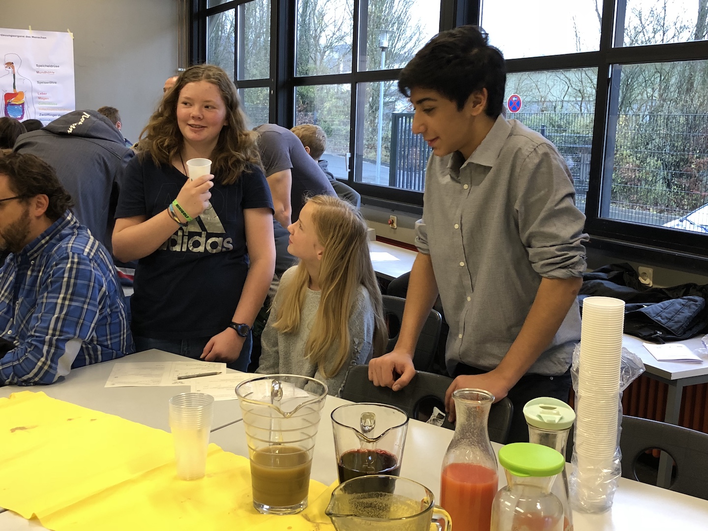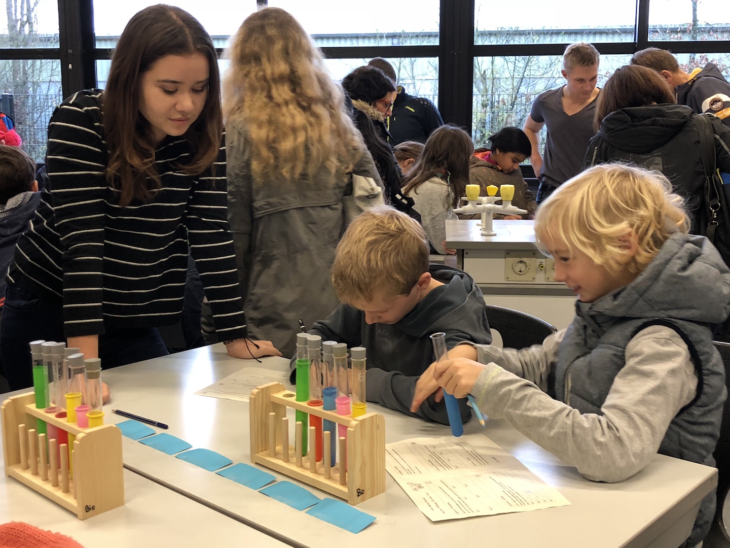 Wer sich, bevor es um detaillierte Informationen zu bestimmten Themen an den einzelnen Ständen und in den Fachräumen ging, erst einmal einen Überblick verschaffen wollte, konnte sich einer der zahlreichen Führungen durch das Schulgebäude anschließen. Unter dem Motto „Fit für das TGK?“ veranstalteten Schülerinnen und Schüler der Klassen 9 zudem Kinderführungen durch das Schulhaus. Im Elterncafé sorgten Mütter der Elterninitiative „World of Breakfast“ (WOB) bestens für die Bewirtung der erwachsenen Gäste, Kinder ab einem Alter von drei Jahren waren in der Kinderbetreuung herzlich willkommen, so dass Eltern und ältere Geschwister in aller Ruhe Informationen und Eindrücke sammeln konnten.
