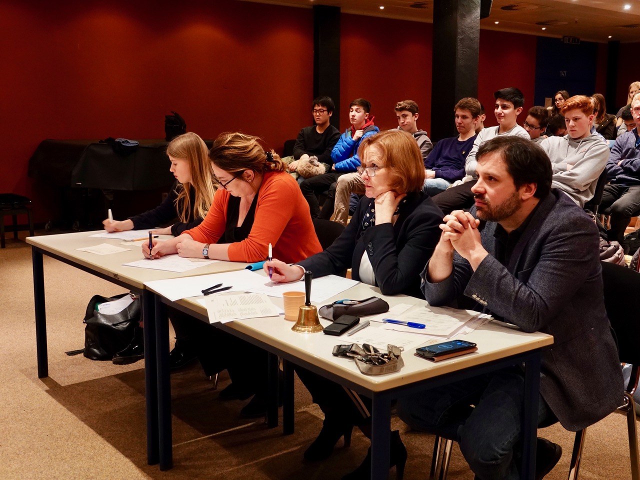 In der Finaldebatte des Schulwettbewerbs hatte es die Jury diesmal sehr schwer, eine Entscheidung zu treffen, da alle Debattierenden große Stärken zeigten. Sonja Göbel schlug in ihrer Eröffnungsrede sehr genau vor, wie man Klassenarbeiten anonym schreiben könnte: am Computer mit eine speziellen Software. Die Contra-Seite, die von Julius Gerstein und Juliane Walther vertreten wurde, erkannte jedoch schnell die Schwachpunkte des Vorschlags: Wie soll die nötige technische Ausrüstung finanziert werden und was ist mit Schülern, die das Tippen am Computer überhaupt nicht beherrschen? Sonja Göbel und Jonathan Smith auf der Pro-Seite betonten demgegenüber die Chancen, die in dem neuen Verfahren liegen würden, und versuchten Lösungswege für die Probleme aufzuzeigen. Daraus entstand eine lebhafte Diskussion, in der alle Debattierenden konzentriert die Argumente der Gegenseite aufgriffen und redegewandt hinterfragten.