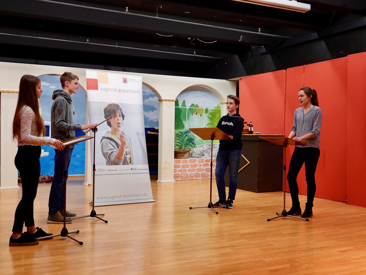 „Ich bin begeistert!", meint Beate Herbst, die neue Oberstufenleiterin des Taunusgymnasiums, nachdem sie das erste Mal eine Debatte von Jugend debattiert juriert hat. „Was die Schülerinnen und Schüler hier lernen, ist wirklich entscheidend für das weitere Leben! Ich bin beeindruckt von der Leistung der Teilnehmerinnen und Teilnehmer!" Ihr Lob richtet sich besonders an die Schulsiegerin Juliane Walther sowie die drei weiteren Finalisten der Altersstufe I Julius Gerstein, Sonja Göbel und Jonathan Smith. Die Neuntklässler, die zuvor jeweils im Klassenwettbewerb und in der Halbfinaldebatte überzeugt hatten, debattierten im Theatersaal des Taunusgymnasiums zur Frage, ob Klassenarbeiten zukünftig anonymisiert geschrieben werden sollen.