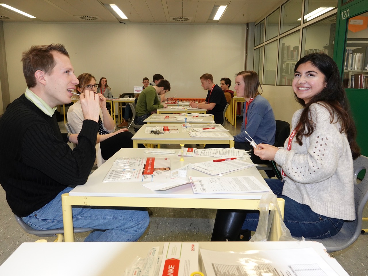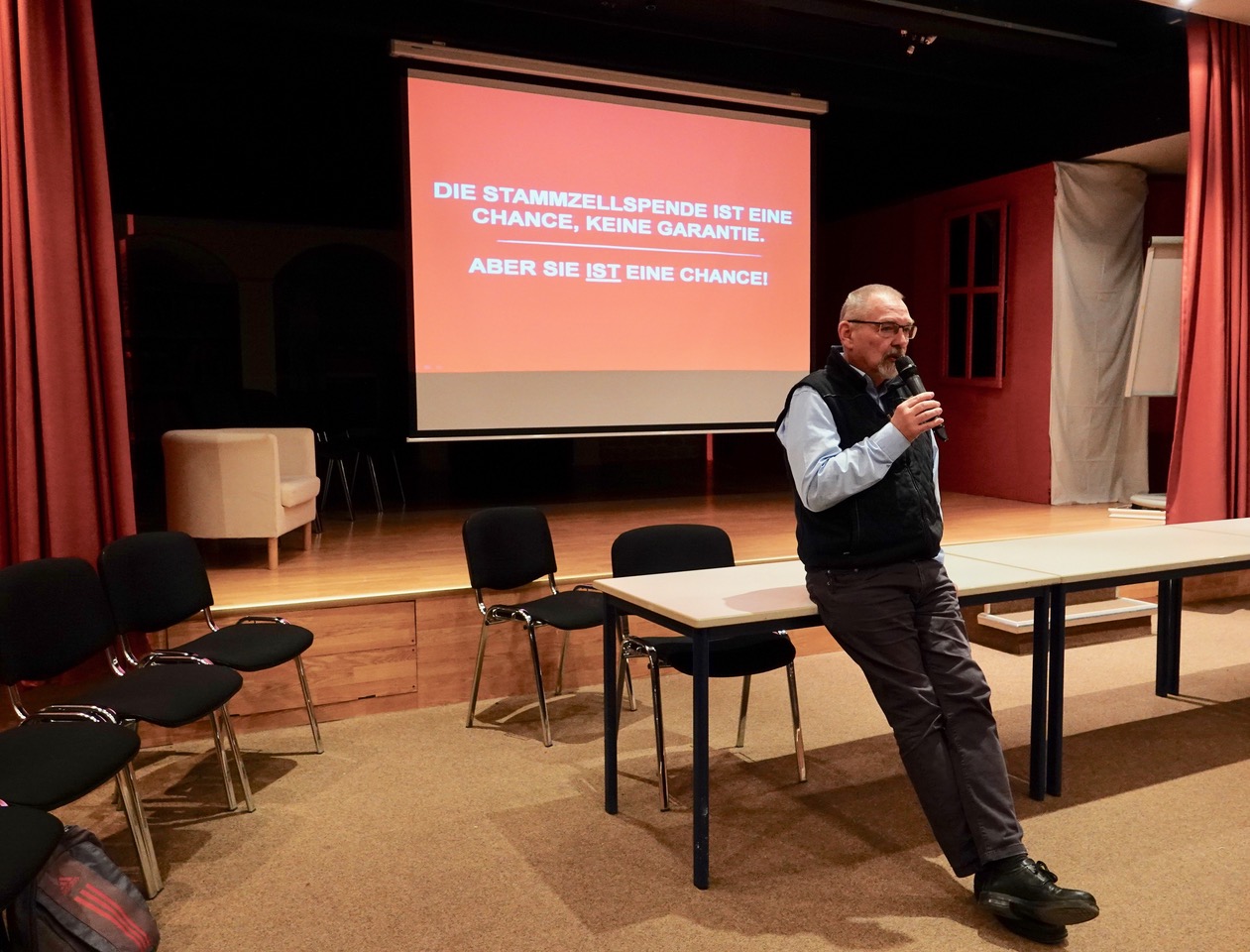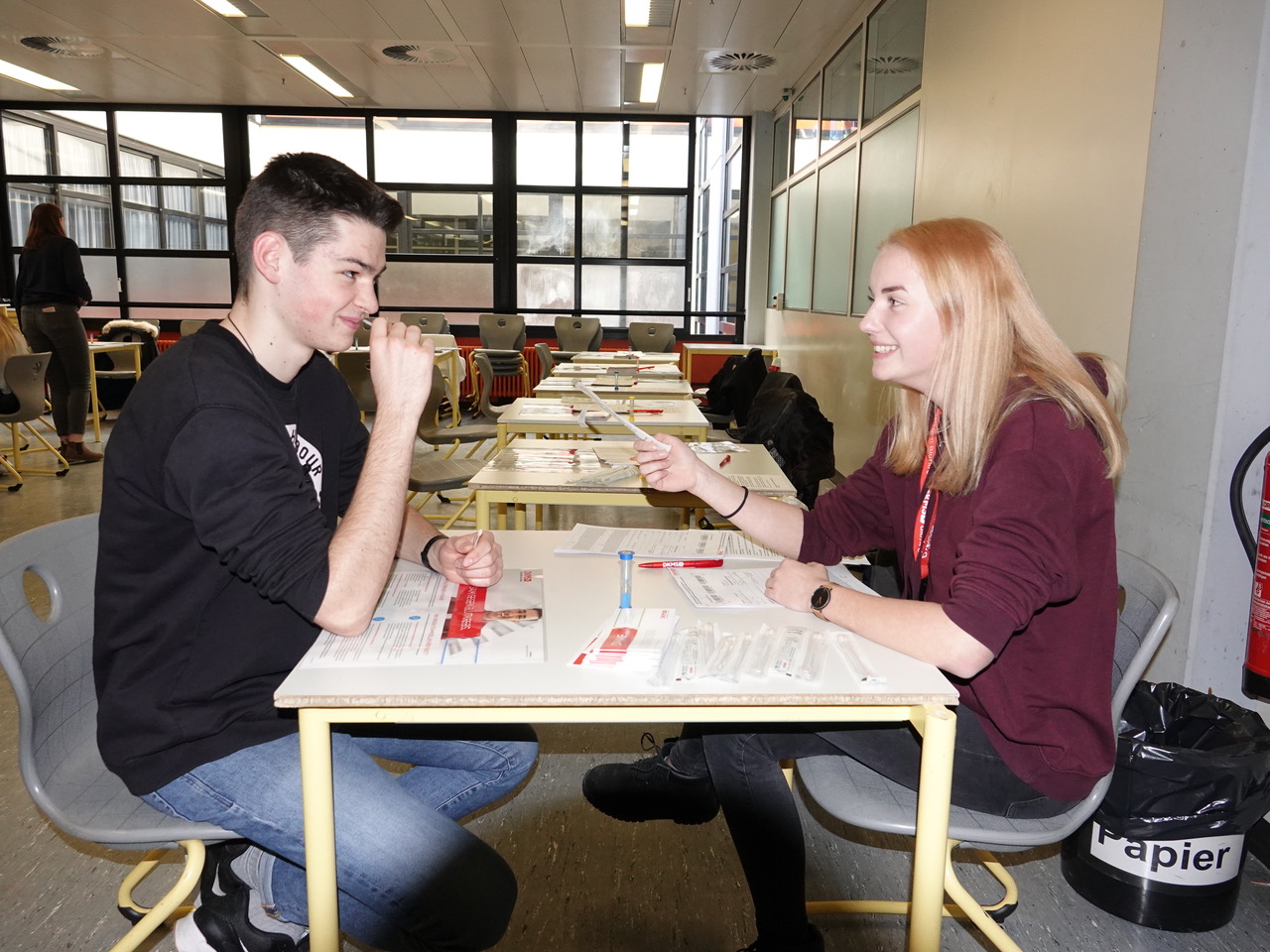 Nach der Begrüßung durch Schulleiter Jochen Henkel, der sich mit großer Empathie für die Aktion einsetzte und ausführlichen Vorinformationen durch Natascha Döhring, eine Mitarbeiterin der DKMS, fand nun am Taunusgymnasium nach vier Jahren zum zweiten Mal eine solche Typisierungsaktion statt. Bei der Informationsveranstaltung zu Gast war Axel Stolzenwaldt, ein im Jahr 2013 an Leukämie erkrankter Kollege am Taunusgymnasium, der gleichsam sein zweites Leben einer Stammzellenspende verdankt und nun als lebendiges Beispiel für den Erfolg der Therapie für die Registrierung als Spender warb. Sein genetischer Zwilling ist in Schweden zu Hause – gern würde er ihn persönlich kennenlernen. Mittlerweile feiert Stolzenwaldt – so merkte er scherzhaft an – seinen 5. Geburtstag seit der erfolgreichen Knochenmarksspende.