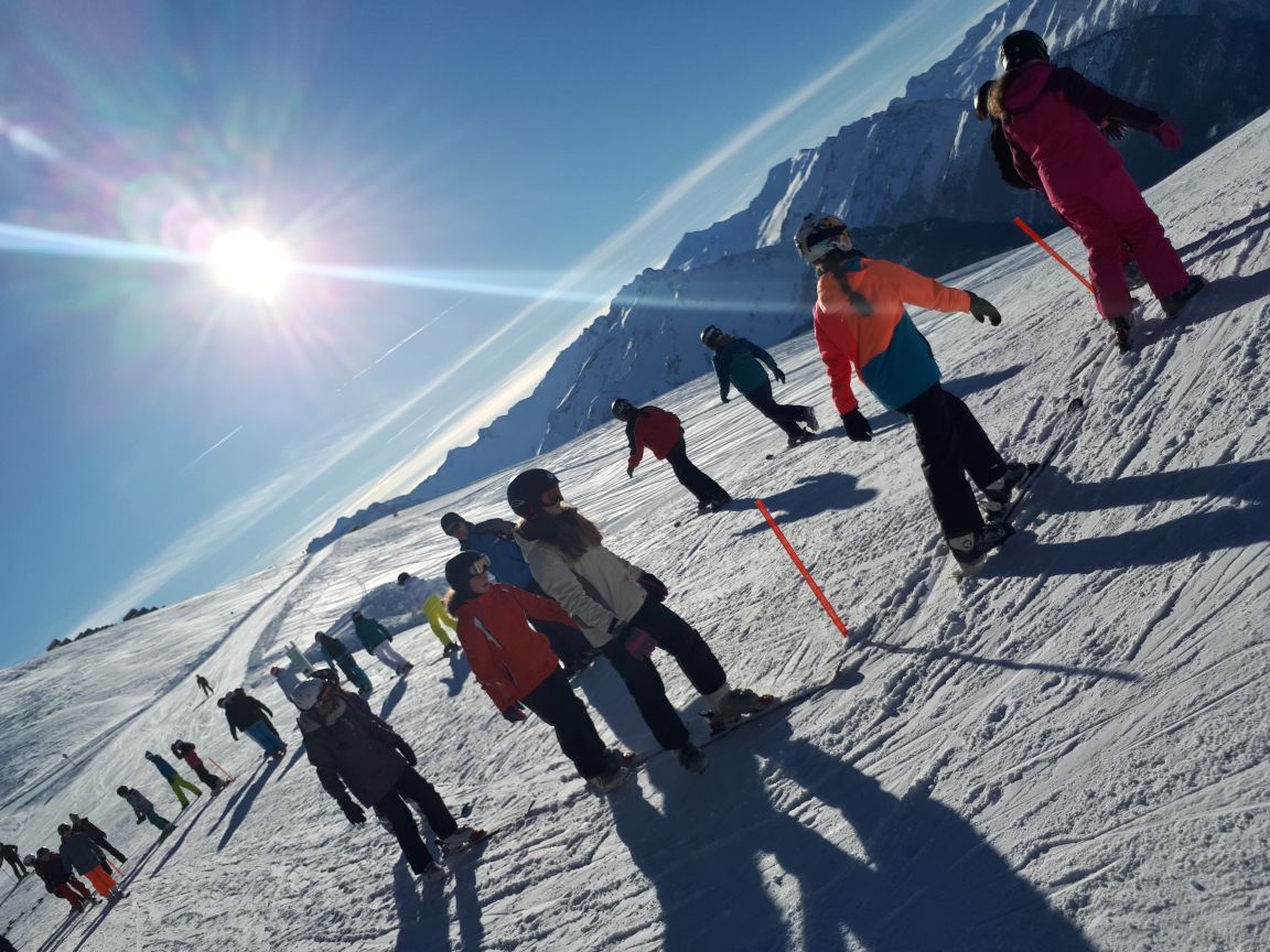 Dafür hatte man schon am nächsten Tag den Vorteil, sich direkt vor der Hütte vor traumhafter Kulisse auf die Skier bzw. das Snowboard stellen zu können. Anders als im traditionellen instruktiven Skikurs erlernten die Schülerinnen und Schüler schnell durch eigens für die Schule entwickelte Kooperationsaufgaben das Skifahren und Snowboarden. Wenn auch der Spaß immer im Vordergrund stand, so mussten die ambitionierten Wintersportler des TGK bei der Bewältigung der Aufgaben auch Verantwortung für Ihre Mitschüler übernehmen. Am Ende der Woche konnte jeder Einzelne stolz auf seinen Lernerfolg sein.