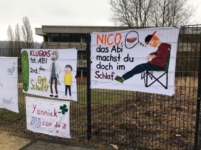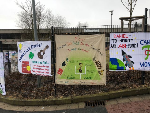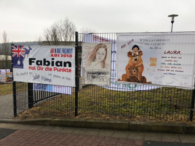 Gut zu sehen ist die Unterstützung auch an den Zäunen der Schule. Zahlreiche kreativ gestaltete Plakate mit motivierenden Sprüchen und guten Wünschen sind dort zu sehen. Seit vielen Jahren ist dieser Brauch nicht mehr wegzudenken und stimmt Schüler, Lehrer und Verwandte auf die bevorstehenden aufregenden und anstrengenden Wochen ein.