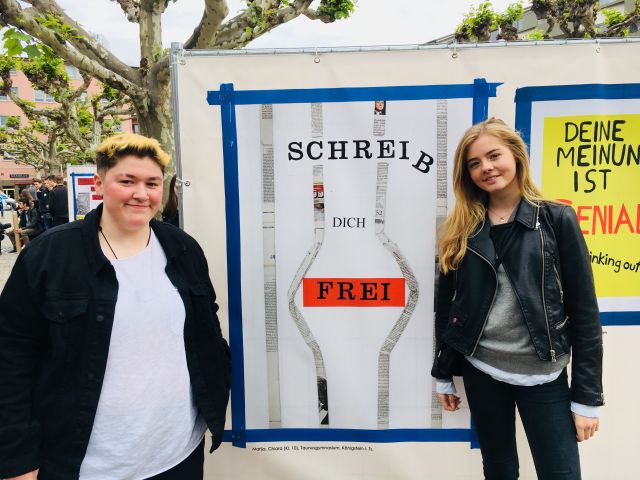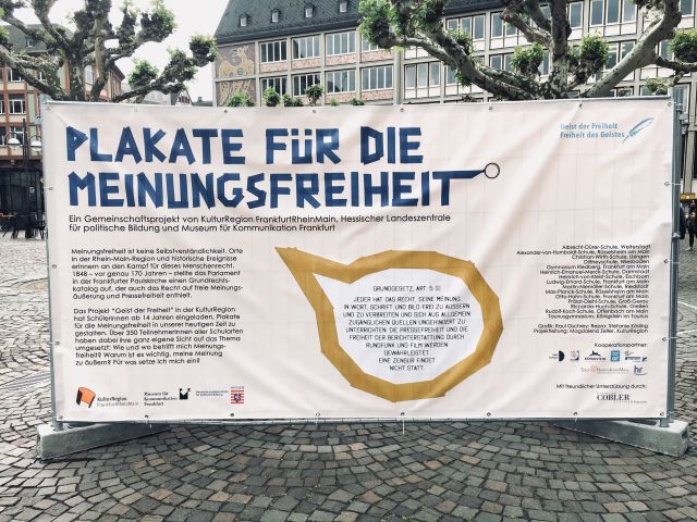 Kunst-LK der E-Phase gewinnt ersten Preis und Sonderpreis für besondere Gestaltung Meinungsfreiheit ist keine Selbstverständlichkeit. Das zeigen nicht erst die gegenwärtigen Entwicklungen in Europa und der Welt. Auch Globalisierung und Internet stellen das so grundlegende Prinzip unserer demokratischen Gesellschaft vor große Herausforderungen. Die KulturRegion Frankfurt-RheinMain, die Hessische Landeszentrale für politische Bildung Hessen und das Museum für Kommunikation haben mit jungen Menschen über das Recht auf freie Meinungsäußerung gesprochen und zu einem Plakatwettbewerb aufgerufen. Prägnant, kritisch und kreativ haben die 350 jungen Teilnehmenden aus der ganzen Rhein-Main-Region ihre Ansichten auf Plakaten zum Ausdruck gebracht. Eine sechsköpfige Jury bewertete die Beiträge und vergab je einen 1. und 2. Preis in zwei unterschiedlichen Altersgruppen.