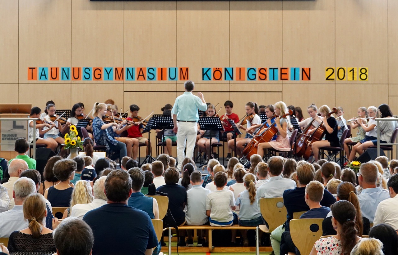 Weitere Willkommensgrüße kamen von Schulsprecherin Miriam Färber und den Paten der neuen 5. Klassen. Musikalisch gestaltet wurde die Aufnahmefeier vom Kleinen Orchester unter der Leitung von Michael Neubeck und vom Chor des Taunusgymnasiums, den Martina Orth vom Klavier aus leitete. Nachdem die neuen Fünftklässler ihren Klassenlehrern und Klassenlehrerinnen in die Klassenräume gefolgt waren, informierte der Vorsitzende des Schulelternbeirats, Thomas Sachs, über die Aufgaben der Elternvertretung und – in Vertretung des Vorsitzenden des Fördervereins, Bernd Dönicke – über die Ziele dieser wichtigen Institution. Beate Achenbach informierte über die Pädagogische Mittagsbetreuung und Denise Mesterharm über die von Eltern betriebene „World Of Breakfast“ (WOB) in der Cafeteria des Taunusgymnasiums.
