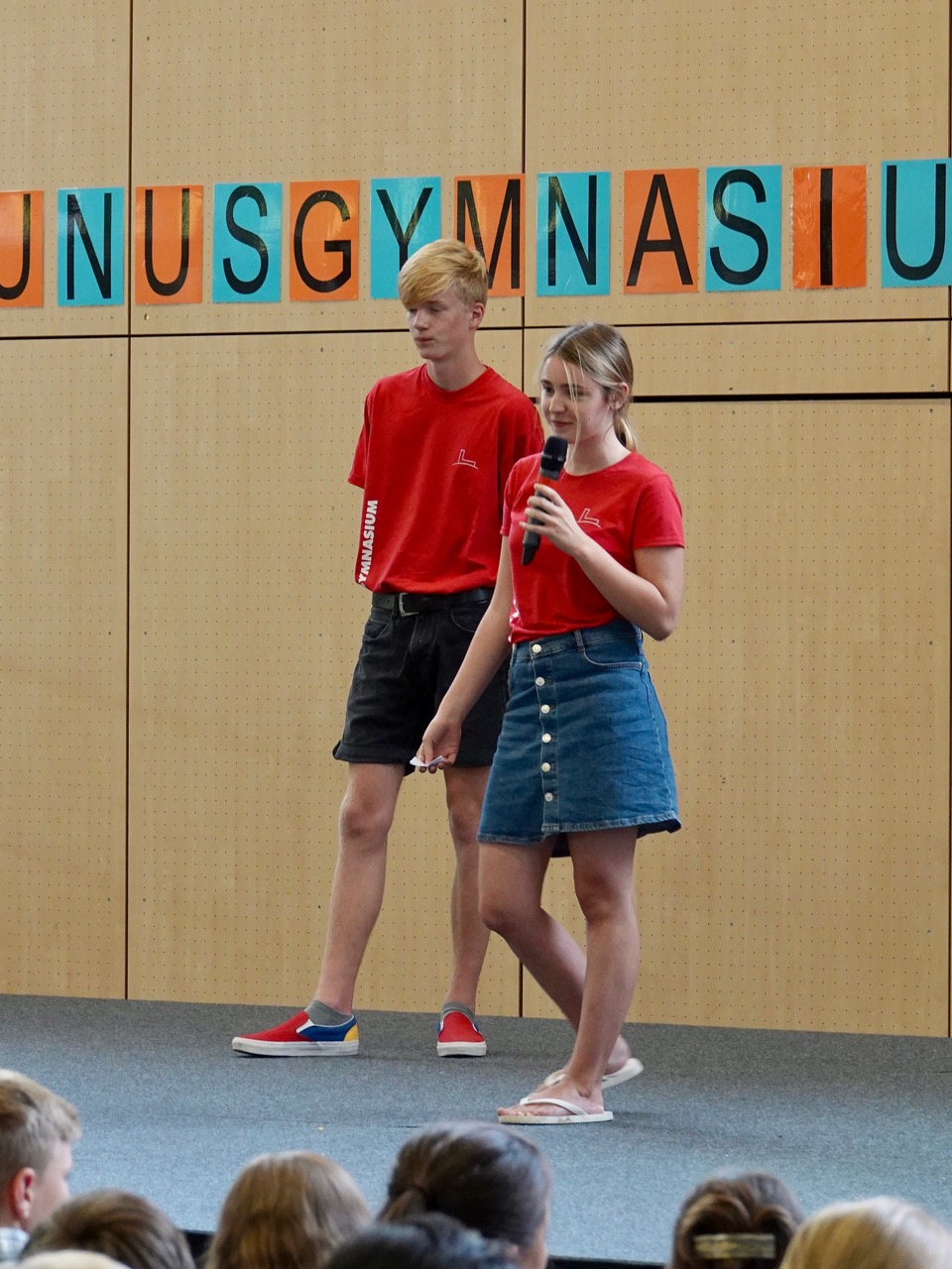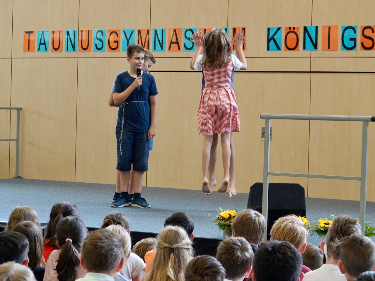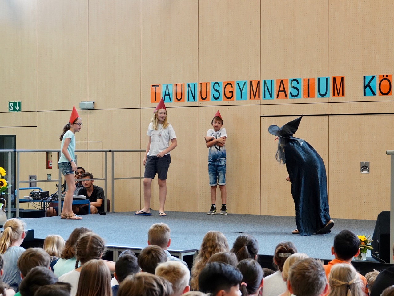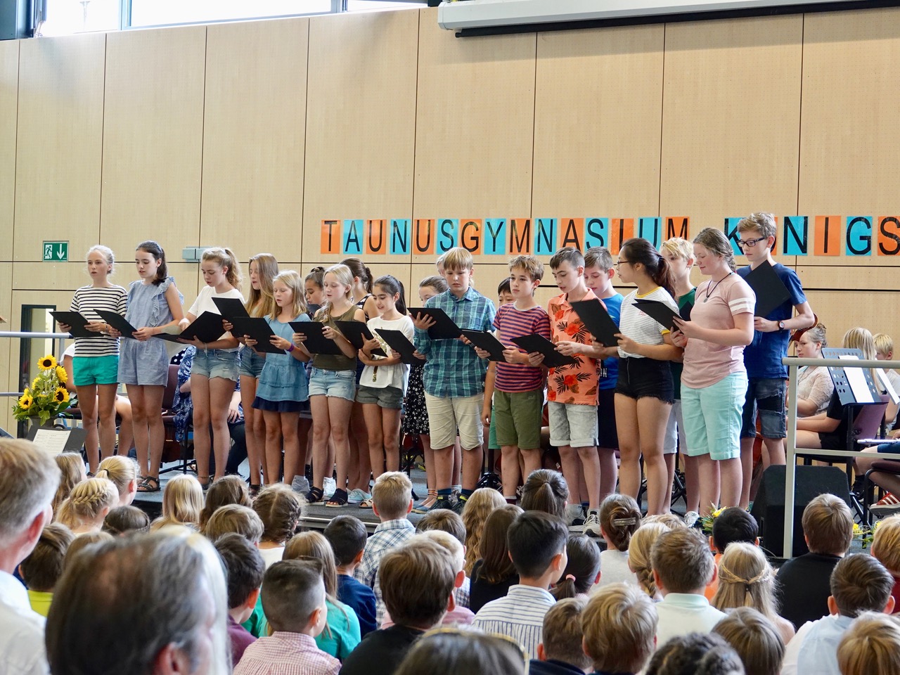 Genau 200 Fünftklässler waren es, die zum Schuljahresbeginn in die 5. Jahrgangsstufe am Taunusgymnasium aufgenommen wurden. Sie verteilen sich auf sieben Eingangsklassen, zwei davon sind Teil des bilingualen Bereichs, eine davon beginnt mit Französisch als erster Fremdsprache. Aus zweien der neuen 5. Klassen setzen sich die neue Bläsergruppe und Streichergruppe mit je etwa 20 Schülerinnen und Schülern zusammen. Den eigentlichen Aufnahmefeierlichkeiten voran ging ein Schulgottesdienst unter der Leitung von Christine Antony und Pastoralreferent Johann Maria Weckler, von Schülerinnen und Schülern unter anderem mit kleinen szenischen Darstellungen ausgestaltet. Die Liedbegleitungen und Zwischenspiele übernahm ein Ensemble mit Christine Antony (Gesang), Anna Leitner (Violine), Sonja Keitel (Flöte), Marinus Wack (Perkussion) und Linus Dittmer (Keyboard).