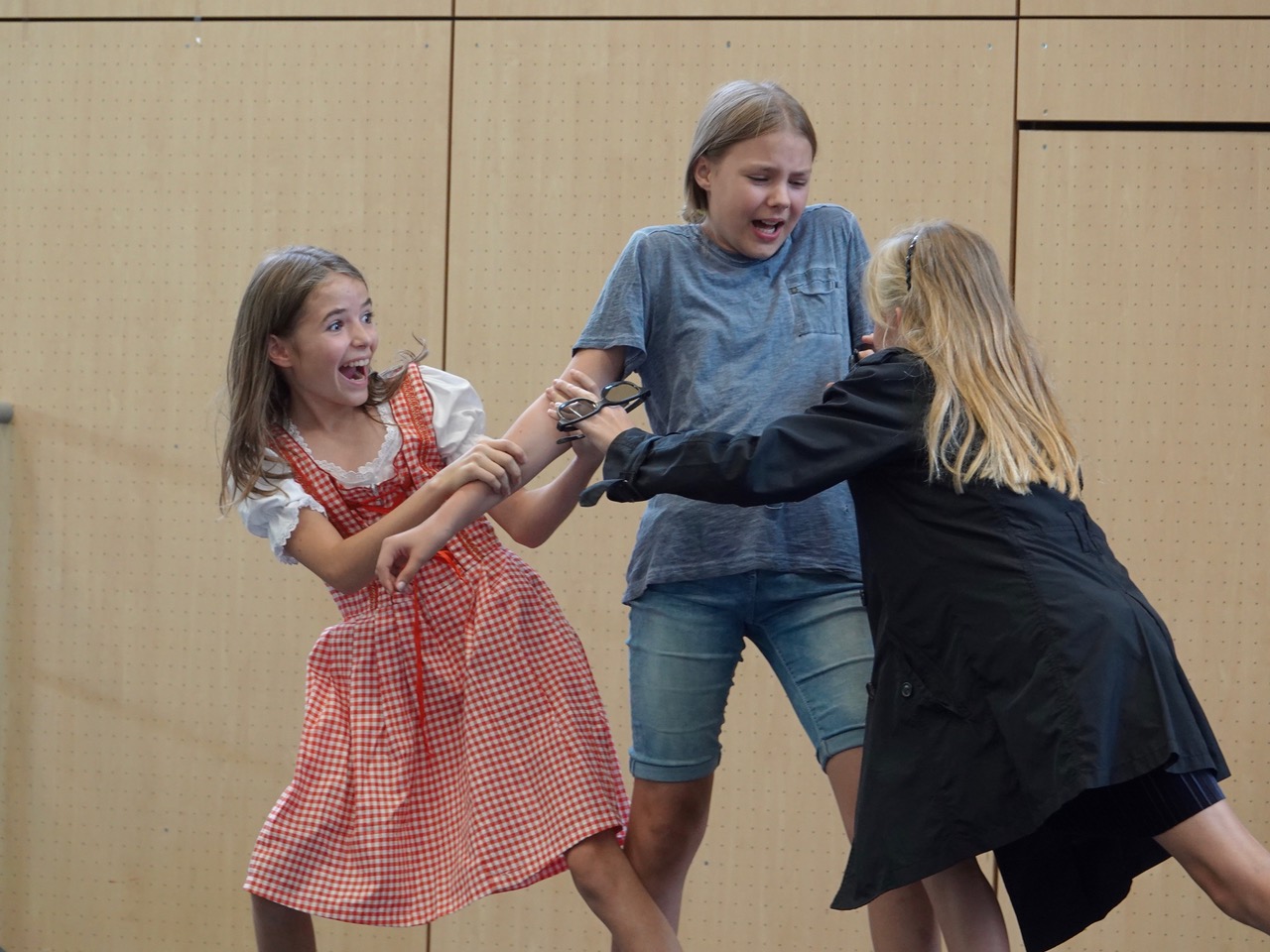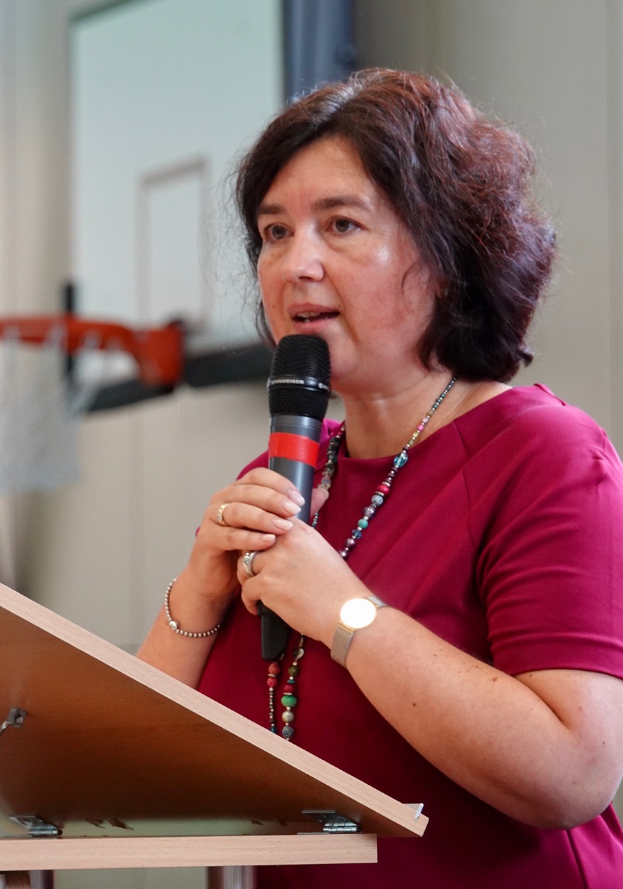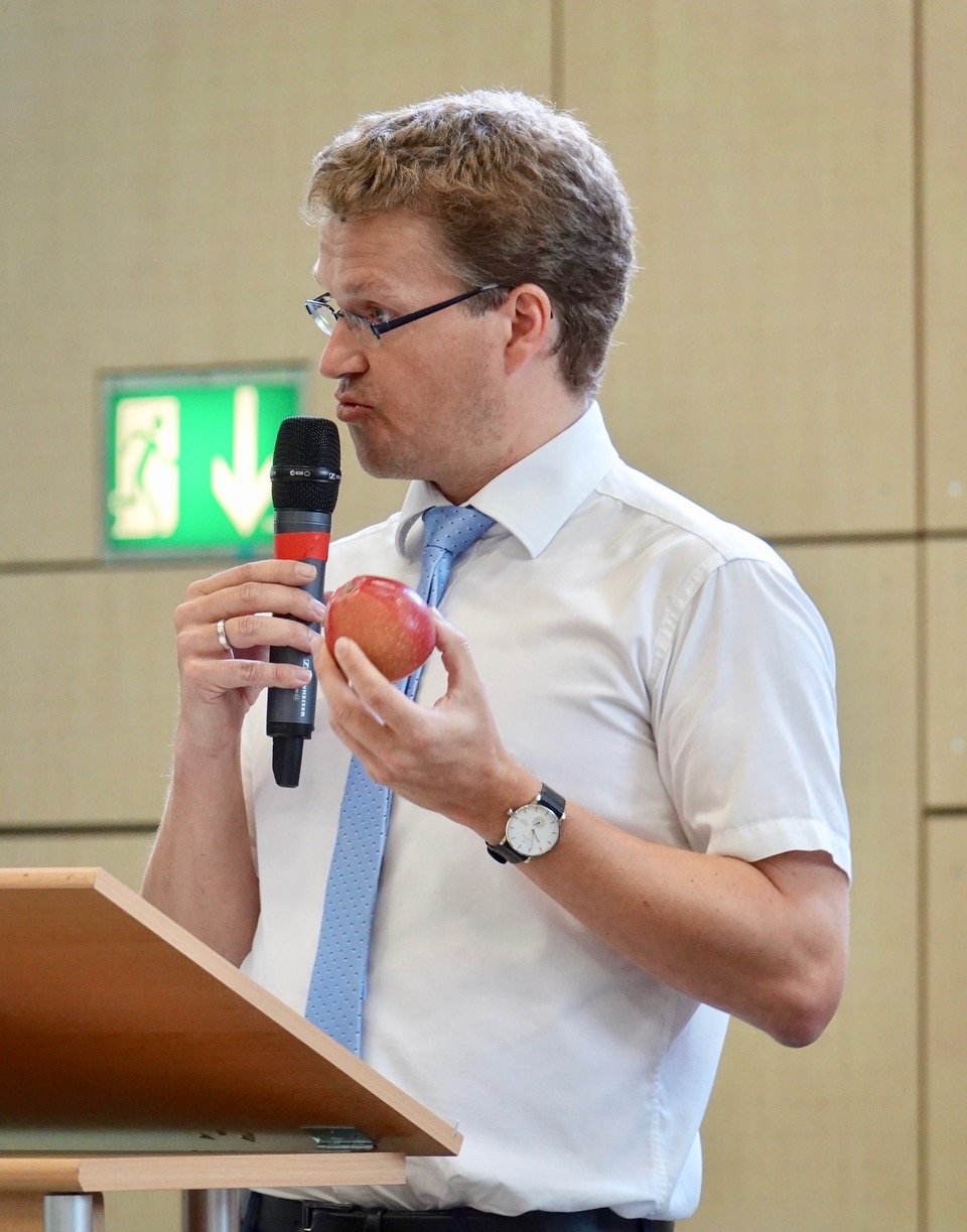 Erwartungsvolle Aufmerksamkeit herrschte dann in der Sporthalle des Taunusgymnasiums, als Christine Antony nach dem Gottesdienst schließlich alle neuen Schülerinnen und Schüler mit ihren Familien herzlich begrüßte. Die eigentliche Begrüßungsansprache freilich hielt der Schulleiter, Jochen Henkel, der die neuen Fünftklässler anhand zweier mitgebrachter Objekte – einem prachtvoll rotbackigen Apfel und einem besonders auf die Entfernung eher schlicht wirkenden Stück Schwarzbrot – mit einem anschaulichen Vergleich in die Welt gymnasialen Lernens einführte. Hier also der Apfel, in den man – weil man sich vielleicht erfrischen möchte oder einfach nur Appetit darauf hat – mit Genuss hineinbeißt, dort das Schwarzbrot, das überhaupt erst zu schmecken beginnt, nachdem man eine Zeitlang darauf herumgekaut hat. Im Kern ging es also um die Unterscheidung zwischen (kurzlebigem) Spaß am leicht verdaulichen Häppchen und (nachhaltiger) Freude am vielleicht auch mit einer gewissen Mühe Erreichten. Einige witzig in Szene gesetzte Motive aus Märchen trugen dazu bei, die Aufnahmefeier humorvoll und abwechslungsreich zu gestalten.