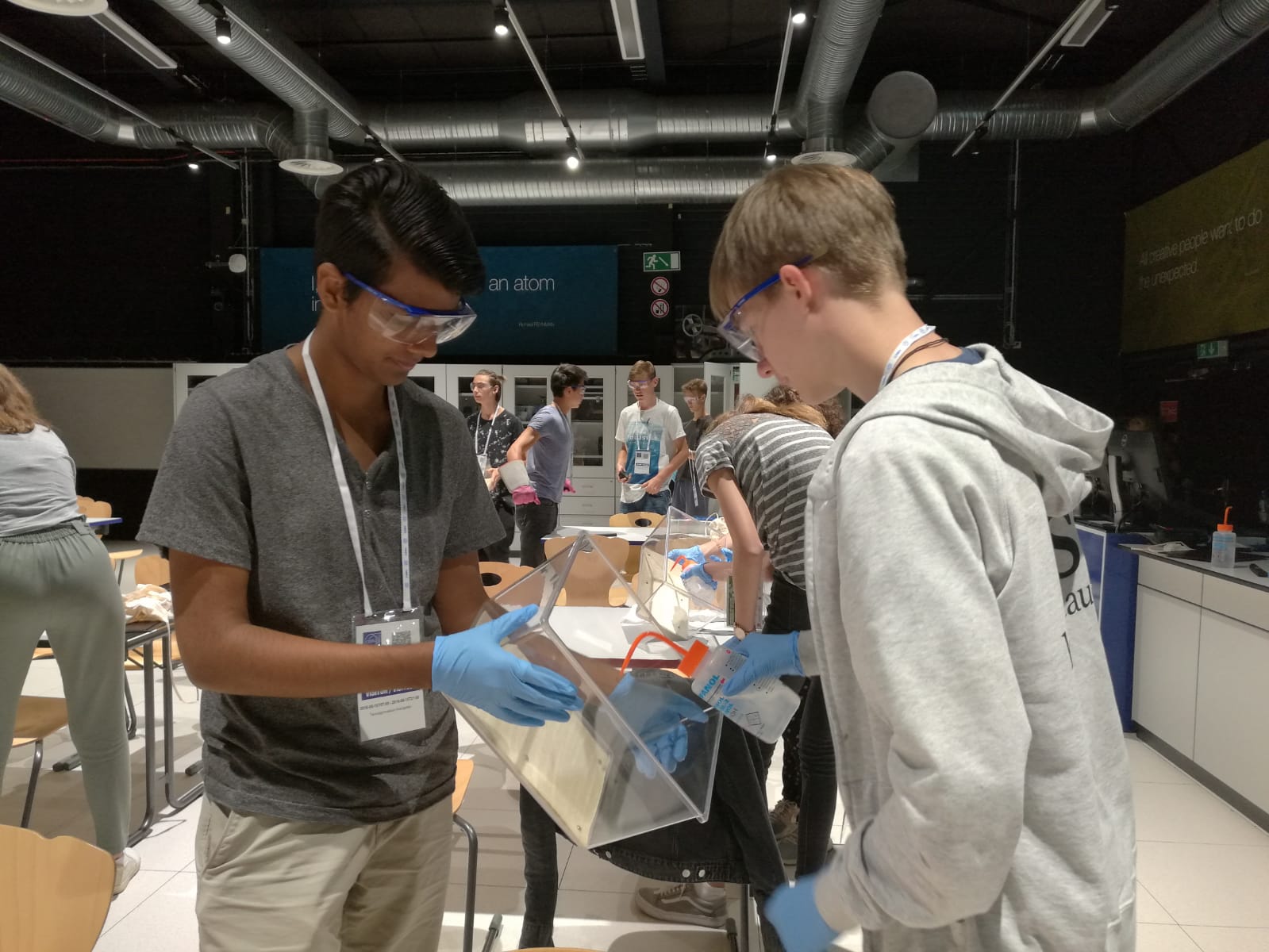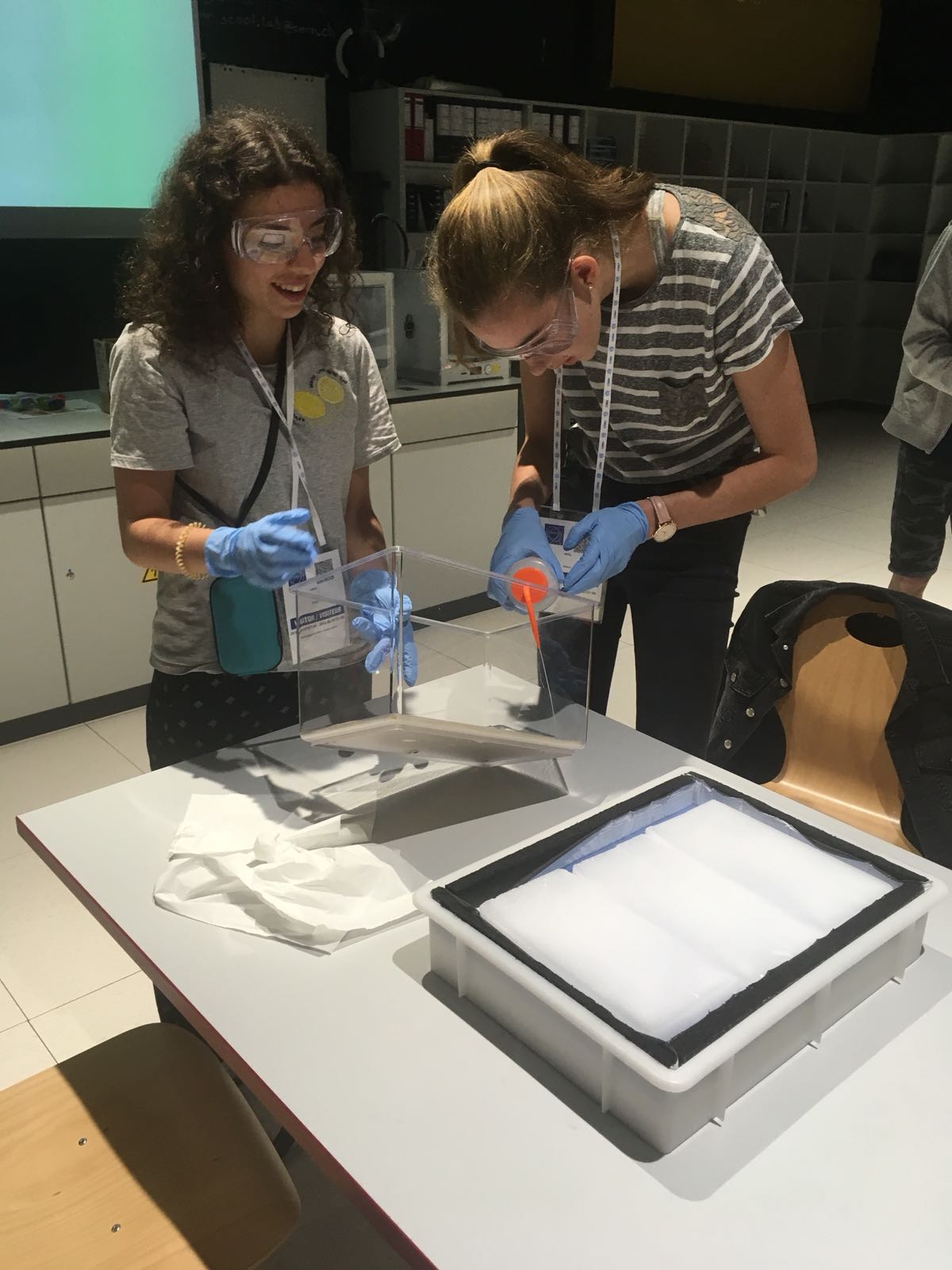 Vor der eigentlichen Führung nahmen wir im sogenannten „S’Cool LAB“ des CERN an der Umfrage einer Studie teil (Thema der Studie: „Auf der Suche nach besseren Modellen zur Darstellung des komplexen Aufbaus eines Atoms“). Danach bauten wir unter Anleitung einer freundlichen Mitarbeiterin Nebelkammern: Hierbei wird Trockeneis vorsichtig in eine Schale gelegt und mit einer Platte abgedeckt, auf die man abschließend ein mit Alkohol getränktes Aquarium stellt. Aufgrund der entstehenden Temperaturdifferenz ∆T= 100 Kelvin zwischen Raumtemperatur (20°C) und Trockeneis (-80°C) bildet sich durch Kondensation ein Nebel, der fadenähnliche Spuren von α- und β-Teilchen, die sich in der Luft befinden, sichtbar macht. Auf dieses faszinierende Experiment und eine anschließende Mittagspause folgte eine dreieinhalbstündige Führung durch das CERN, bei der uns bewusst wurde, wie komplex die Strukturen eines Atoms eigentlich sind. Die Grundlage zu einer besseren Vorstellung des Aufbaus eines Atoms sind verständliche und gleichzeitig möglichst realitätsgetreue Modelle. Deren Entwicklung und Verbesserung, welche schließlich Thema der im „S’Cool LAB“ durchgeführten Studie ist, ist demnach sehr sinnvoll.
