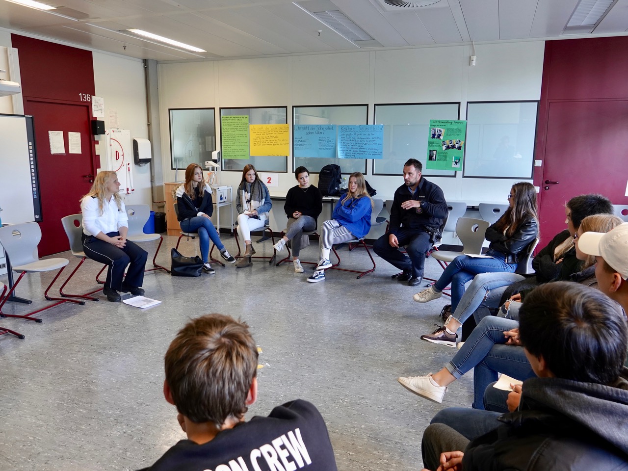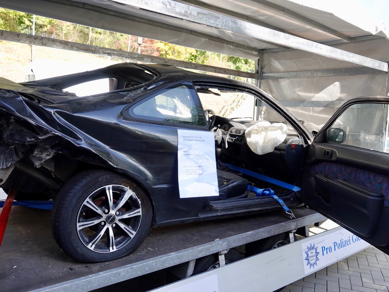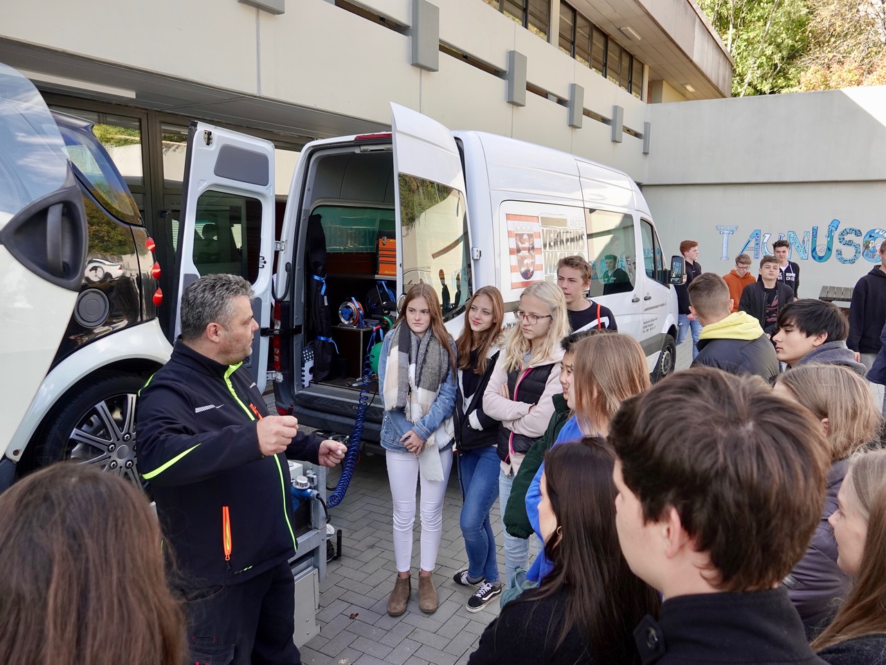 Nach einer allgemeinen Einführung für die gesamte Jahrgangsstufe mit Frau Klaus und Herrn Neumeister von der Hessischen Polizei besuchten die Schülerinnen und Schüler in Gruppen einzelne Stationen: Etwa den Rauschbrillenparcours, eine Trunkenheitssimulation mit eigens präparierten Brillen, die den Schülern sehr schnell deutlich machte, wie schnell man die Kontrolle über sicher geglaubte Fähigkeiten verlieren kann. Im Überschlagssimulator lernten die Schüler, sich aus einem Fahrzeug zu befreien, das bei einem Unfall auf dem Dach landete. Bei der Aufprallsimulation saßen die jungen Leute – angeschnallt – in einem von Herrn Fischer und seinen Kollegen von der Landesverkehrswacht präparierten Smart, der auf einem Gurtschlitten mit einer Geschwindigkeit von etwa 10 Stundenkilometern schlagartig zum Stehen gebracht wurde. Die kläglichen Reste eines Unfallwagens gleich daneben demonstrierten eindrücklich, wie es aussehen kann, wenn es mit höheren Geschwindigkeiten zum Crash kommt. Weiter ging es mit Sofortmaßnahmen am Unfallort, die Jörg Libbert vom Deutschen Roten Kreuz an einem Dummy anschaulich demonstrierte. Auch die direkte Kommunikation mit Menschen, die Suchtproblematik am eigenen Leibe erfahren haben und nun anderen Betroffenen helfen, war an diesem Vormittag in Zusammenarbeit mit Prof. Dr. med. Krakow, Chefarzt an der Asklepios Klinik Falkenstein und der Gruppe „Die Fleckenbühler“ möglich. Thema waren auch sogenannte „Booster“, mitunter amphetaminhaltige Präparate, die oft in Fitnessstudios angeboten werden und zu schweren gesundheitlichen Schädigungen führen können.