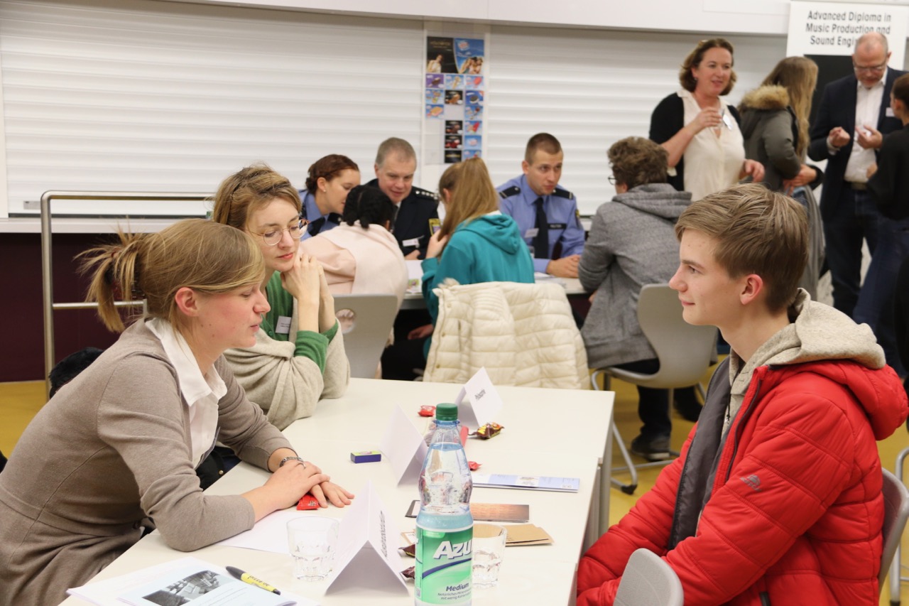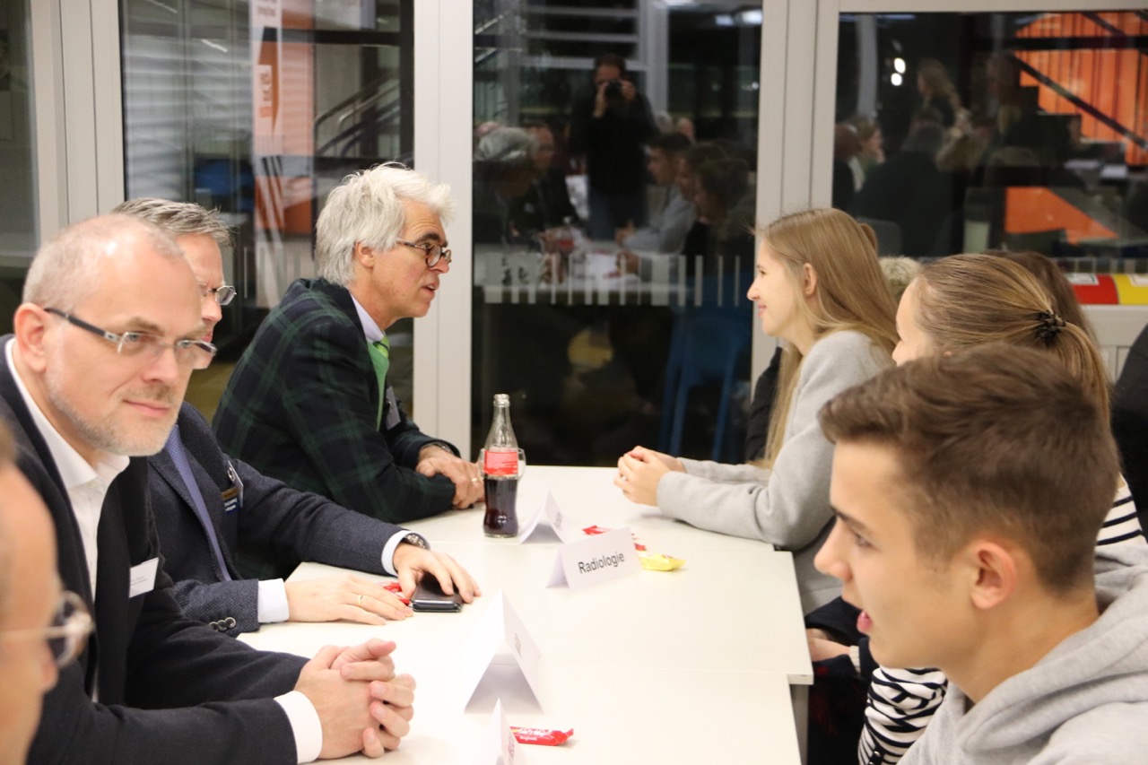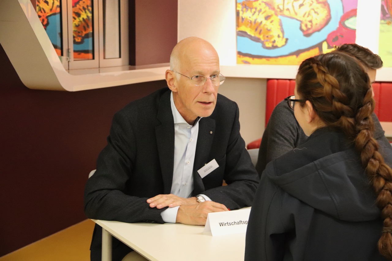 Vom Bauingenieurwesen über Corporate Finance, Elektrotechnik, Hotel/Gastronomie, IT, Jura, Luftfahrt, Medizin, Musikproduktion, Personalmanagement, Pharmaindustrie, Polizei, soziale Arbeit, Wirtschaft und Recht bis hin zur Zoologie reichte das Spektrum der vertretenen Branchen und Berufe. Dabei konnten die Schülerinnen und Schüler die Führungskräfte ganz ausgiebig befragen, denn eine Zeitbegrenzung für die Einzelgespräche an den Tischgruppen gab es nicht. Und viele Fragen zu stellen, dazu ermunterte Dirk Mälzer, beim Rotary Club zuständig für die Organisation des Berufsinformationstags, bei seiner Begrüßung die Schülerinnen und Schüler ganz explizit: „Es gibt keine dummen Fragen – schlechte Fragen sind nur die, die nicht gestellt werden.“ Alle Themen waren erlaubt, beispielsweise auch, wie es mit den Verdienstchancen innerhalb einer Branche aussieht.
