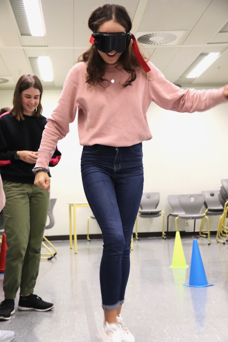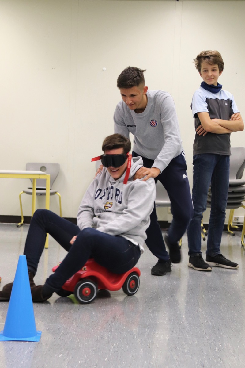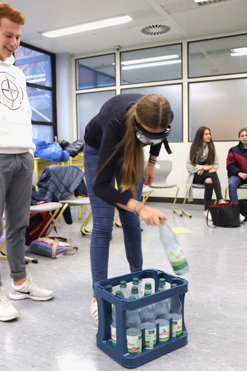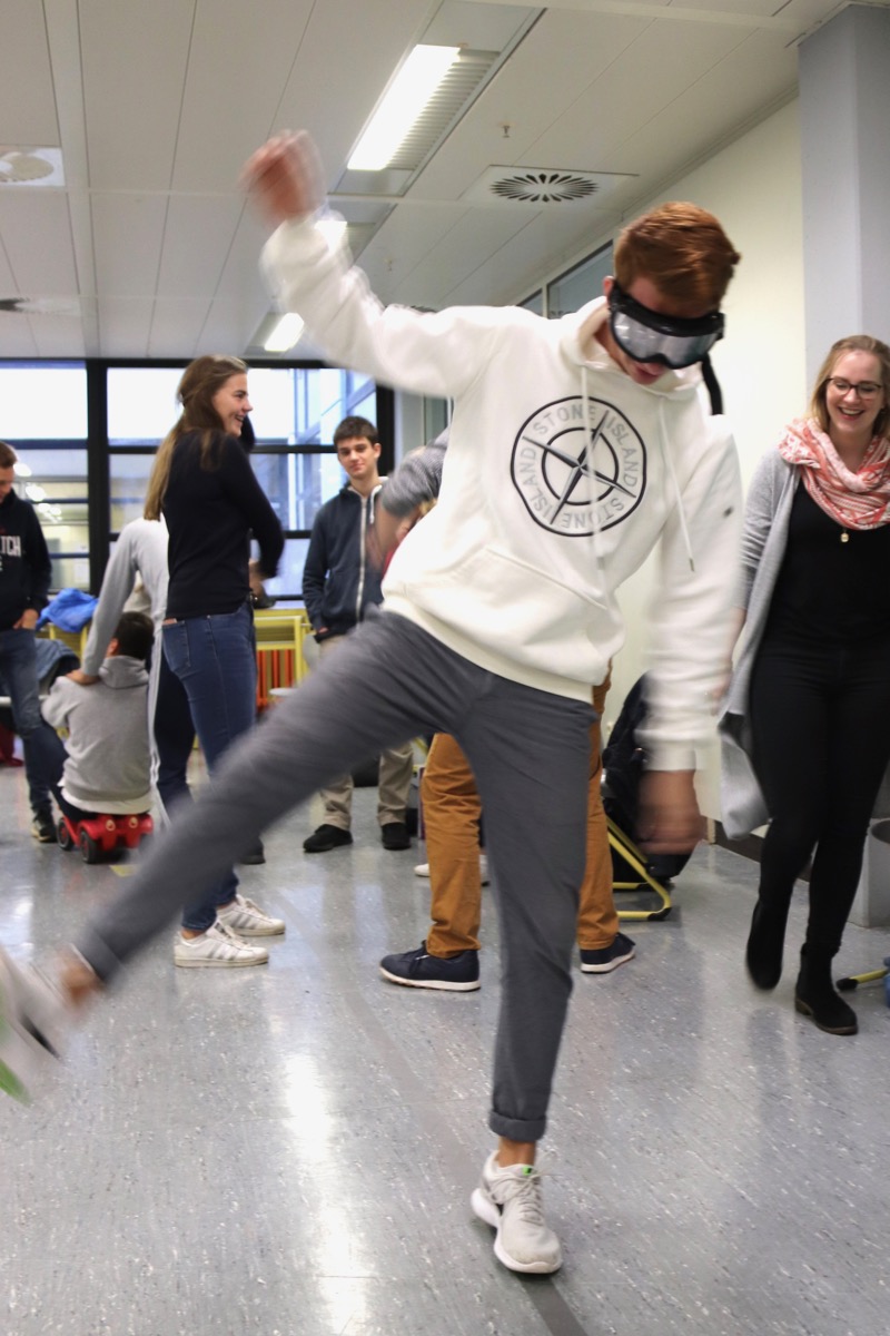 Die dritte Station, der Rauschbrillen-Parcours, war besonders herausfordernd: Mit speziellen Zerrbrillen ausgestattet, sollten die Schülerinnen und Schüler verschiedene Übungen absolvieren, bei denen es auf eine klare Sicht der Dinge ankommt, etwa das Werfen eines Balls in einen Eimer, das Steuern eines Bobbycars durch einen Slalom-Parcours oder das Balancieren auf einer Linie. Wie unbeholfen sich manch einer dabei anstellte, das sorgte für einige Heiterkeit – aber die Erkenntnis daraus machte wie erwartet nachdenklich, sollten durch die Rauschbrillen doch die durch Drogen benebelten Sinne simuliert werden.