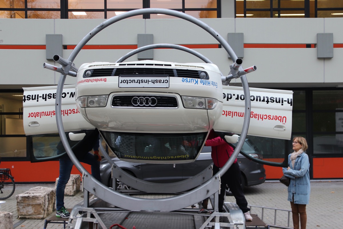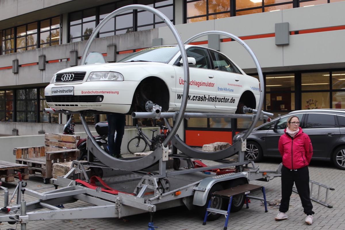 Nach einer allgemeinen Einführung von Frau Klaus (Hessische Polizei) im Theaterraum verteilten sich die Schülerinnen und Schüler auf fünf abwechslungsreiche Stationen: So etwa am Überschlagsimulator, bei dem man unter Anleitung von Herrn Fischer und seinen Kollegen am eigenen Leib erfahren konnte, wie es sich in einem überschlagenen Auto sitzt, und wie man sich daraus befreien kann. An der zweiten Station wurden Sofortmaßnahmen am Unfallort von Herrn Libbert (DRK Königstein) demonstriert.