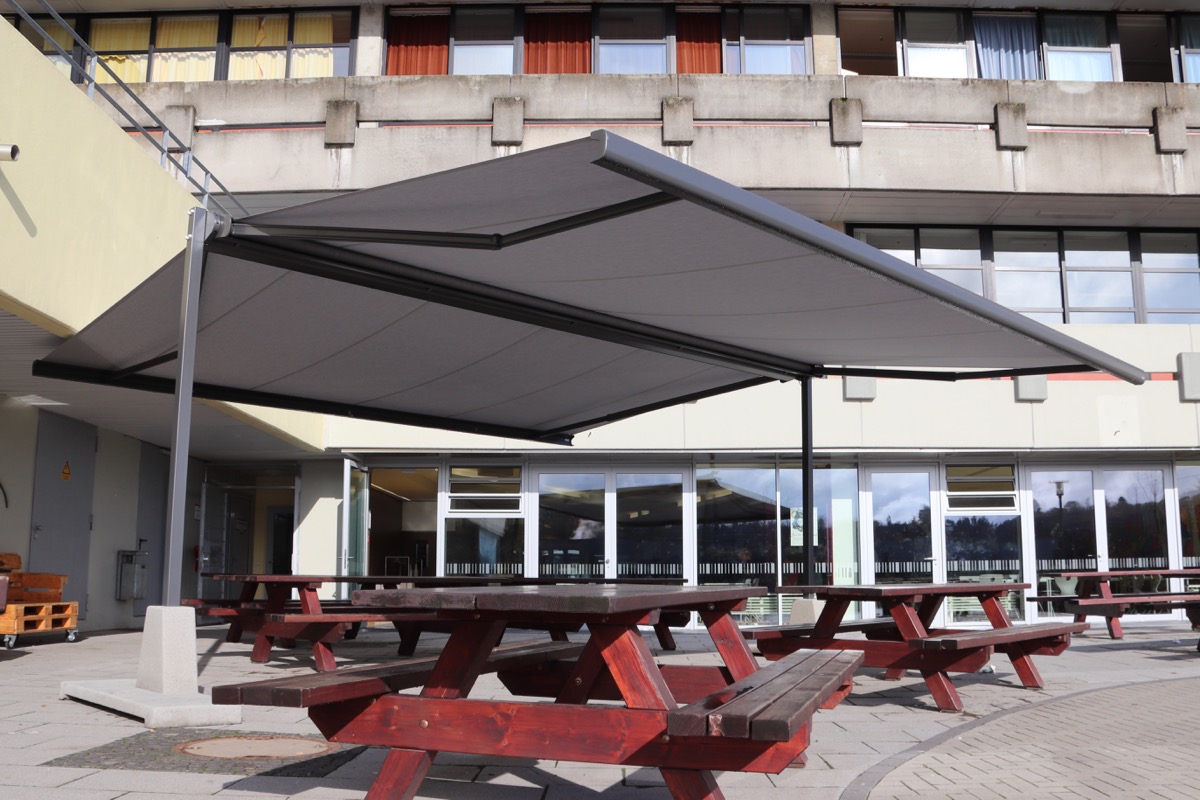 Dieser „brenzligen“ Situation schaffte das WoB nun Abhilfe: Aus den in der Cafeteria erwirtschafteten Überschüssen wurde eine elektronische Markisenanlage im Wert von 13.000 Euro gespendet. Sobald die Sonne scheint, fährt die Markise sensorgesteuert automatisch aus; bei trübem Wetter oder starkem Wind rollt sie sich selbstständig ein. Kürzlich wurde die Anlage im Außenbereich des WoB aufgebaut und spendet nun den Schülerinnen und Schülern in den Pausen Schatten.