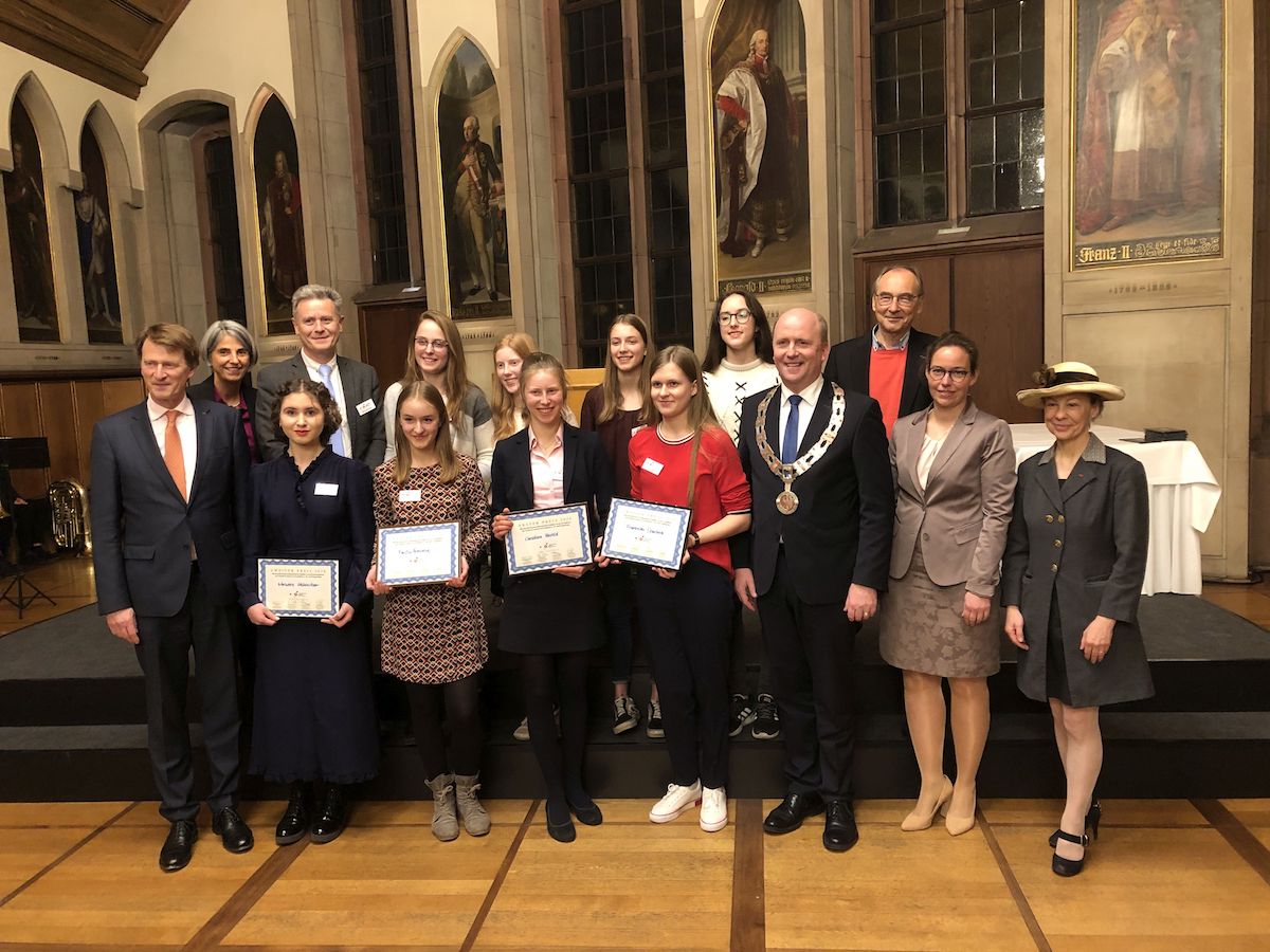 Zum Festakt anlässlich der Preisverleihung im Kaisersaal des Römers wurde die Schülerin am Abend von ihrem Vater, ihrem Französischlehrer, Herrn Reiniger, sowie vom Schulleiter des Taunusgymnasiums, Herrn Henkel, begleitet.