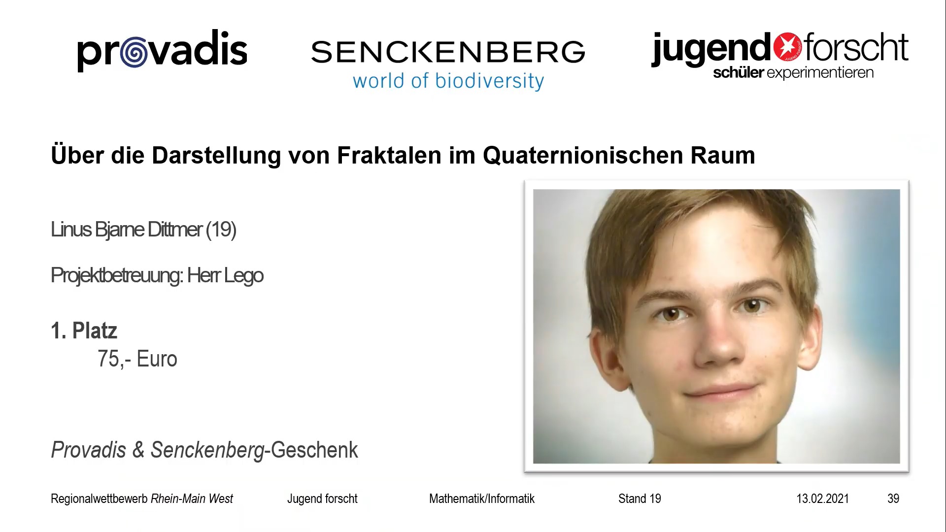 Linus Dittmer, der im letzten Jahr am Taunusgymnasium sehr erfolgreich sein Abitur ablegte, startete in diesem Jahr mit einem sehr interessanten Thema bei "jugend forscht" - "Über die Darstellung von Fraktalen im Quaternionischen Raum". Genau diese Arbeit war es auch, mit der er sich über ein Jahr lang beschäftigte, um diese dann als "Besondere Lernleistung" im fünften Prüfungsfach ins Abitur einzubringen.