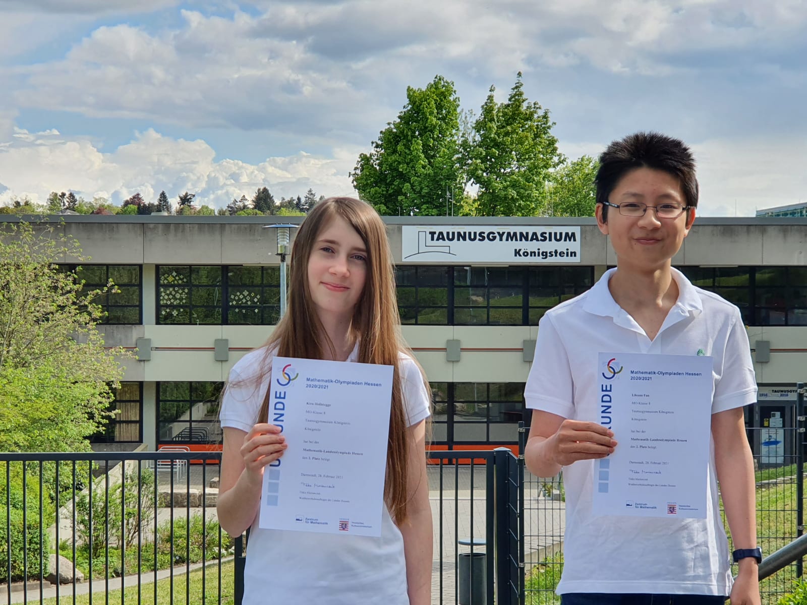 Kira Hollstegge (8a) und Likuan Fan (8g) haben am Taunusgymnasium Geschichte geschrieben. Erstmals haben mit Kira und Likuan gleich zwei Schüler*innen des Taunusgymnasiums das Bundesfinale der Mathematik-Olympiade erreicht. Aus den besten Teilnehmer*innen Hessens ab Jahrgangsstufe acht wählte eine Jury die 13 Kandidaten aus, die das Land Hessen bei der Bundesrunde der 60. Mathematik-Olympiade am 14. und 15. Juni in Berlin vertreten werden. Hessen gehörte in den vergangenen Jahren zu den stärksten Teams im Bundesentscheid. Umso höher ist es einzuschätzen, dass sich dieses Jahr mit Kira und Likuan gleich zwei Schüler*innen des Taunusgymnasiums zu den 13 besten Mathematiker*innen Hessens zählen dürfen. Johann Gaulke (E2), der im Sommer 2020 vom TGK auf die Internatsschule Hansenberg wechselte, erreichte zum 4. Mal in Folge den 2. Platz und darf zum 3. Mal in Folge ebenfalls beim Bundesfinale teilnehmen.