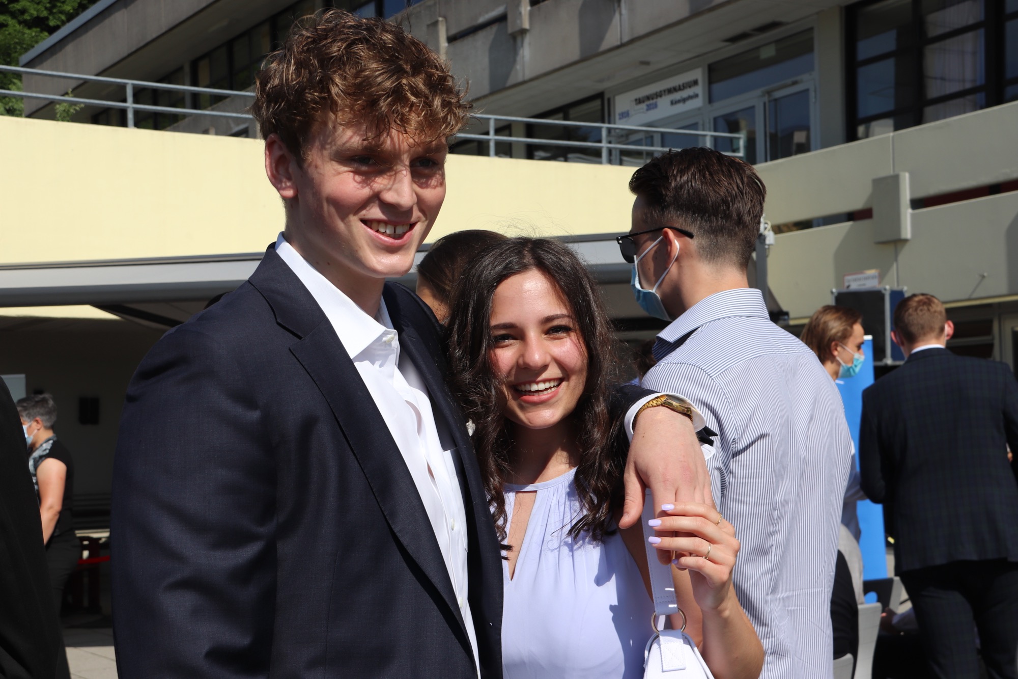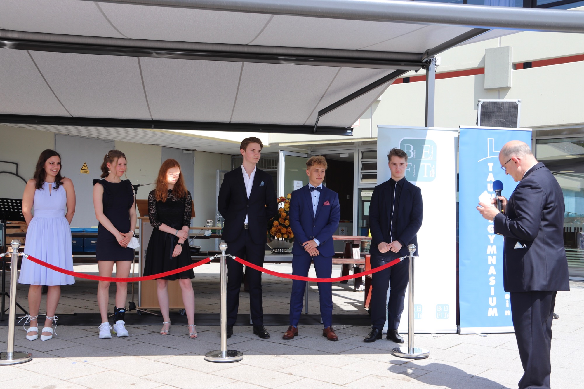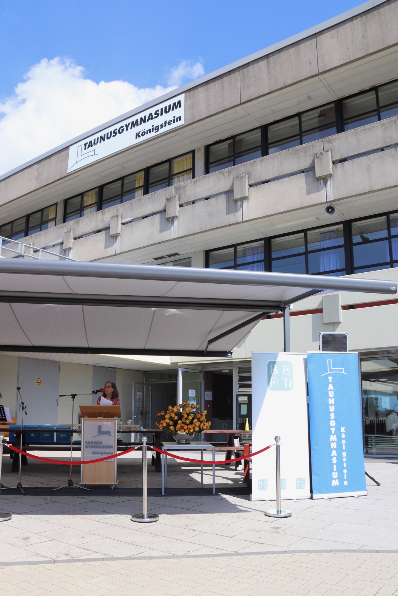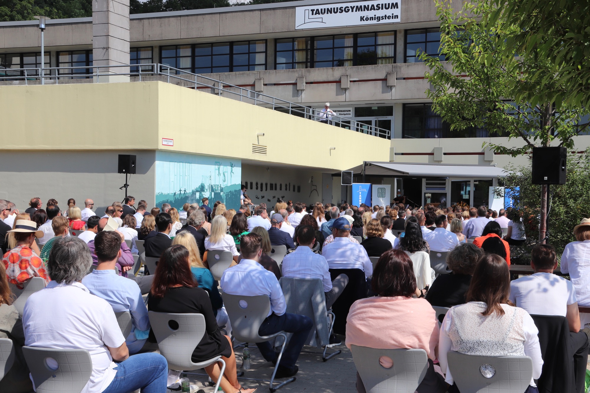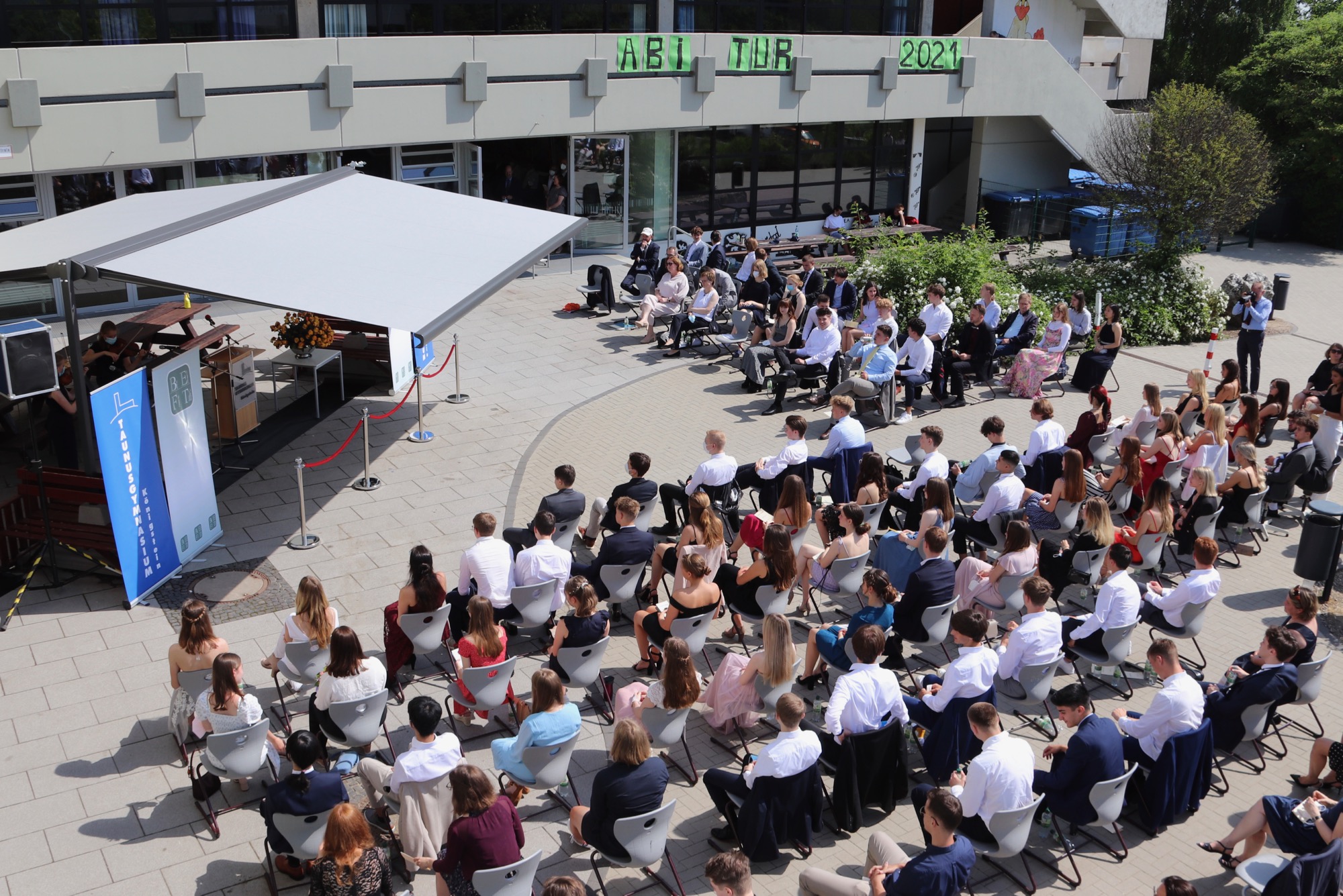 Aufgrund der pandemiebedingten Hygienevorschriften hatten Herr Veltjens, Studienleiter am Taunusgymnasium, und die Organisatorin Frau Kanert die traditionelle Akademische Feier ins Freie verlegt, in den Pausenhof vor der Cafeteria. Dort fanden sich zahlreiche elegant gekleidete Gäste ein – Abiturient*innen, ihre Eltern und eine Vielzahl von Lehrkräften, die die jungen Erwachsenen zum Teil seit deren Kindheit begleitet hatten. Mit dem nötigen Sicherheitsabstand saßen die Gäste über den Schulhof verteilt und genossen das Programm aus Grußworten, Geigenmusik und Ehrungen.