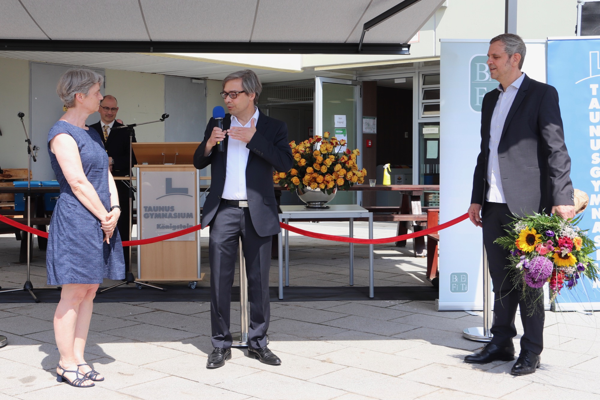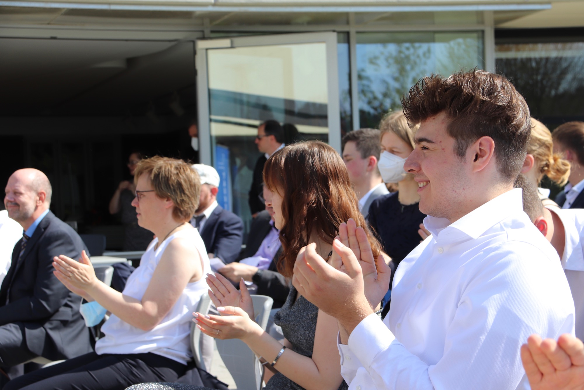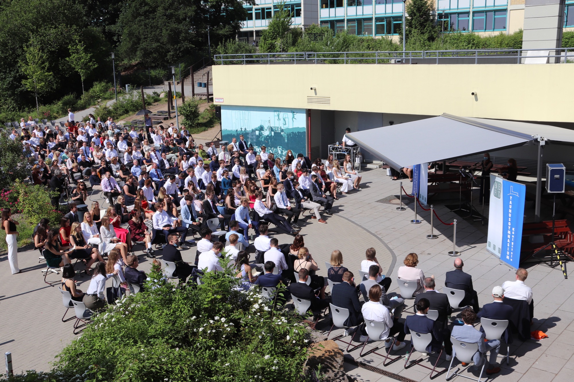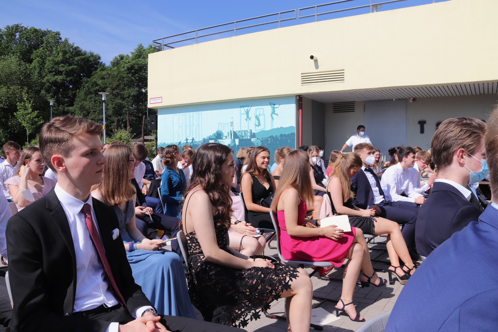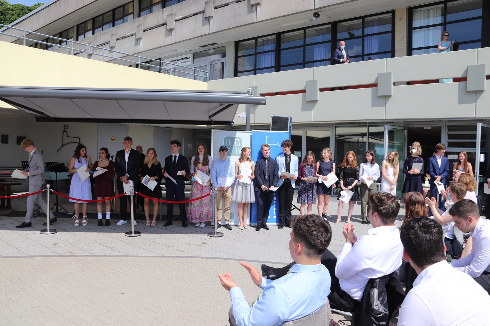 Aufgrund der pandemiebedingten Hygienevorschriften hatten Herr Veltjens, Studienleiter am Taunusgymnasium, und die Organisatorin Frau Kanert die traditionelle Akademische Feier ins Freie verlegt, in den Pausenhof vor der Cafeteria. Dort fanden sich zahlreiche elegant gekleidete Gäste ein – Abiturient*innen, ihre Eltern und eine Vielzahl von Lehrkräften, die die jungen Erwachsenen zum Teil seit deren Kindheit begleitet hatten. Mit dem nötigen Sicherheitsabstand saßen die Gäste über den Schulhof verteilt und genossen das Programm aus Grußworten, Geigenmusik und Ehrungen.