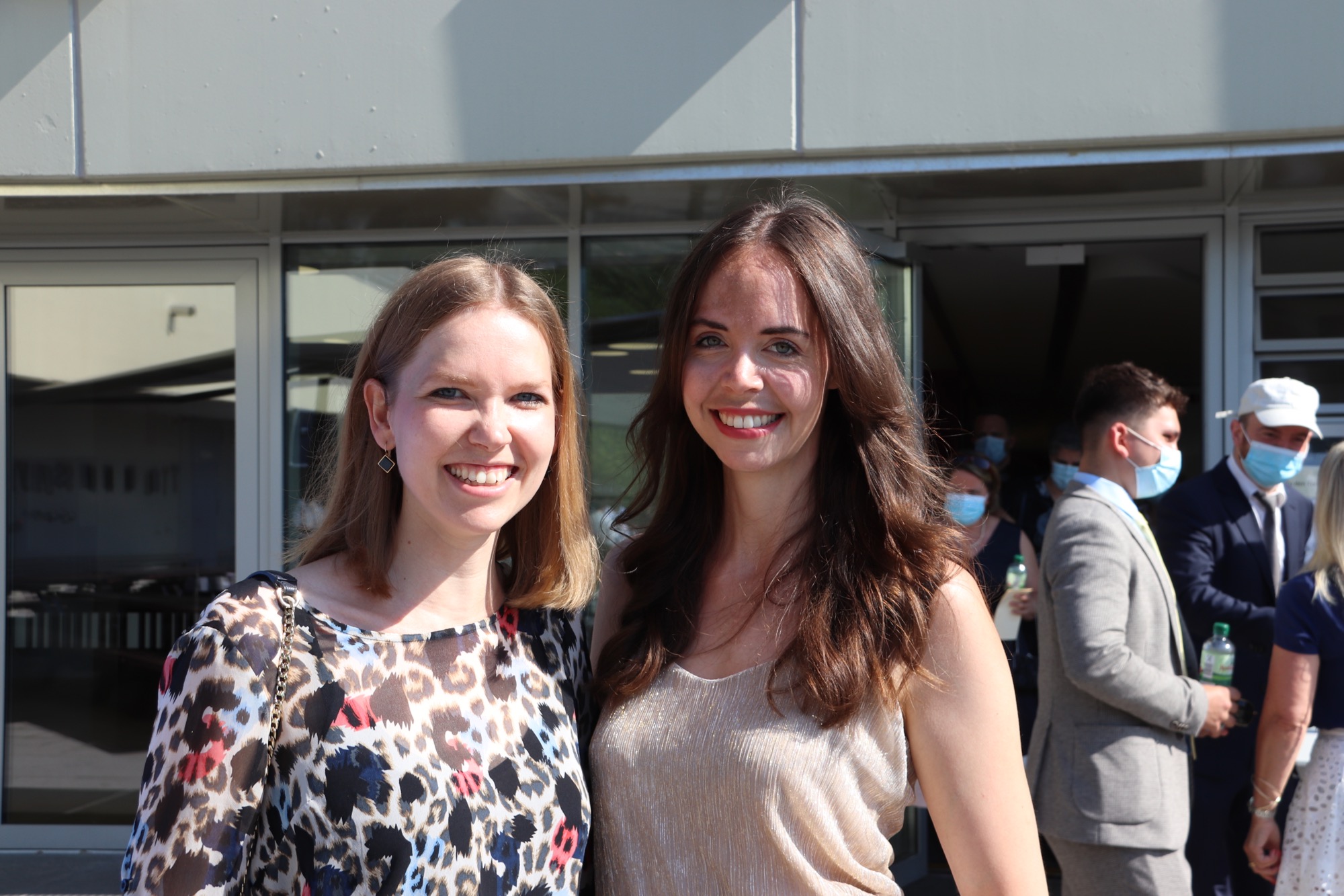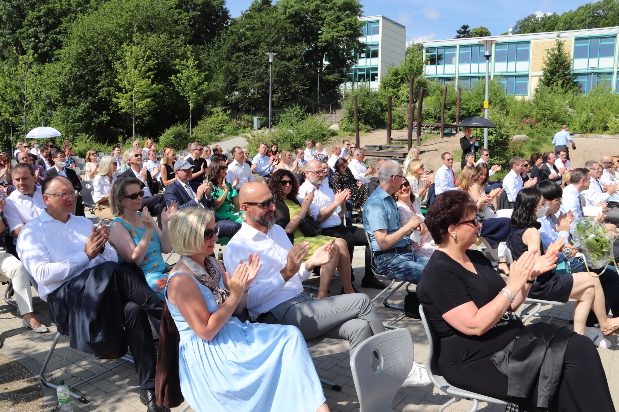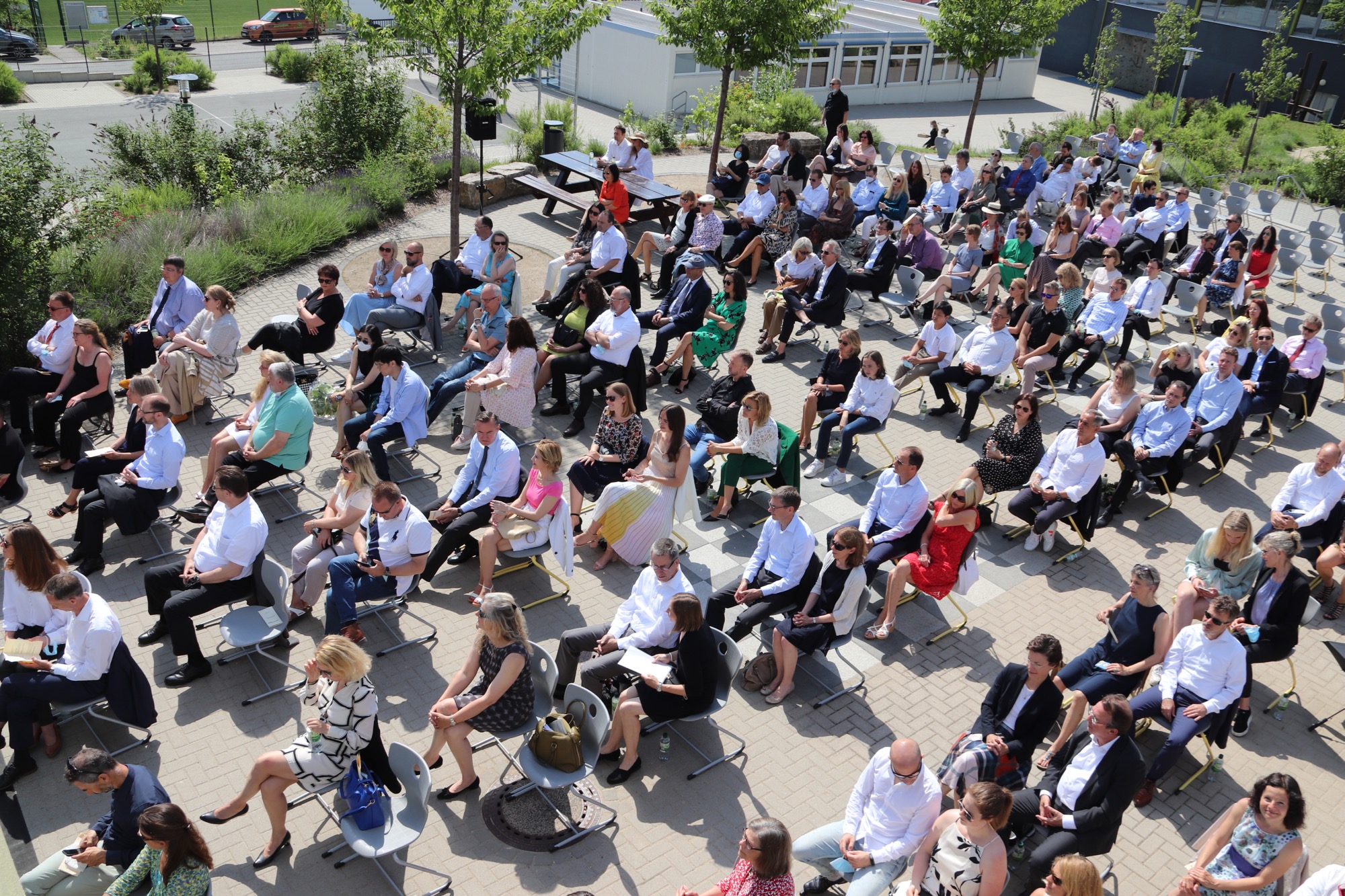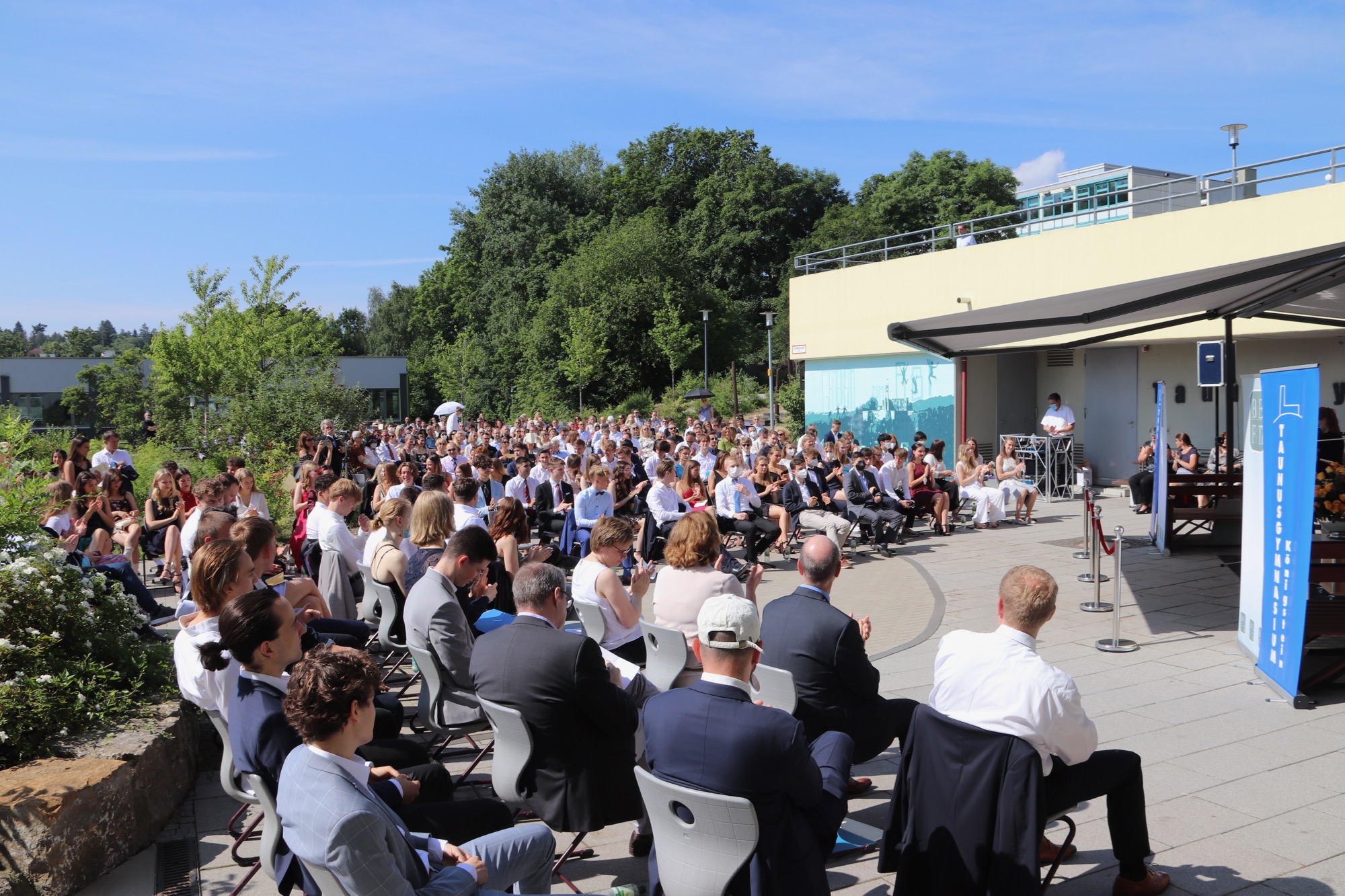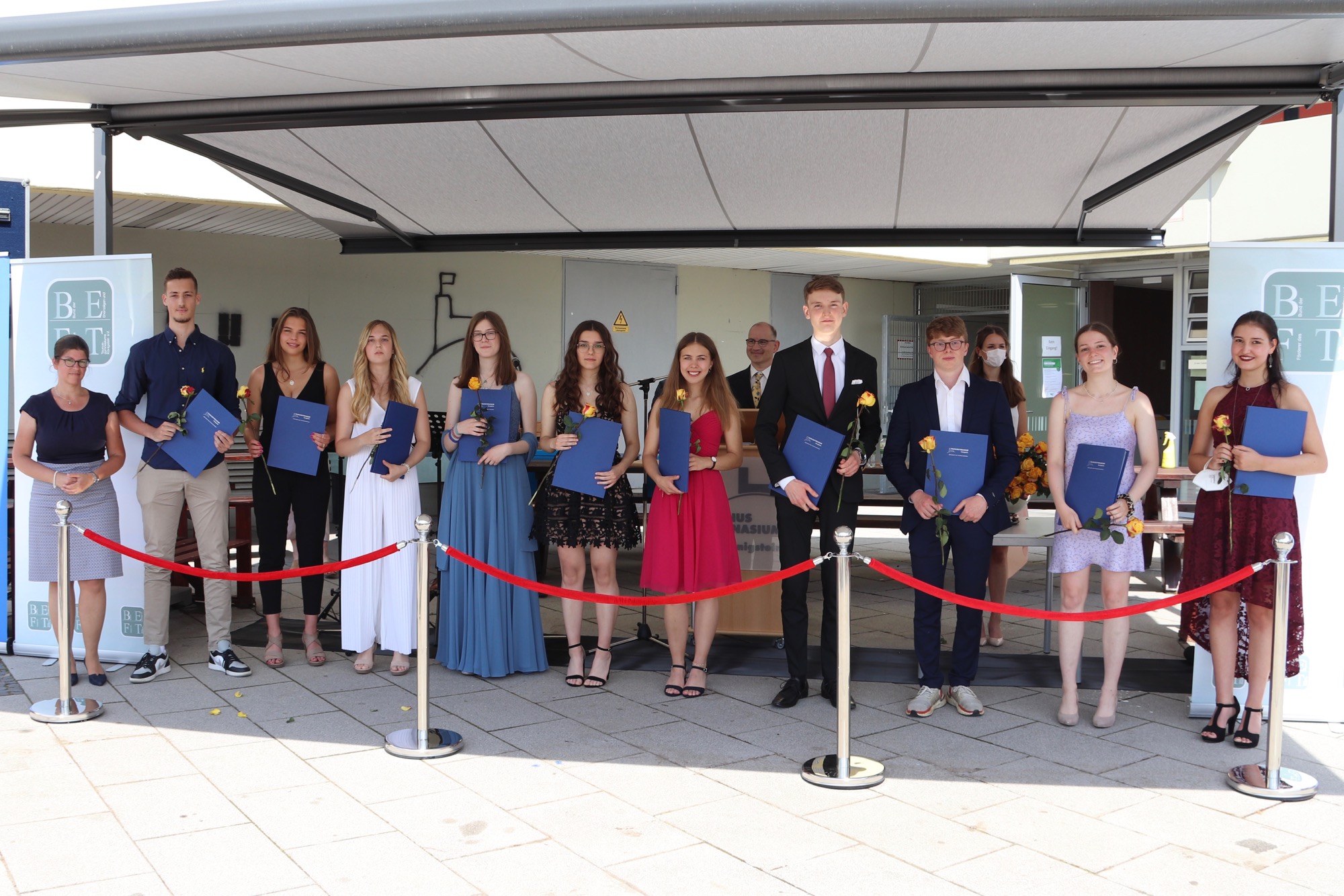Aufgrund der pandemiebedingten Hygienevorschriften hatten Herr Veltjens, Studienleiter am Taunusgymnasium, und die Organisatorin Frau Kanert die traditionelle Akademische Feier ins Freie verlegt, in den Pausenhof vor der Cafeteria. Dort fanden sich zahlreiche elegant gekleidete Gäste ein – Abiturient*innen, ihre Eltern und eine Vielzahl von Lehrkräften, die die jungen Erwachsenen zum Teil seit deren Kindheit begleitet hatten. Mit dem nötigen Sicherheitsabstand saßen die Gäste über den Schulhof verteilt und genossen das Programm aus Grußworten, Geigenmusik und Ehrungen.
