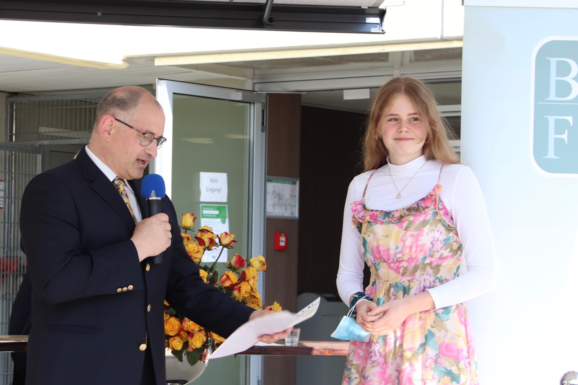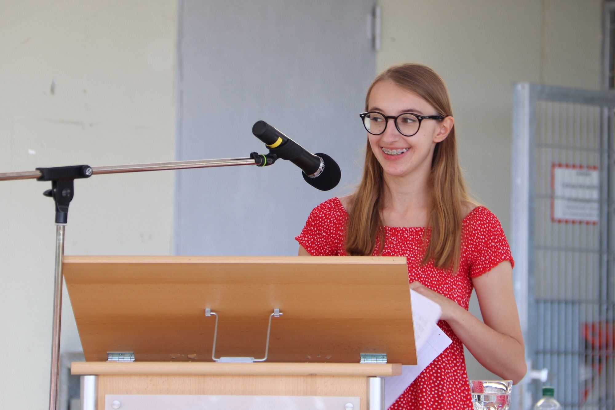 In ihrer Rede von Seiten der Abiturient*innen ging Lucia Drosdowski auf die besonders wichtige Rolle von Freundschaften im Schulleben ein: „Schule bedeutet auch, Freundschaften zu schließen, die manchmal für ein ganzes Leben geschaffen sind“. Freunde, die einen motivierten, mit denen man lachen konnte, die einen nach Misserfolgen wieder aufbauten – diese Freunde nicht mehr jeden Tag zu sehen, werde ungewohnt und schmerzhaft sein. Sie dankte auch den Eltern für ihre Unterstützung, nicht zuletzt auch für das Kochen des Lieblingsessens nach der Schule. Sie betonte die bereichernde Vielfalt innerhalb des Jahrgangs; jeder habe individuelle Ziele, aber eines hätten sie alle gemeinsam: „Wir haben nicht aufgegeben in dieser schweren Zeit, wir haben nicht aufgehört zu träumen und nach unserem Glück zu streben. Und wenn wir gefallen sind, dann sind wir alle gemeinsam wieder aufgestanden.“