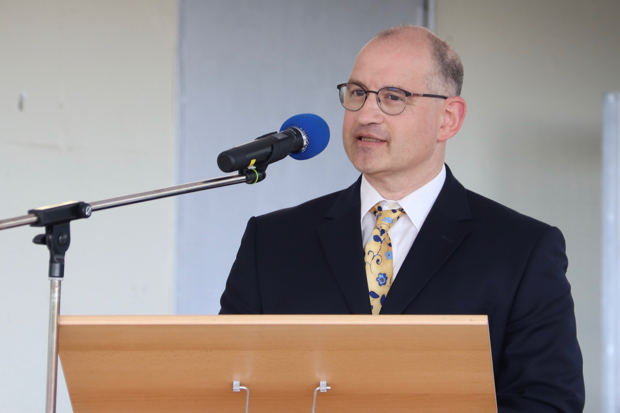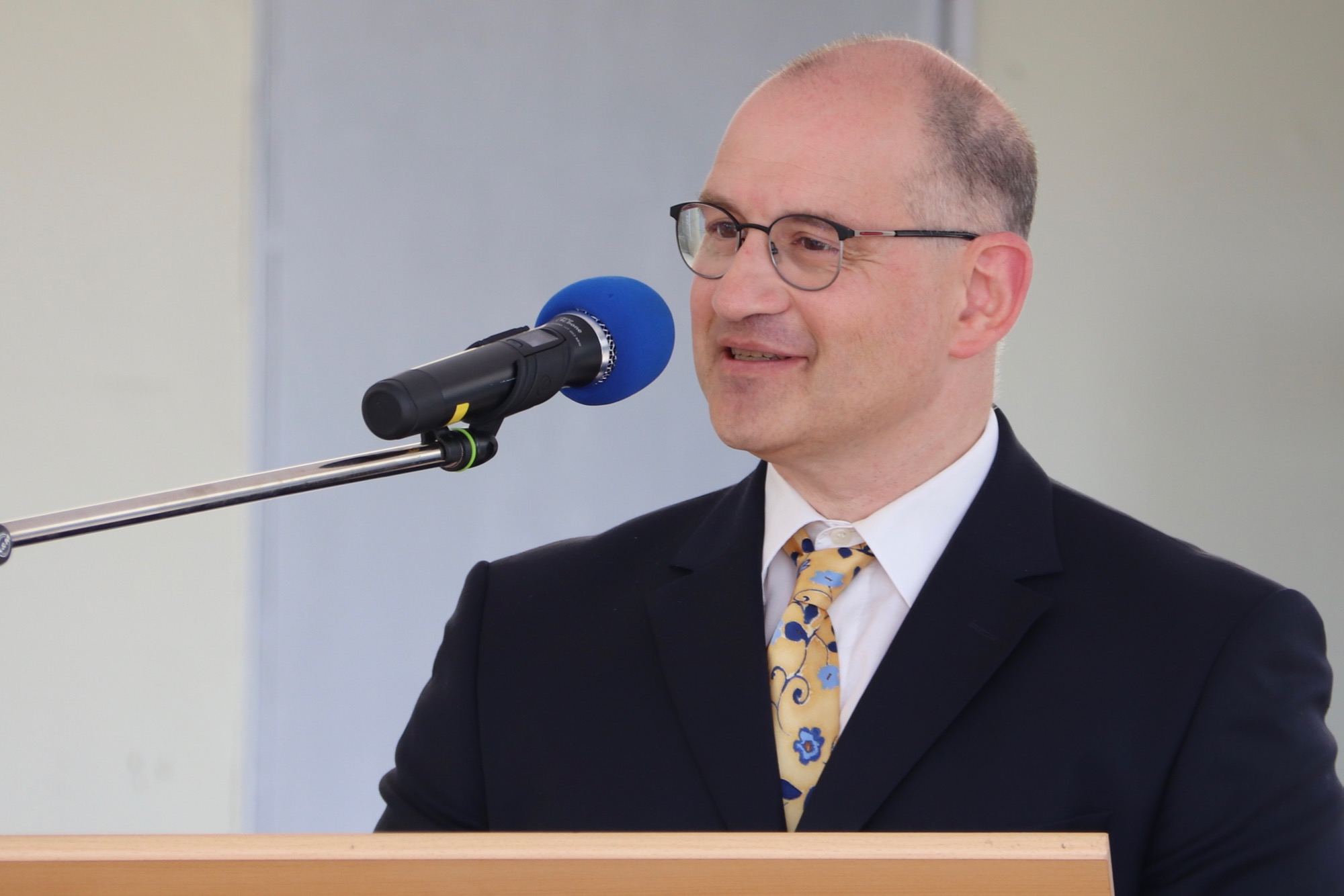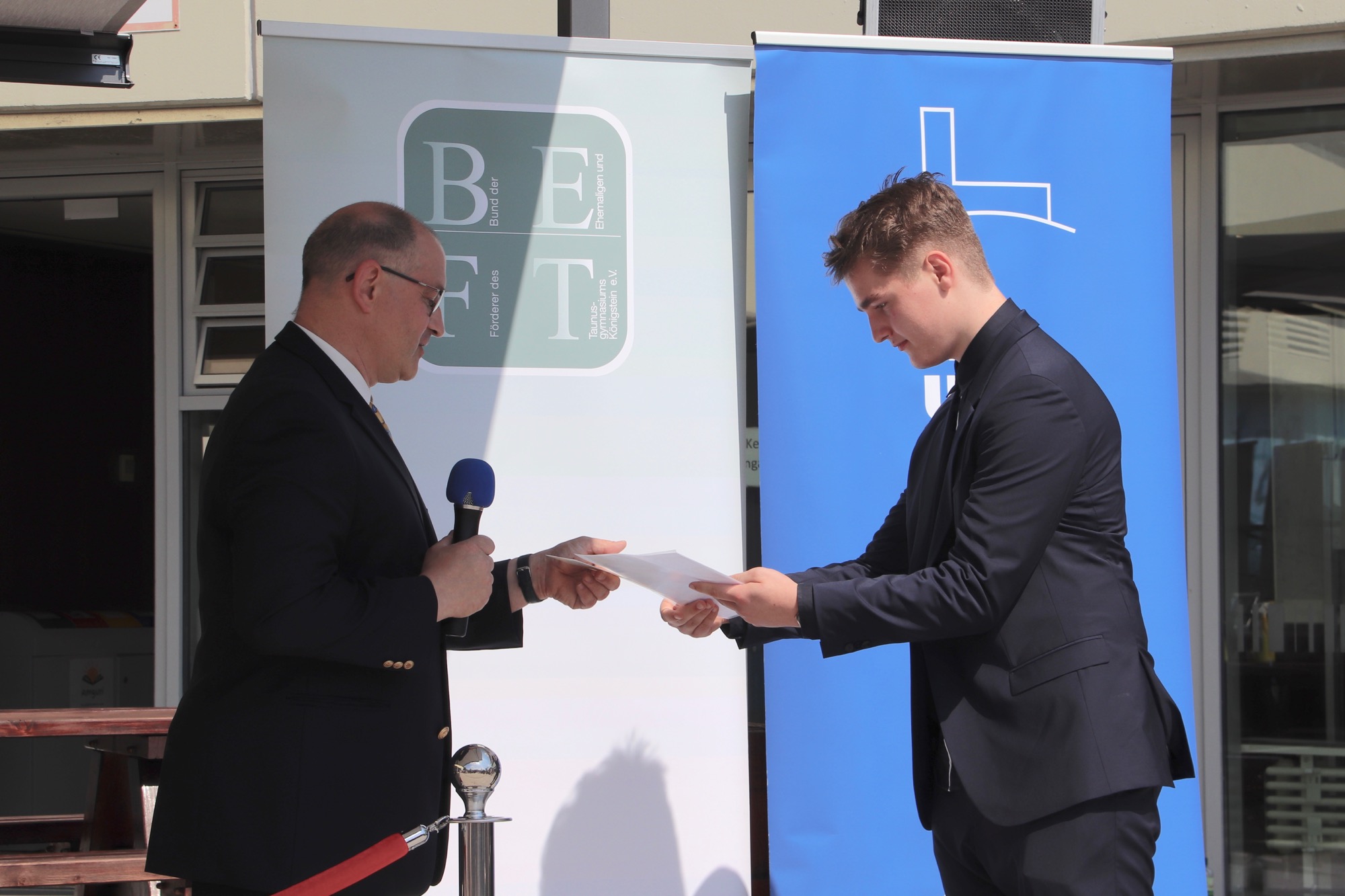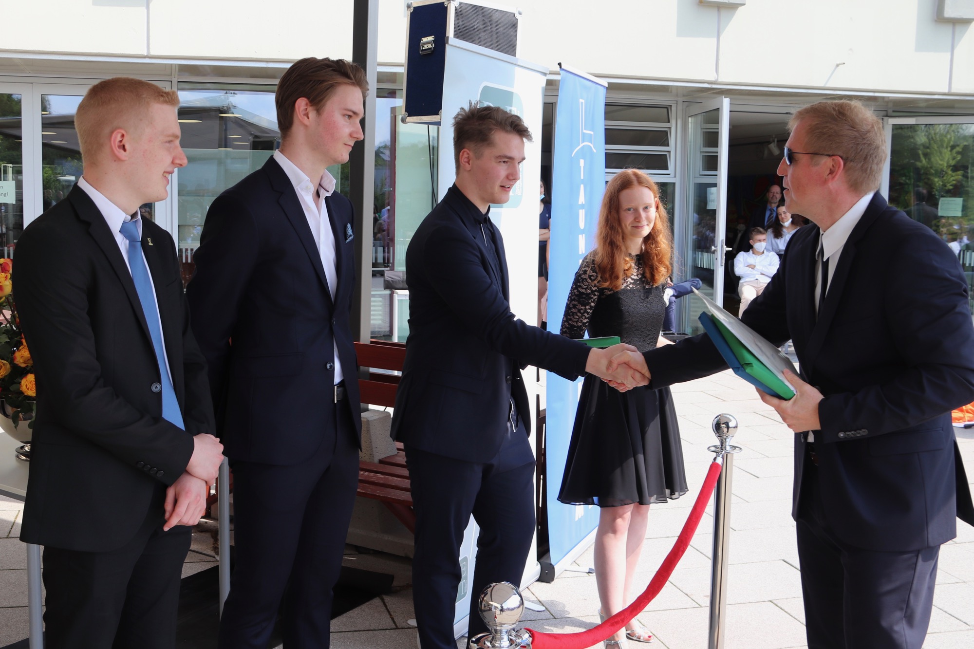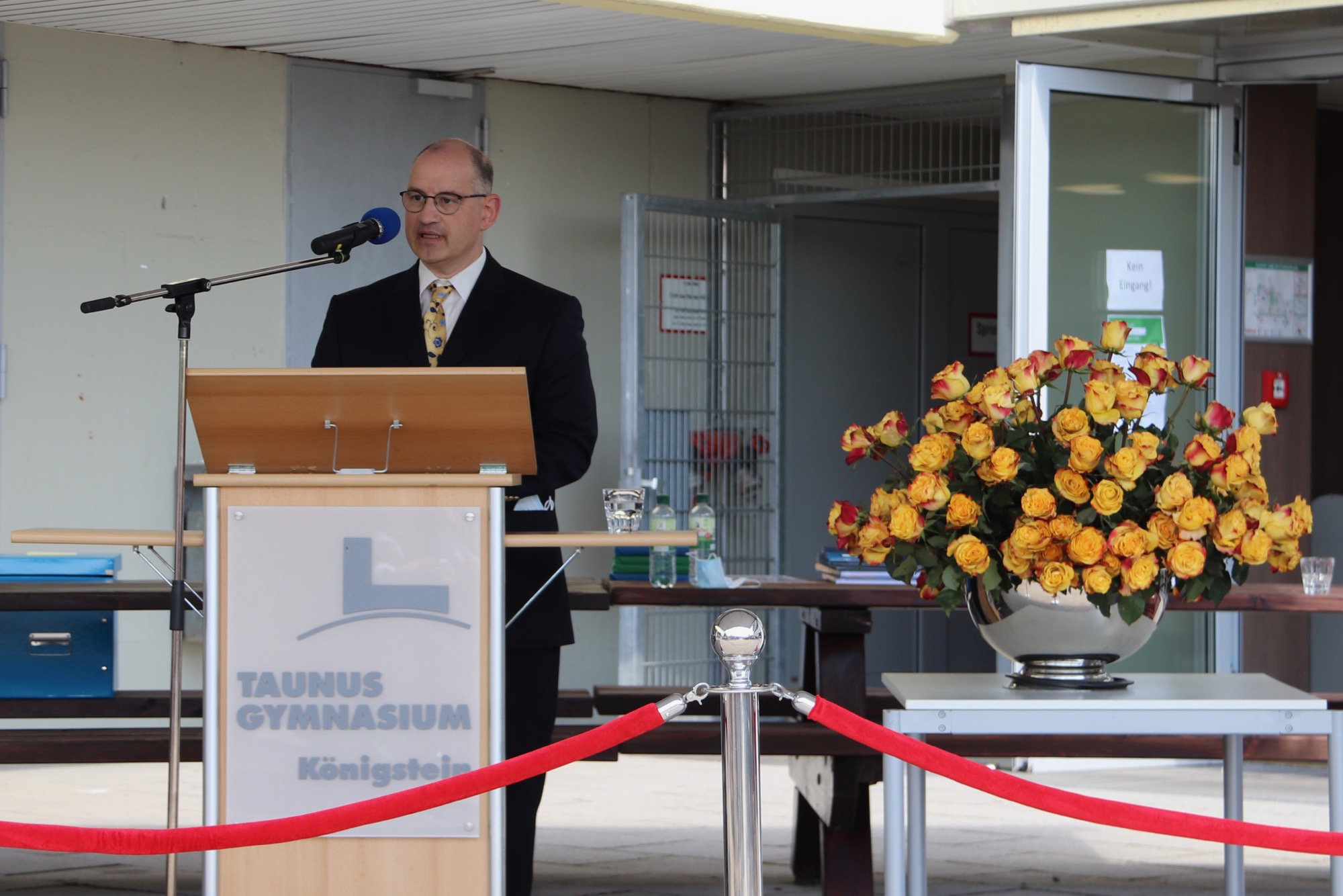 Herr Klempert, Vertreter des Fördervereins der Ehemaligen und Förderer des Taunusgymnasiums (BEFT), blickte in seinem Grußwort auf seinen eigenen Werdegang zurück. Nach seinem Abitur am Taunusgymnasium habe er zunächst kein großes Ziel gehabt, aber in den folgenden Jahrzehnten habe er seinen Weg gefunden und dabei festgestellt, dass sich die Schulzeit im Nachhinein als sinnvoll erwiesen habe: „Wie prägend diese Zeit war, kann man erst in der Rückschau richtig ermessen.“ So stellten sich bei ihm schulische Erfahrungen aus Informatik, Schülervertretung und Deutsch erst 15 Jahre später bei seiner Mitarbeit an der Internet-Plattform Wikipedia als richtungsweisende Erfahrungen heraus. Er betonte wie Frau Herbst die Wichtigkeit des flexiblen Umgangs mit Unerwartetem – in der Berufswelt „Agilität“ genannt. Sein Fazit: Wenn die Abiturient*innen jetzt noch keine Ziele vor Augen hätten, sei dies kein Grund zur Beunruhigung, da die Zeit alles weisen werde.