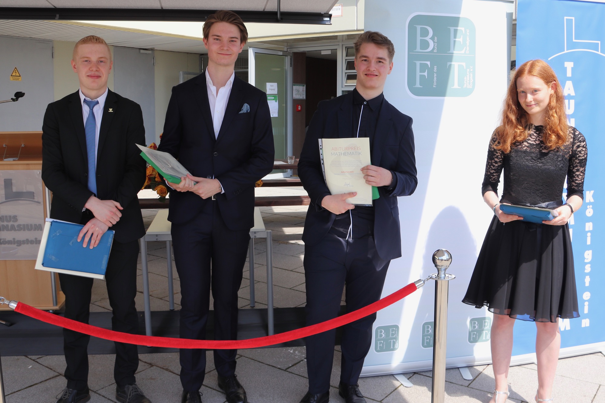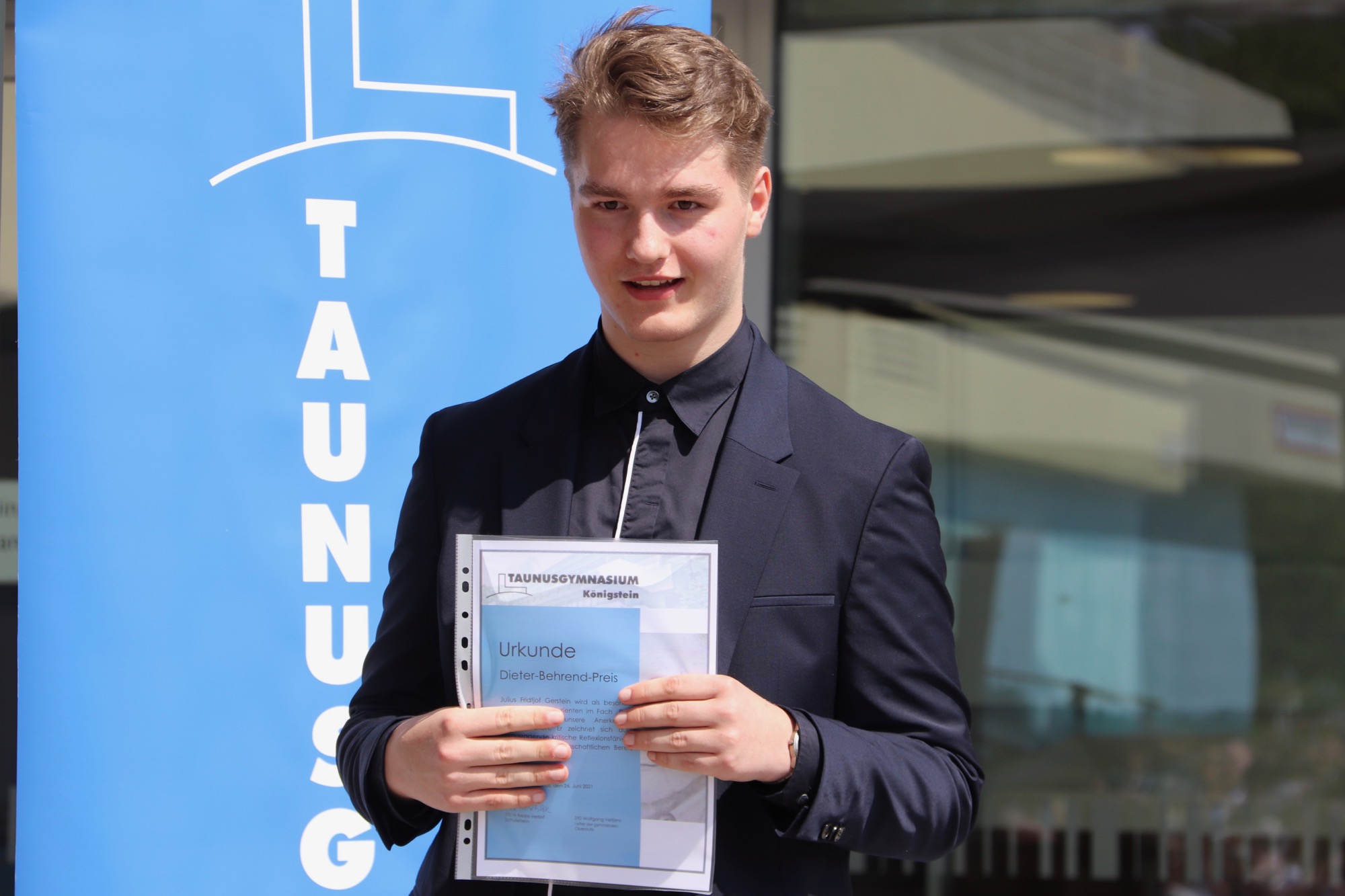 Der Preis der Deutschen Gesellschaft für Philosophie ging an Johanna Grabe, die jahrgangsbeste Abiturientin im Fach Ethik. Als MINT-Schule ist das Taunusgymnasium stolz auf seine herausragenden Schüler*innen in den Naturwissenschaften. Und so wurden zahlreiche besonders begabte Abiturient*innen ausgezeichnet – mit dem Preis der Gesellschaft deutscher Chemiker, dem Preis der Deutschen Physikalischen Gesellschaft, dem Preis der Deutschen Mathematischen Vereinigung sowie dem Erdkunde-Preis.