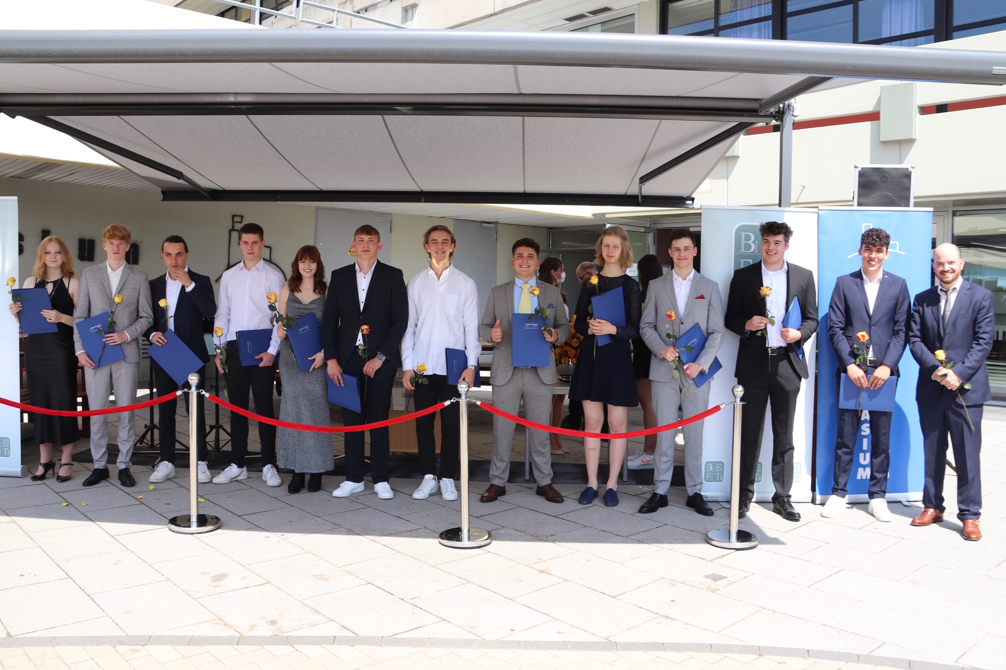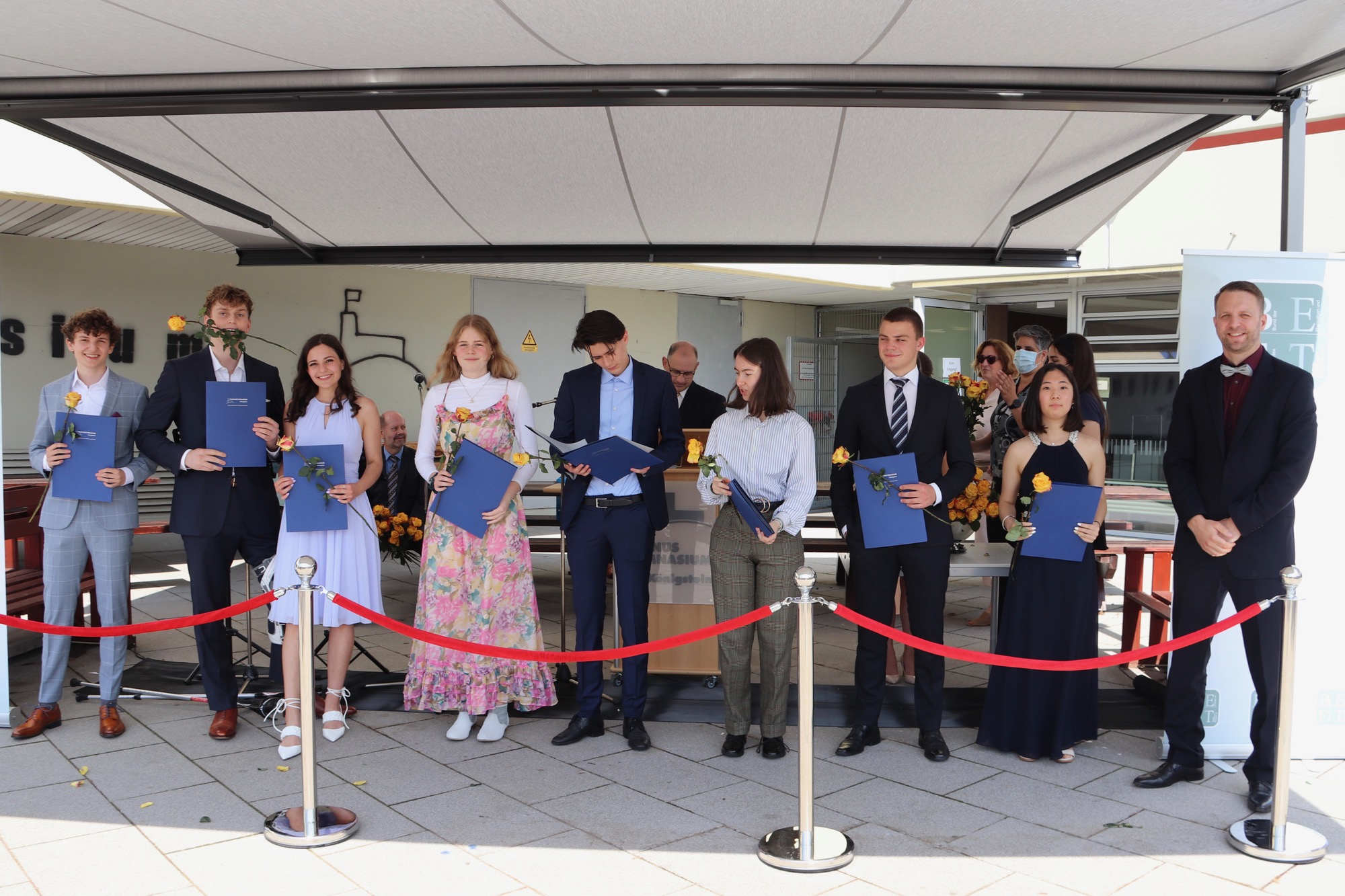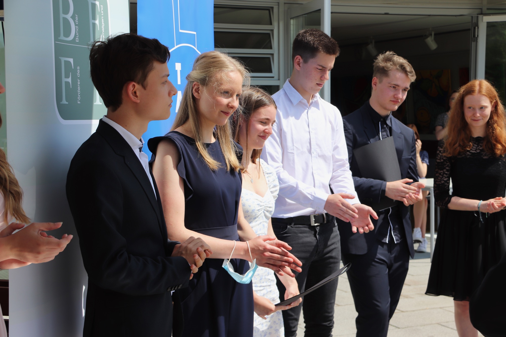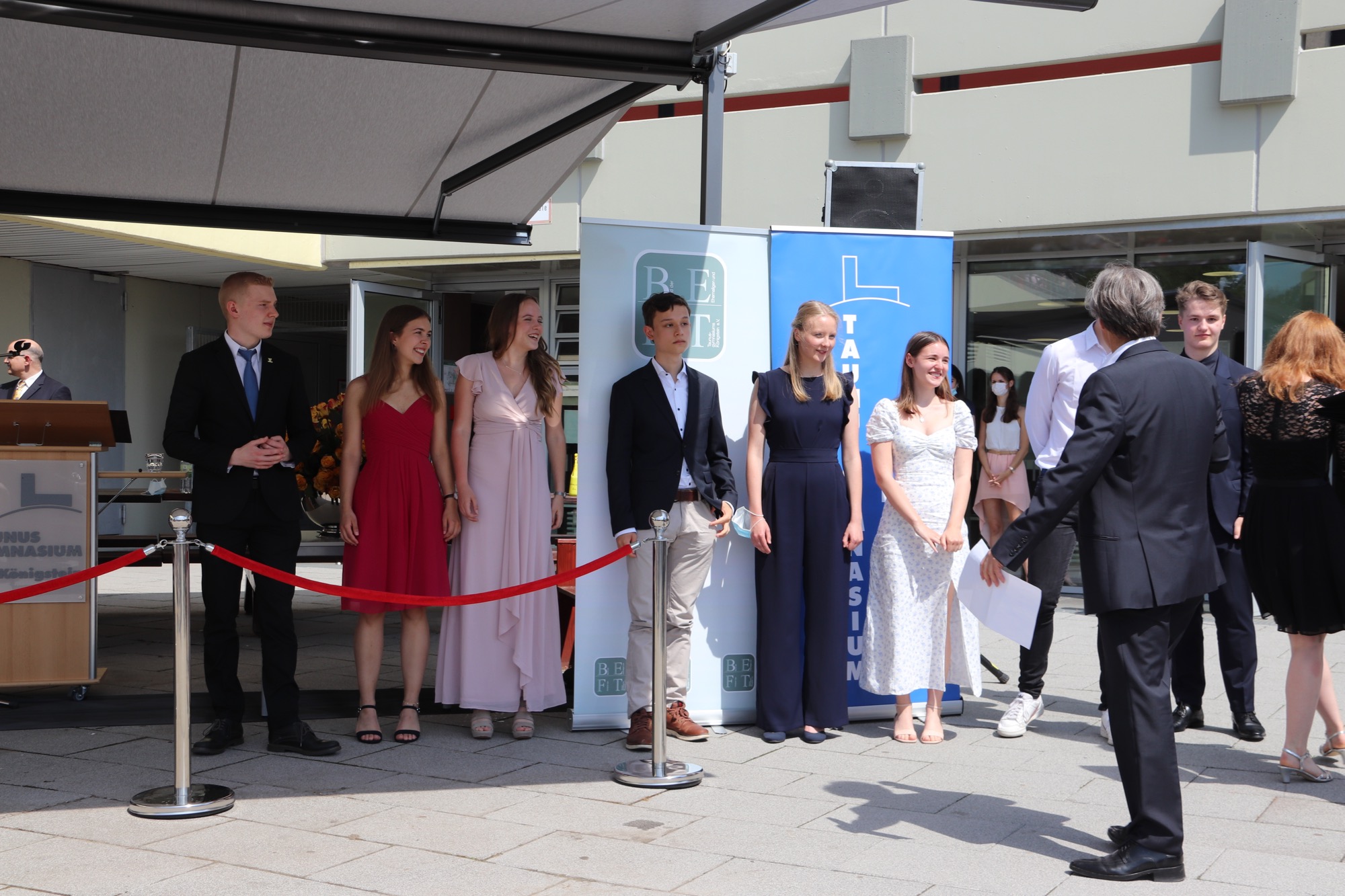Herr Veltjens lobte auch die großen fachlichen Leistungen des Jahrgangs – 43 der 100 Abiturient*innen hatten eine 1 vor dem Komma. Sechs von ihnen erreichten sogar die Traumnote 1,0: Christina Herold, Silja Kasper, Teya Desislavova Petkova, Julius Gerstein, Benedict Göbel und Jonathan Smith. Sie erhielten eine besondere Ehrung und einen riesigen Applaus.