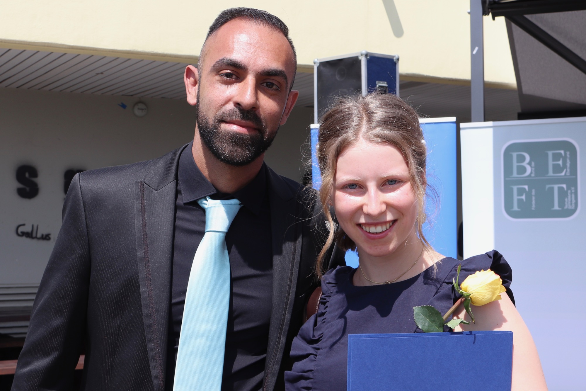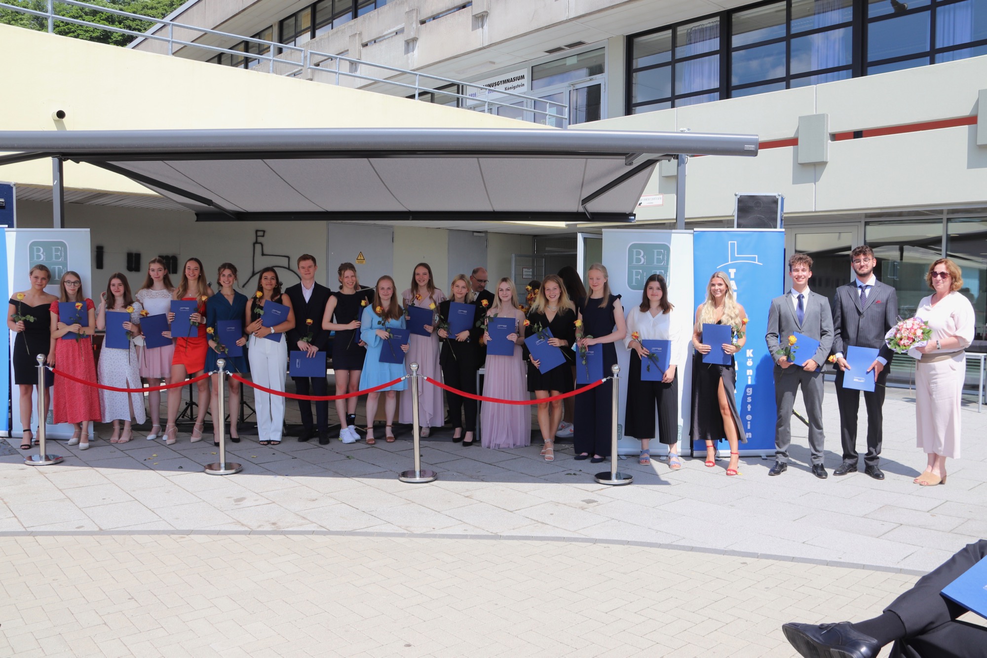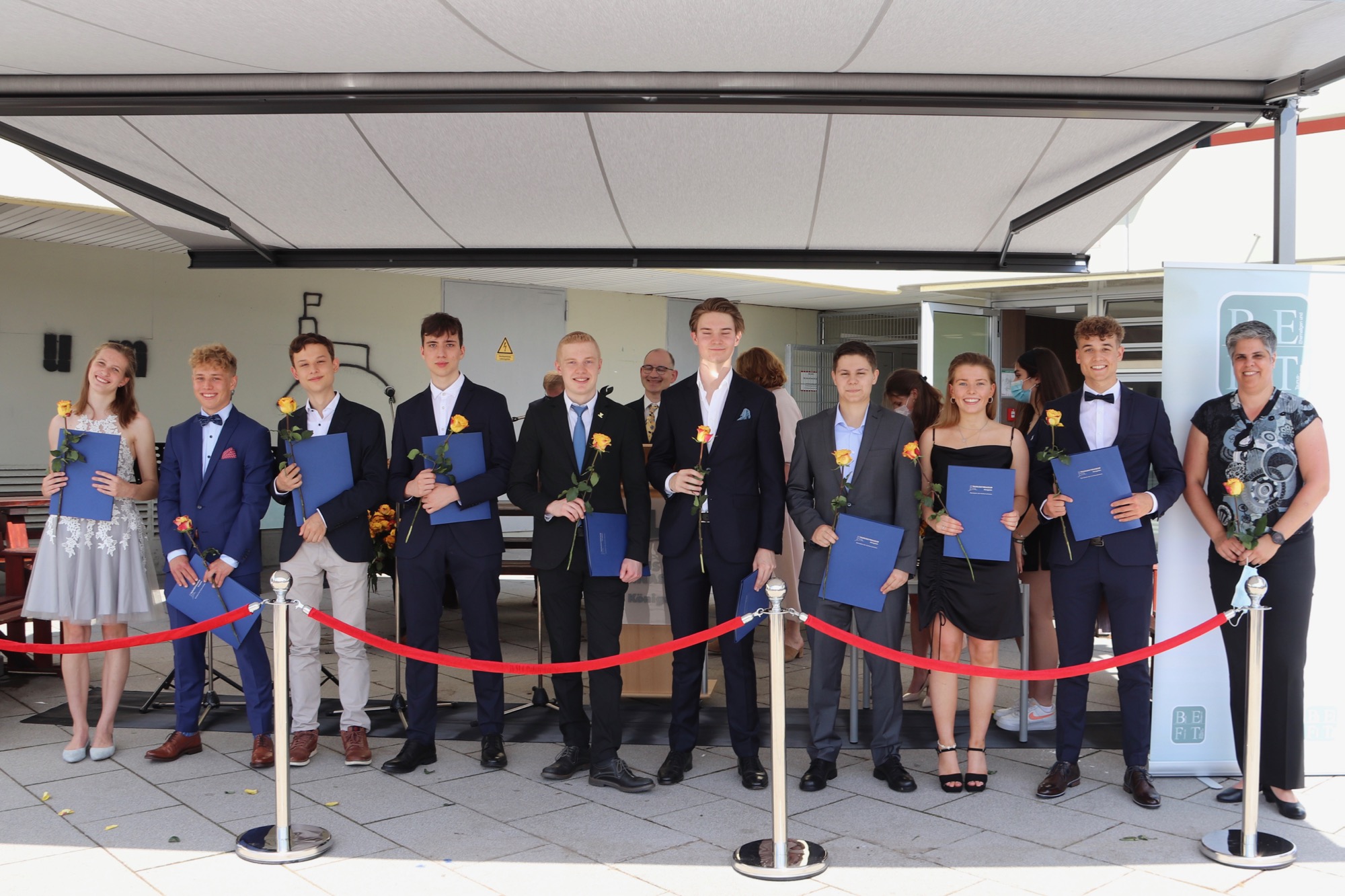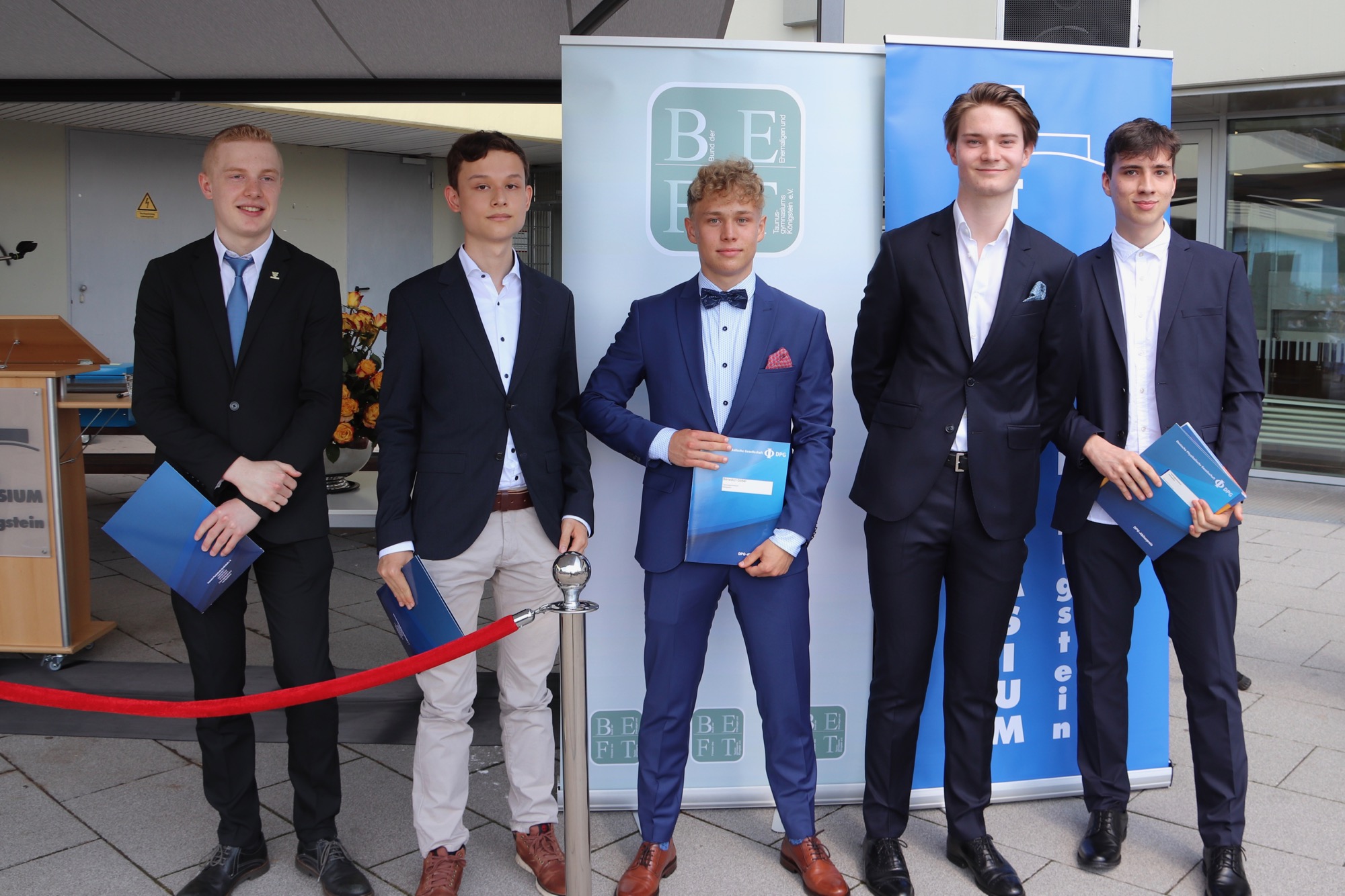 Herr Veltjens lobte auch die großen fachlichen Leistungen des Jahrgangs – 43 der 100 Abiturient*innen hatten eine 1 vor dem Komma. Sechs von ihnen erreichten sogar die Traumnote 1,0: Christina Herold, Silja Kasper, Teya Desislavova Petkova, Julius Gerstein, Benedict Göbel und Jonathan Smith. Sie erhielten eine besondere Ehrung und einen riesigen Applaus.
