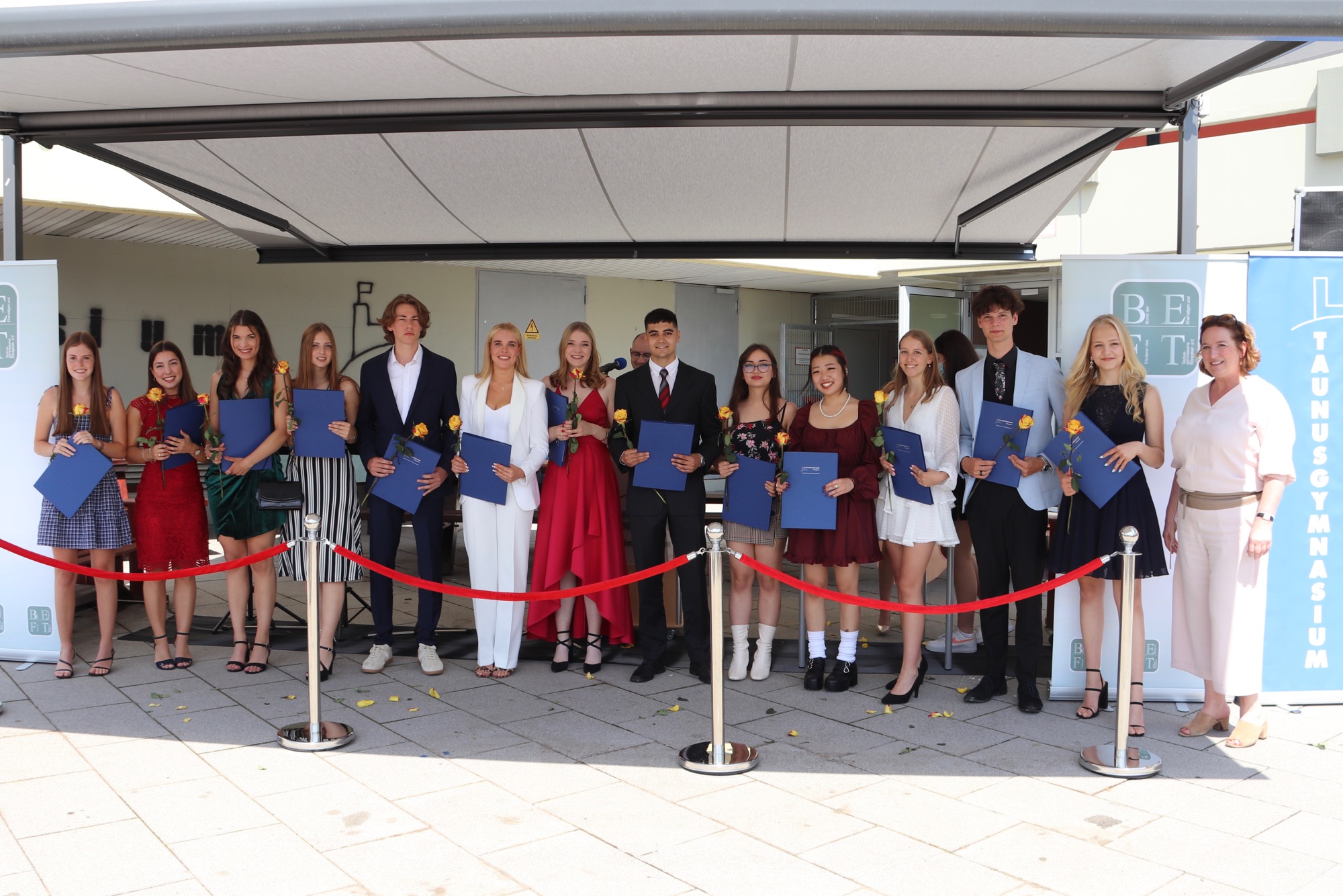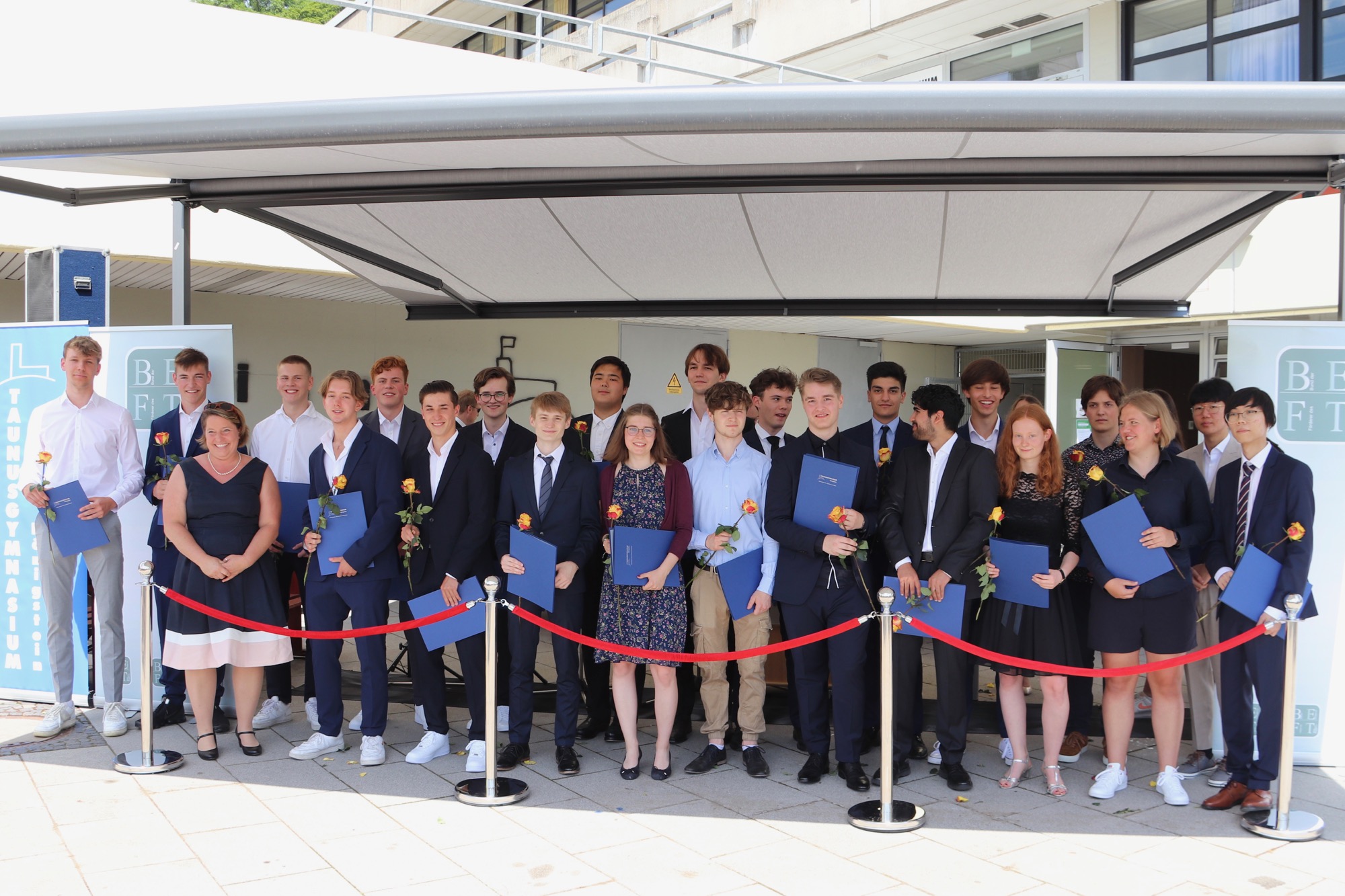 Ein ganz besonderer Abiturjahrgang wurde mit einer ganz besonderen Akademischen Feier am Taunusgymnasium verabschiedet: Im stimmungsvollen Rahmen erhielten die Abiturient*innen des Jahrgangs 2021 bei strahlendem Sommerwetter im Freien ihre Reifezeugnisse – begleitet von Musik, jeder Menge guter Wünsche und gekühltem Sekt-to-Go.