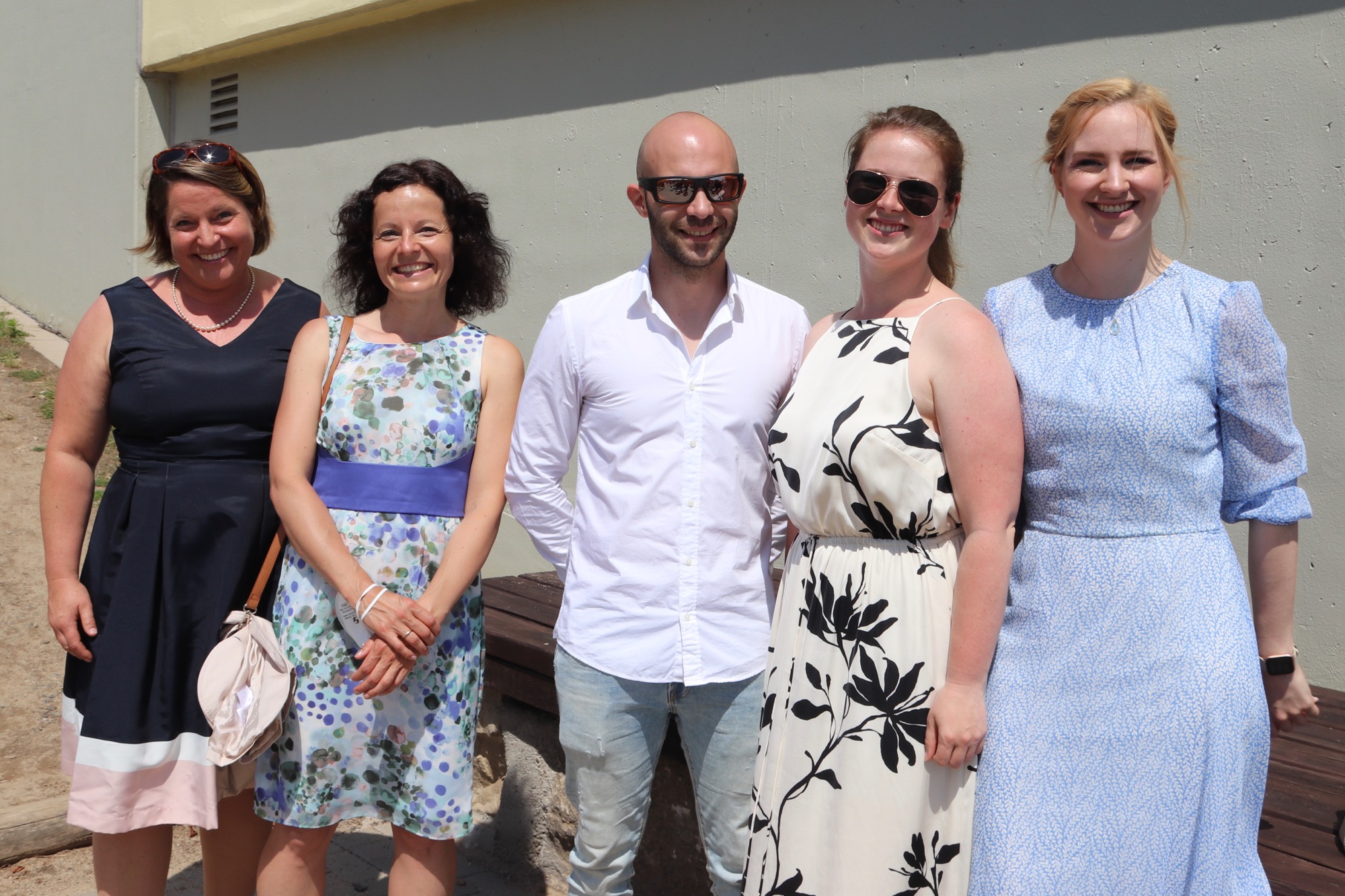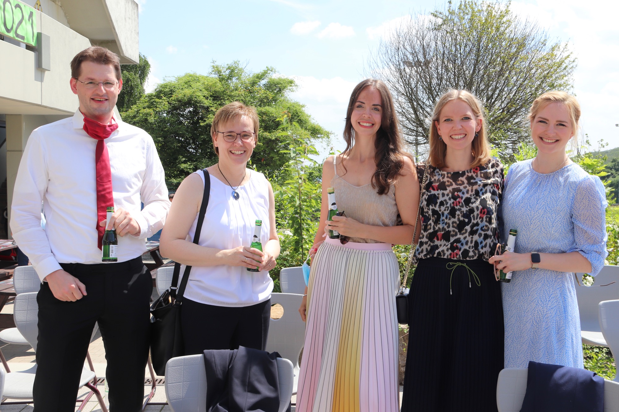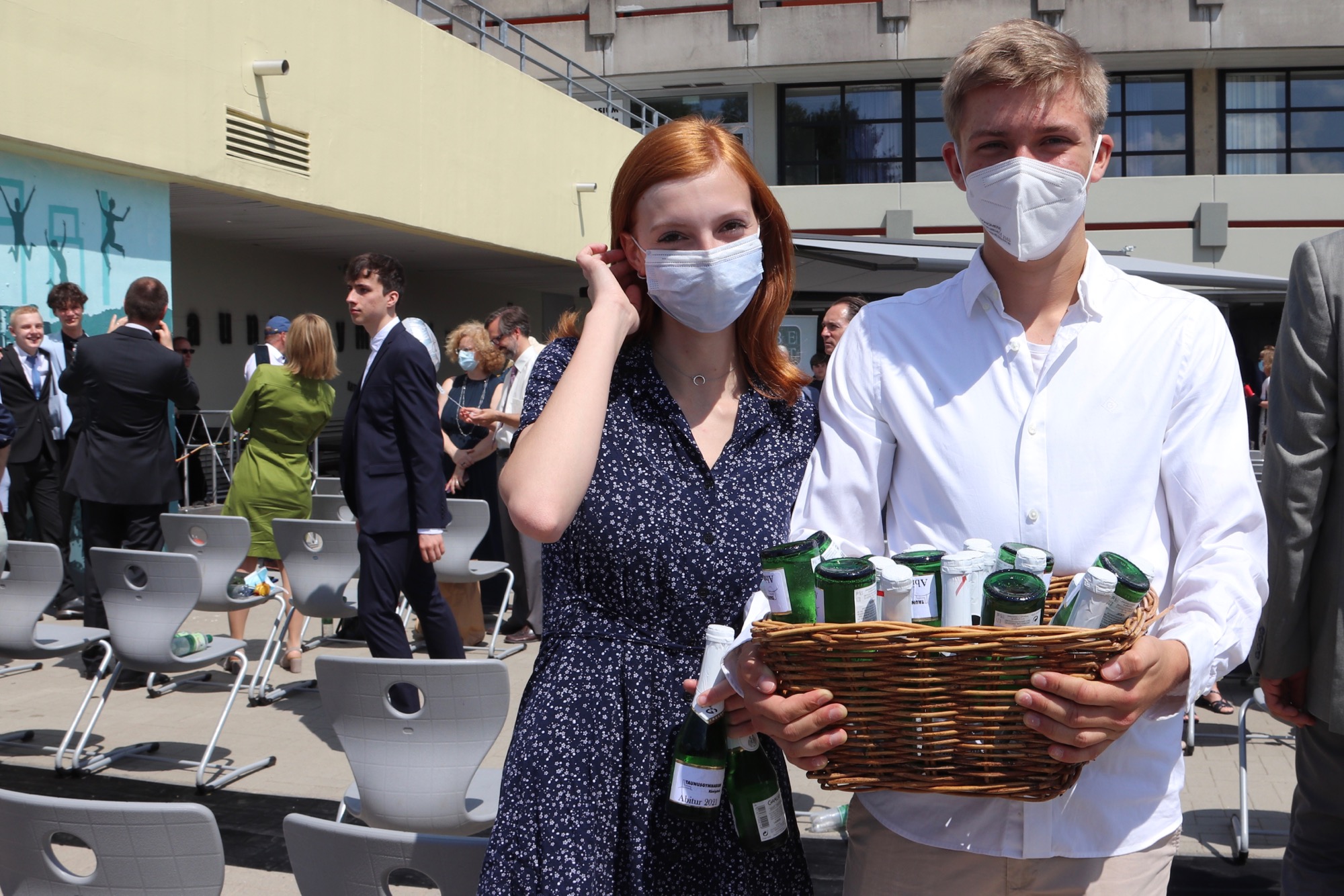 Und dann kam der große Moment: Die einzelnen Tutorengruppen versammelten sich, erhielten von Frau Herbst das Abiturzeugnis und persönliche Glückwünsche sowie von ihren Tutoren eine Rose. Die Stimmung war ausgelassen, als die Helfer aus der Q2 mit gekühlten Piccolo-Sektflaschen (eine Spende des WoB) durch die Reihen zogen und die Feiernden und ihre Familien – natürlich mit dem gebührenden Abstand – auf die erreichten Erfolge anstießen. Eine stimmungsvolle Feier ging zu Ende; doch im familiären Rahmen wurde an diesem wunderbaren Sommertag sicher noch lange weitergefeiert.