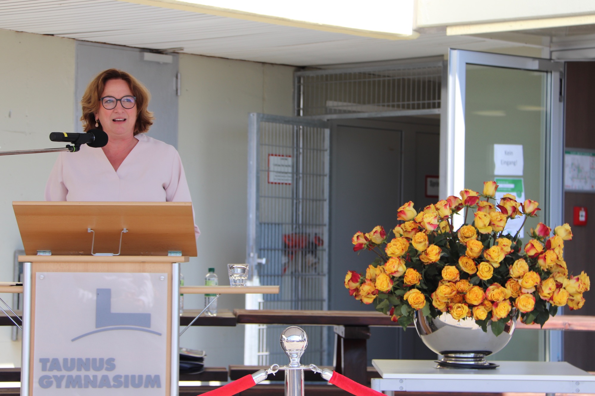 In ihrer Begrüßungsrede erinnerte Frau Herbst, Schulleiterin des Taunusgymnasiums, an die pandemiebedingt schwierigen Unterrichtsbedingungen der vergangenen Monate – und an die Herausforderung für die Abiturient*innen, sich bezüglich der Prüfungen ständig neu zu orientieren. Die Ergebnisse der Prüfungen zeigten jedoch laut Frau Herbst, dass die jungen Menschen diese Herausforderung hervorragend gemeistert hätten, und damit letztlich die nötige Reife gezeigt hätten, die die Allgemeine Hochschulreife zum Ausdruck bringen solle. Denn es gehe weniger um das Wissen, das man sich angeeignet habe, sondern vielmehr um drei Dinge, die diese Reife ausmachten: Durchhaltevermögen, Organisationsfähigkeit und das Entdecken von Stärken. „Das bedeutet auch: Was hat mich geprägt, wer bin ich geworden durch diese Schulzeit hindurch?“ Und dementsprechend sei es auch wichtiger, sich zu fragen, wer man sein möchte in dieser komplizierten Welt, als zu wissen, was man nun konkret vorhabe. „Ich wünsche euch, dass ihr in dieser Schulzeit Teile einer Antwort entdecken konntet, weil ihr aus den vielen Anregungen und Aufgaben herausgefunden habt, was ihr könnt, was euch wirklich interessiert, und in welche Richtung ihr euch entwickeln wollt“, so Frau Herbst.