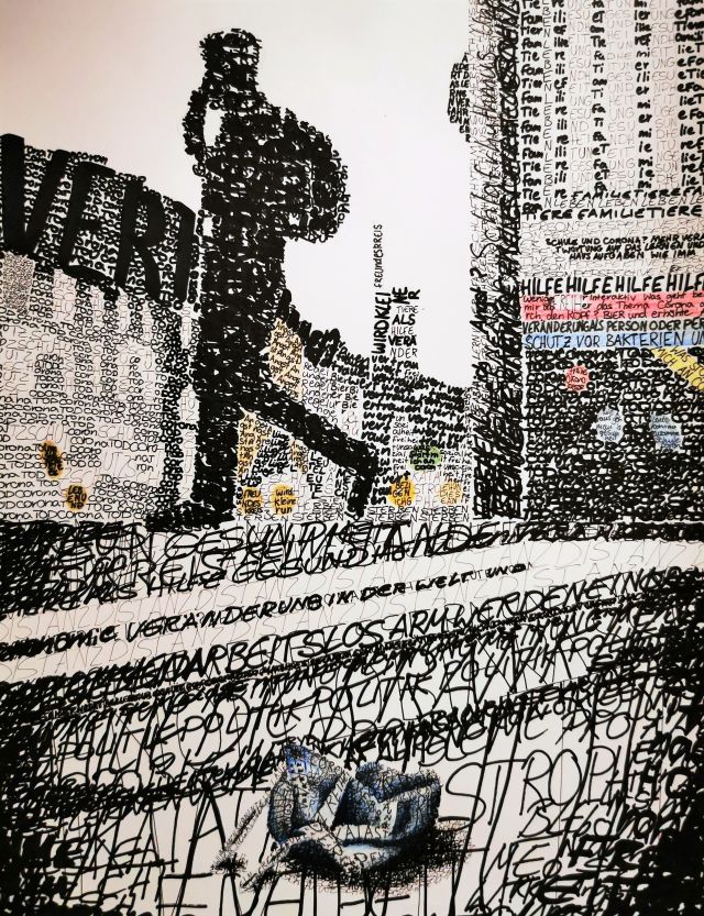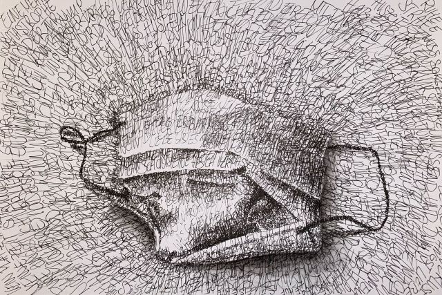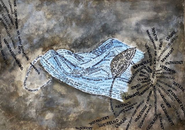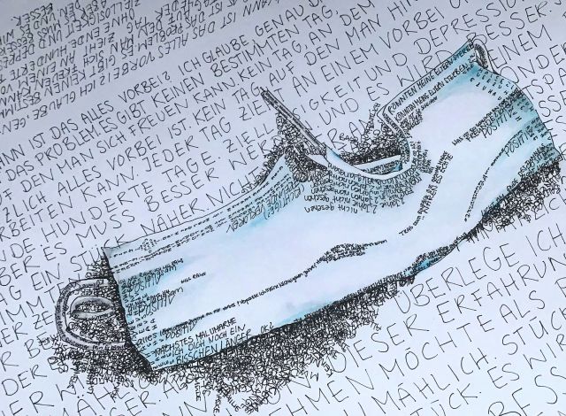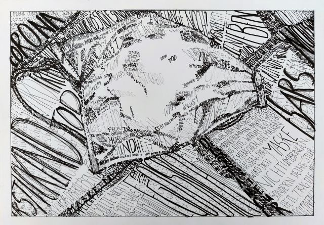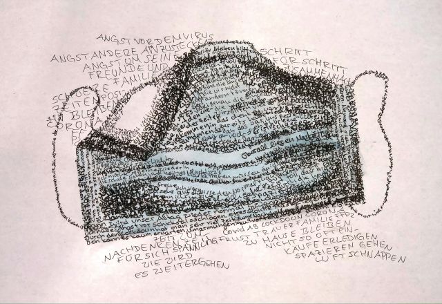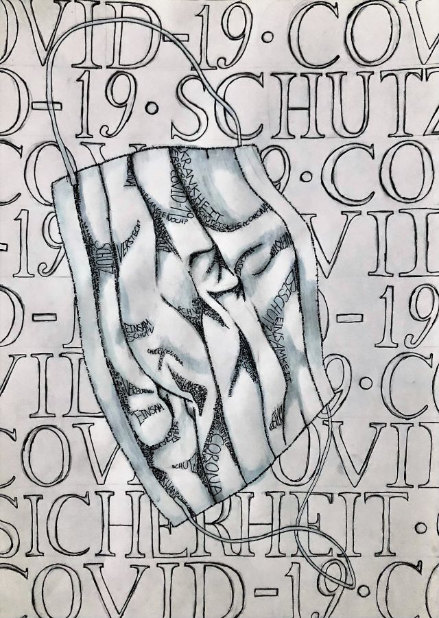 Der Fund wurde mithilfe einer Fotografie dokumentiert und später zeichnerisch transformiert. Die Gedanken und Gefühle, welche die SchülerInnen in einem Leben mit Covid-19 und dem mittlerweile selbstverständlichen Tragen eines Mund-Nasen-Schutzes bewegen, flossen in Form von Schrift-Strukturen in die Zeichnungen ein und bilden durch Verdichtungen gleichzeitig die Schattenwerte der Zeichnungen.