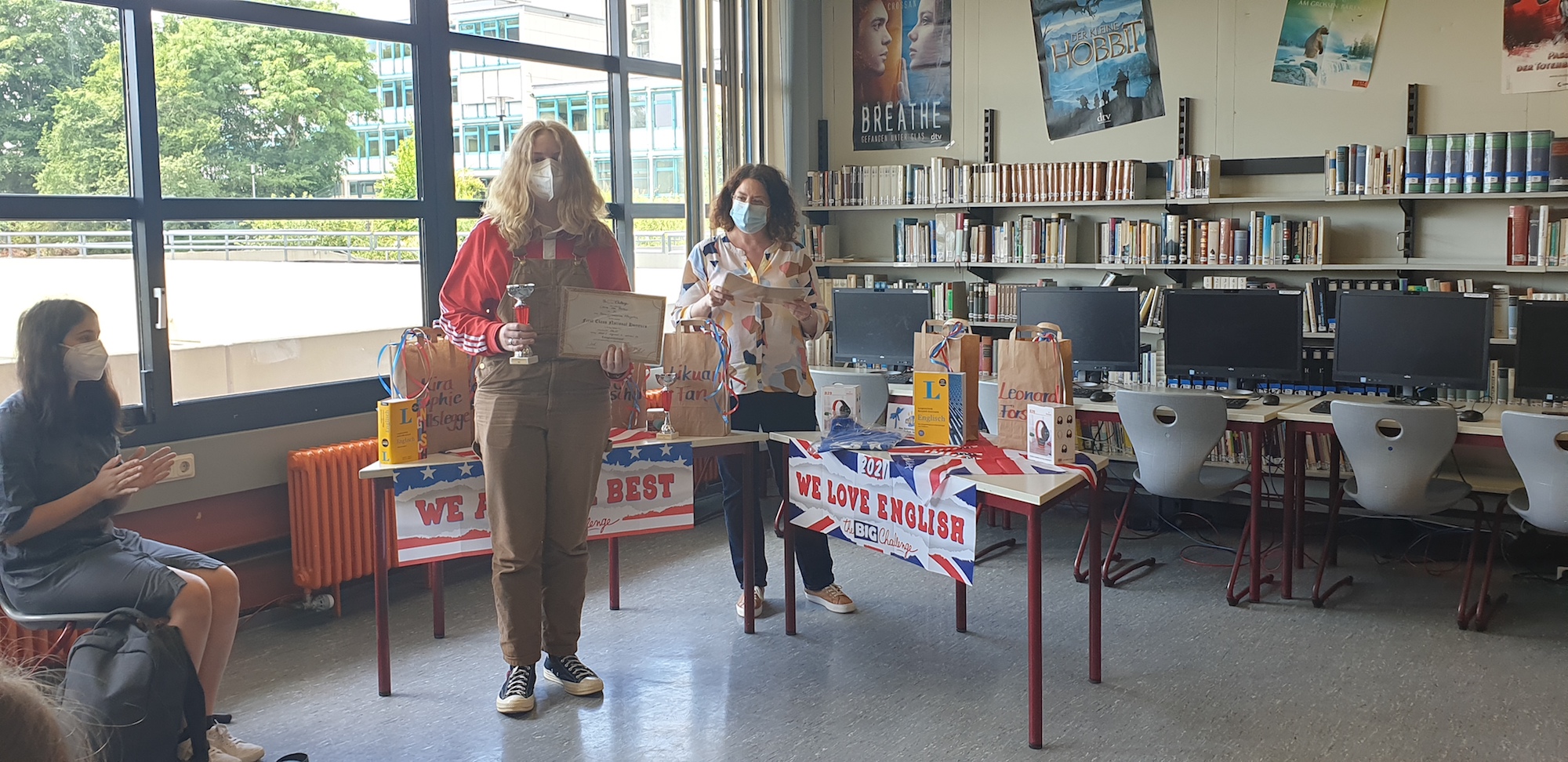Die Preise und Urkunden wurden feierlich überreicht von der Organisatorin Frau Pfeifer; auch Schulleiterin Frau Herbst, Fachbereichsleiter Herr Reiniger sowie die Englischlehrerinnen Frau Kremmelbein und Frau Kerkhecker gratulierten herzlich. Congratulations!