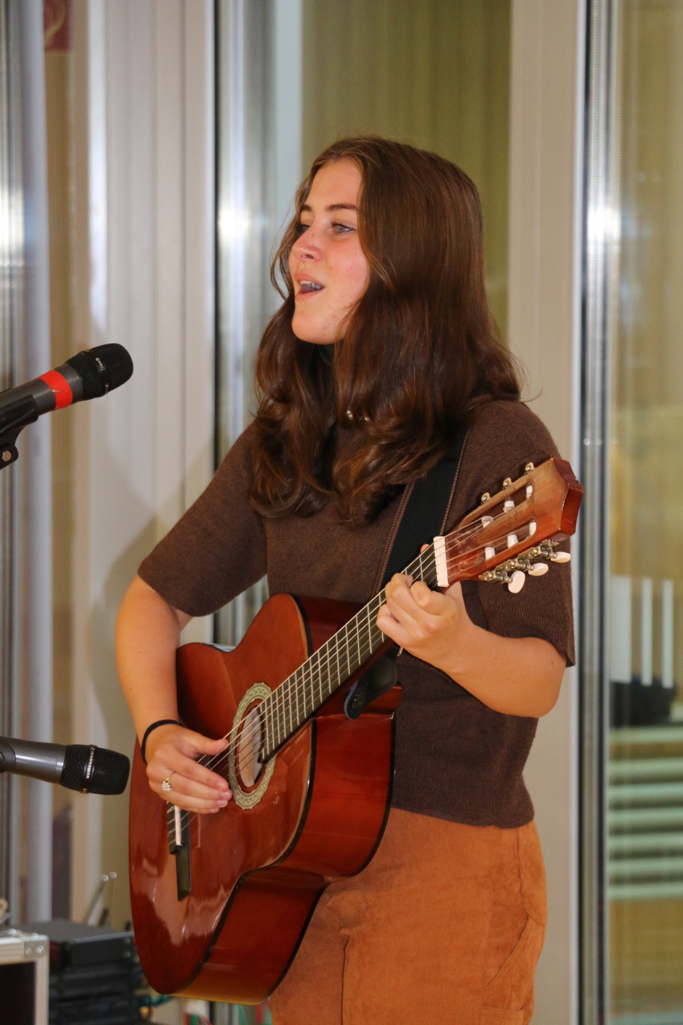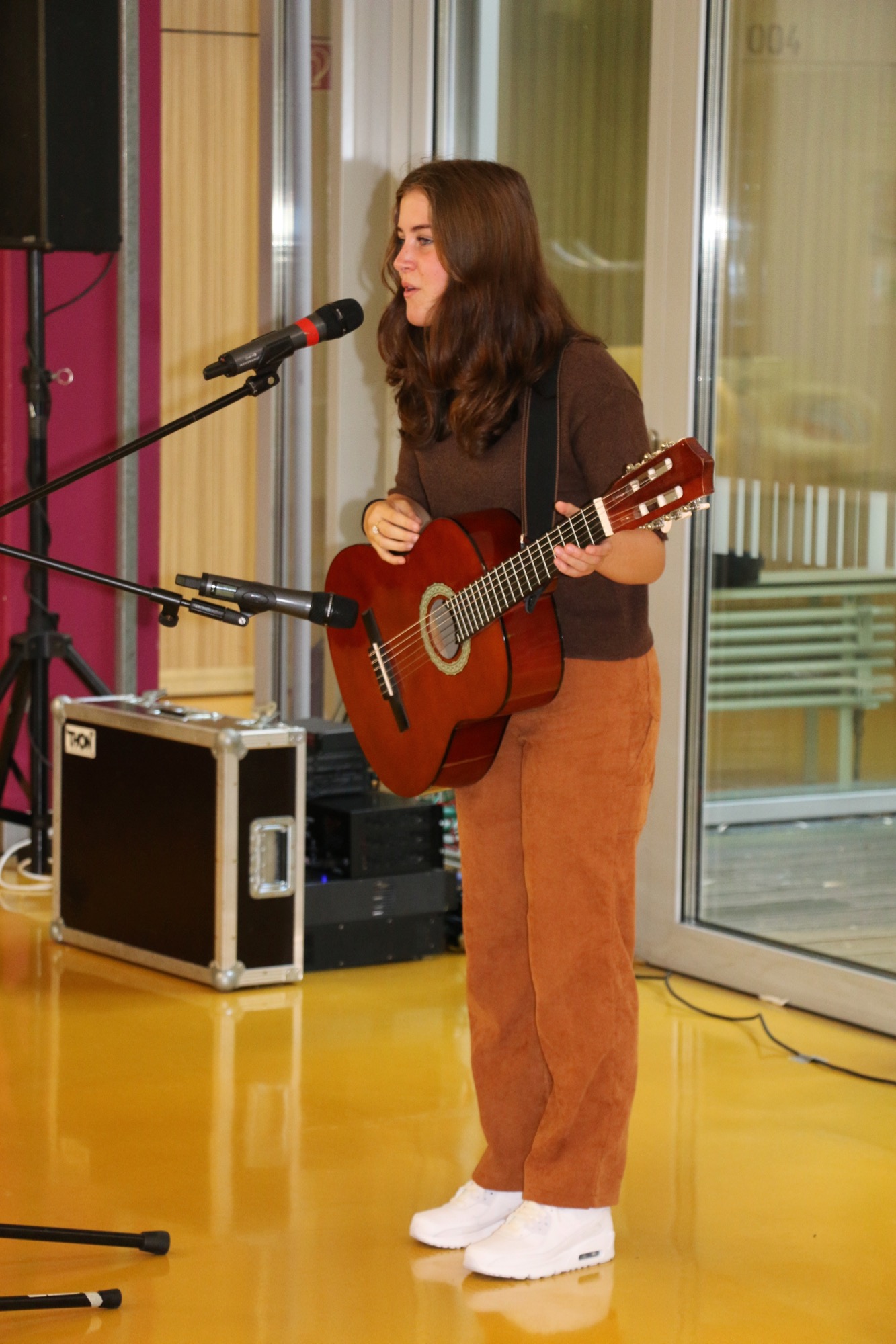 Zur musikalischen Untermalung trat die Schülerin Laura Bachmann (Q1) auf, die sich selbst an der Gitarre begleitete und ihre selbst geschriebenen Songs „Daydream“ und „In my mind“ darbot – was mit großem Applaus belohnt wurde.