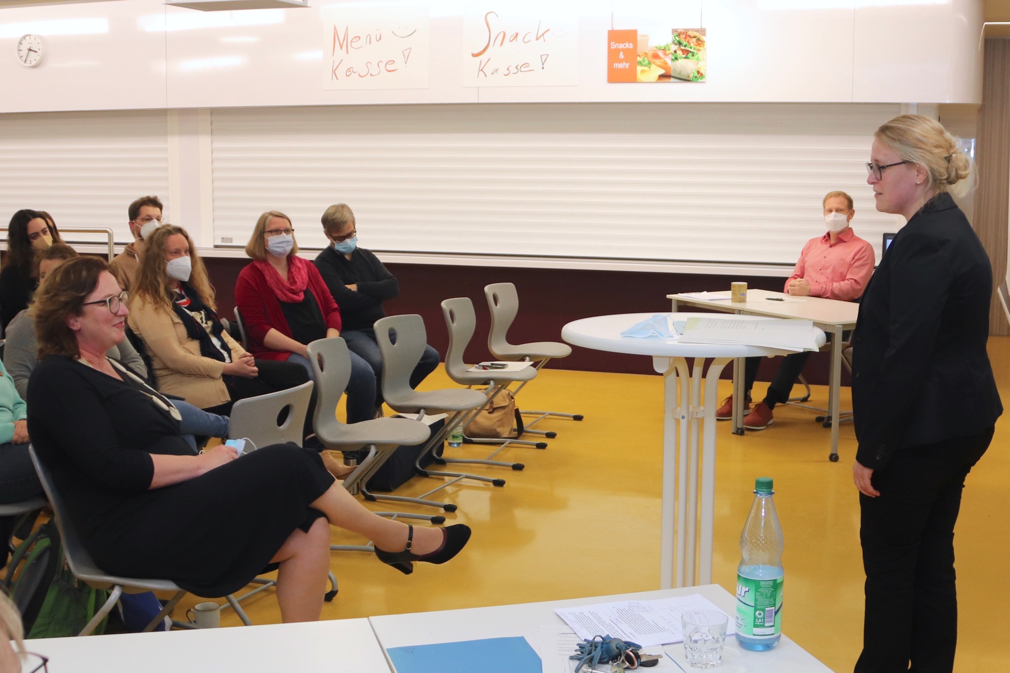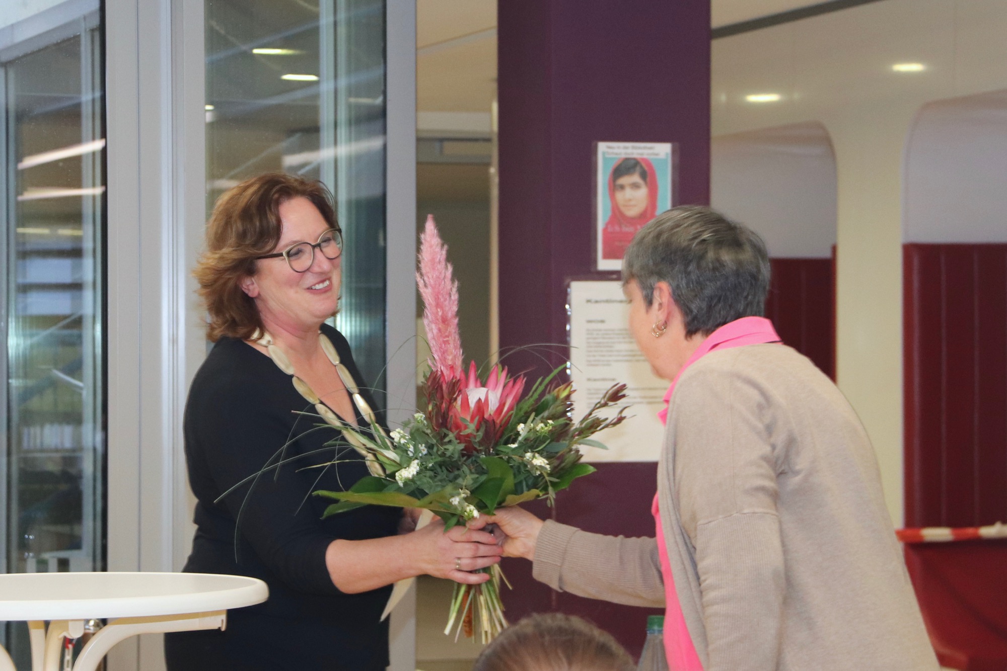 In ihrer Rede wies Frau Engelhardt anerkennend auf die herausfordernden Aufgaben einer Schulleiterin gerade in Zeiten der Pandemie hin, die Frau Herbst erfolgreich erfüllt habe; und sie betonte die freundliche Art, mit der sie Frau Herbst in ihrer Rolle als Schulleiterin erlebt habe. Von Frau Spahn vom Personalrat erhielt Frau Herbst einen prächtigen Blumenstrauß und viele Glückwünsche. Gratuliert wurde auch ausführlich beim anschließenden feierlichen Beisammensein zu Quiche und Sekt mit dem Kollegium. (Rmy)