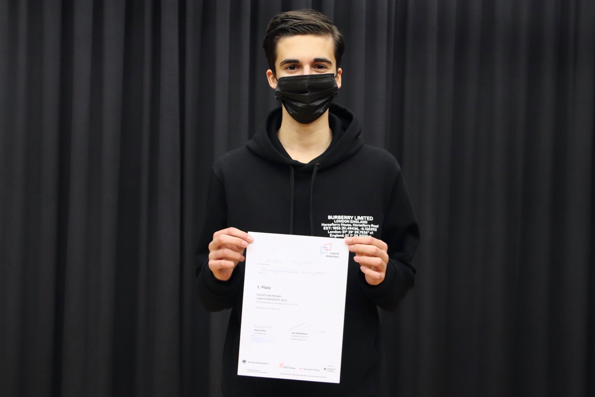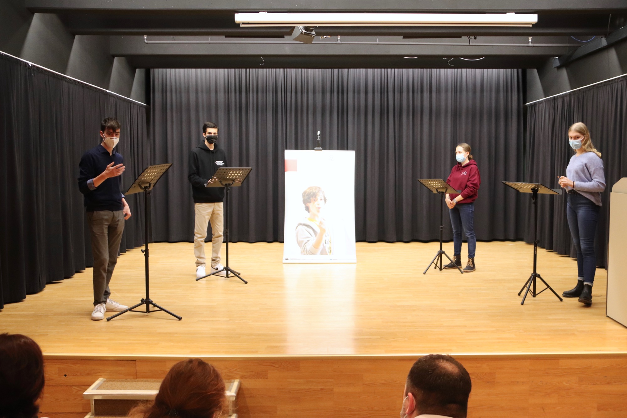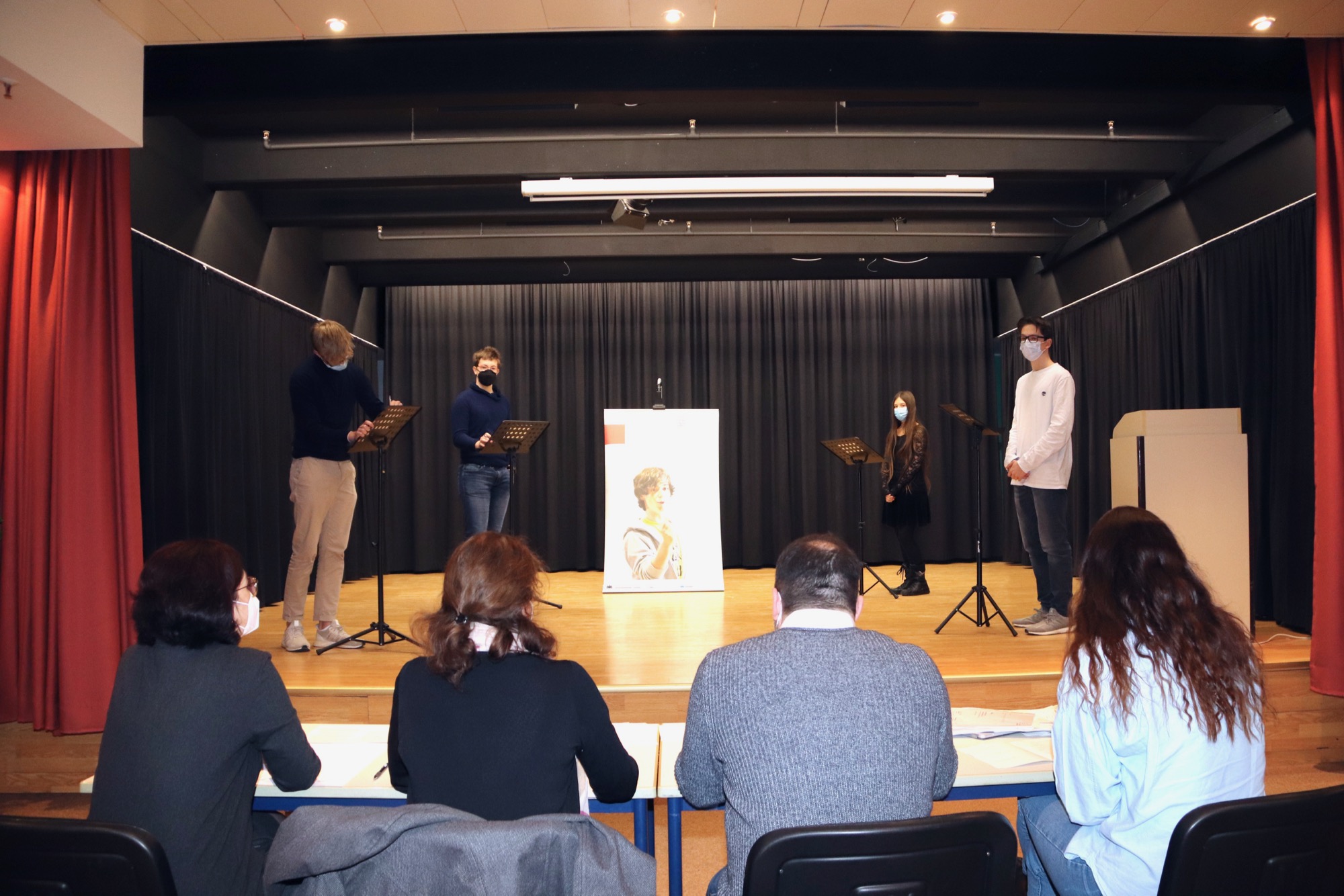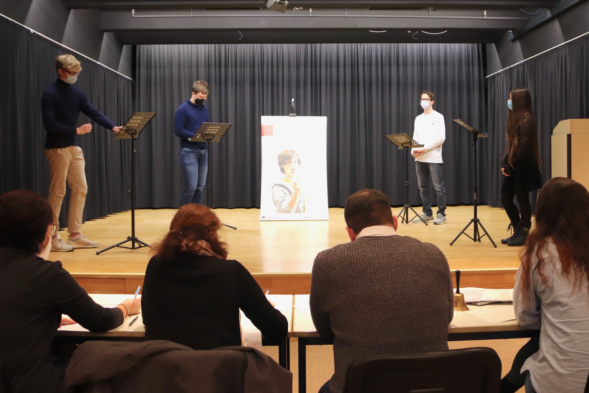 Geleitet und organisiert von Herrn Meinikmann, fanden die zwei Wettbewerbe im Theaterraum des Taunusgymnasiums statt – dieses Jahr ohne Publikum und mit Masken. Bei den 9./10. Klassen drehte sich die Debatte um das Thema „Sollen alle Schüler*innen am Taunusgymnasium ein Schul-Tablet zur Verfügung gestellt bekommen?“. Dazu vertraten Tom Jehle und Fabian Rusch die Pro-Position, während Naemi Russ und Roland Mößner die Contra-Position einnahmen.