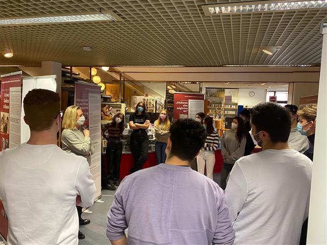 Am 24.02.22 besuchte der Geschichtskurs der Q2 von Frau Nowka die Ausstellung „Christen jüdischer Herkunft in Königstein“ in der Stadtbibliothek. Frau Dr. König berichtete eindrucksvoll von ausgewählten Schicksalen Königsteiner Bürger im Dritten Reich. So erfuhren wir beispielsweise von der Geschichte, Peter Kohnstamms, dem jüngsten Sohn von Dr. Kohnstamm, dem Gründer des bekannten Sanatoriums Dr. Kohnstamm. Peter Kohnstamm, ein Medizinstudent, der getauft und Sohn einer evangelischen Mutter war, wurde nach der Machtübernahme der Nationalsozialisten zunehmend ausgegrenzt. So belegen Quellen, dass er seitens Studienkollegen immer offensichtlicher gemieden wurde, ihm nach Abschluss seines Medizinstudiums eine Stelle in einem großen Hospital verwehrt wurde und er letztlich Deutschland verlassen musste, weil er als Jude galt. Auch das Schicksal von Helene Mayer, einer jungen Leistungssportlerin, die 1936 für das nationalsozialistische Deutschland als deutsche jüdische Athletin antrat, bewegte den Kurs sehr. Frau Dr. König berichtet zudem vom Schicksal der erfolgreichen Königsteiner Immobilienmaklerin Louise Gemmer, die im Glauben, dass nur Männern von den Verfolgungsmaßnahmen der Nationalsozialisten akut bedroht seien, in ihrer Heimatstadt blieb, bis sie und ihre Tochter am 1. September 1942 nach Theresienstadt deportiert und ermordet wurden.
