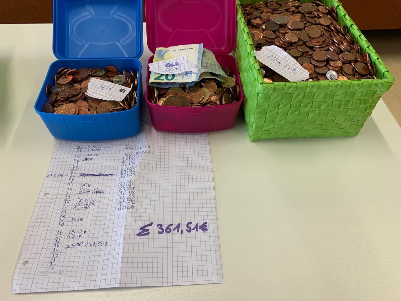 Aber ohne Ansporn oder Motivation ist die Teilnahme natürlich total langweilig. Da haben wir uns natürlich auch etwas überlegt: Die Klassen durften am Ende der Aktion schätzen, wie viel gesammelt worden ist. Und natürlich hat die Klasse, die am nächsten herangekommen ist, etwas gewonnen: nämlich kiloweise Süßigkeiten. Uns hat die Aktion super viel Spaß gemacht, und es sind 500 Euro dabei herausgekommen. Gelohnt hat es sich also definitiv!
