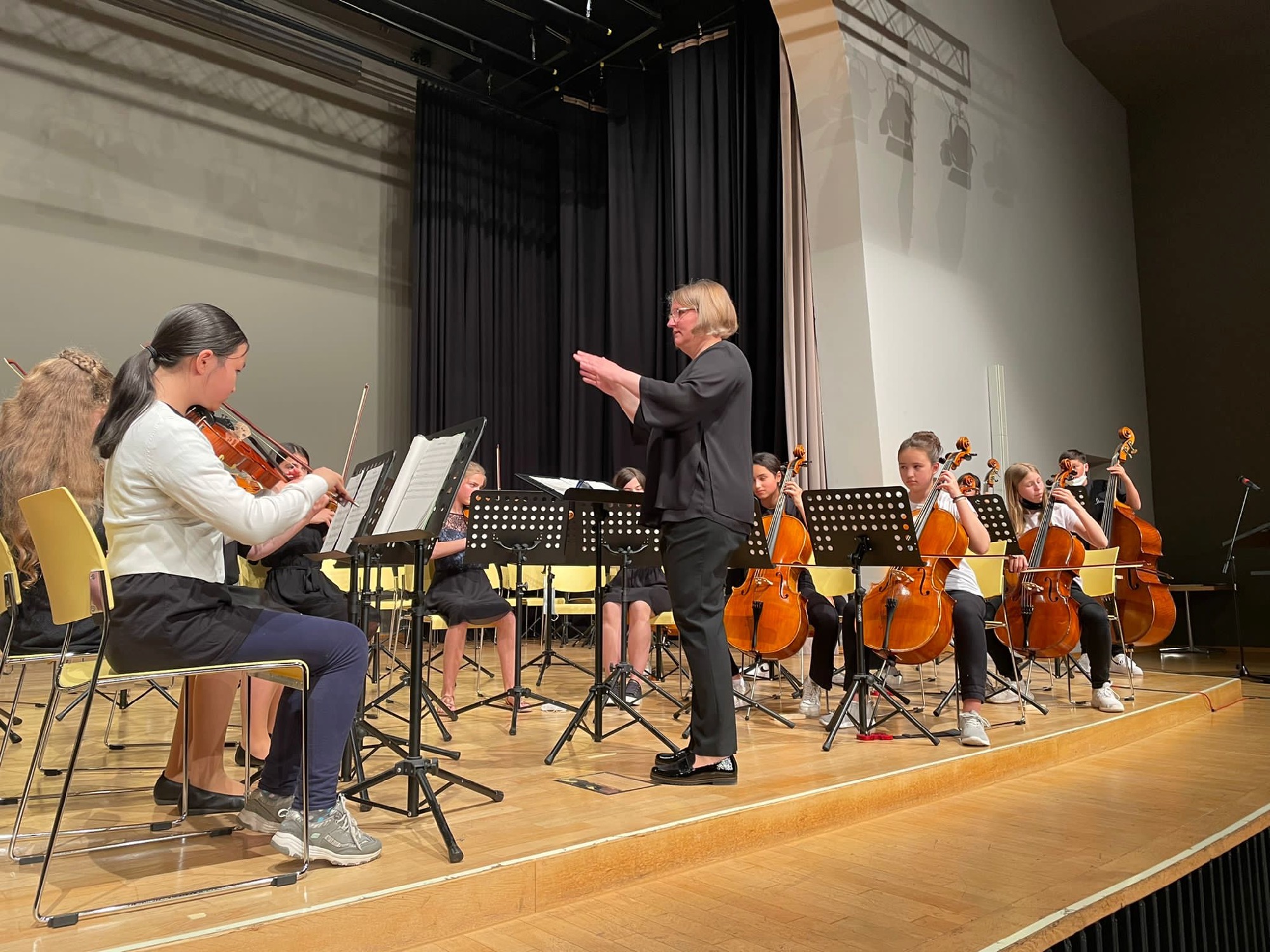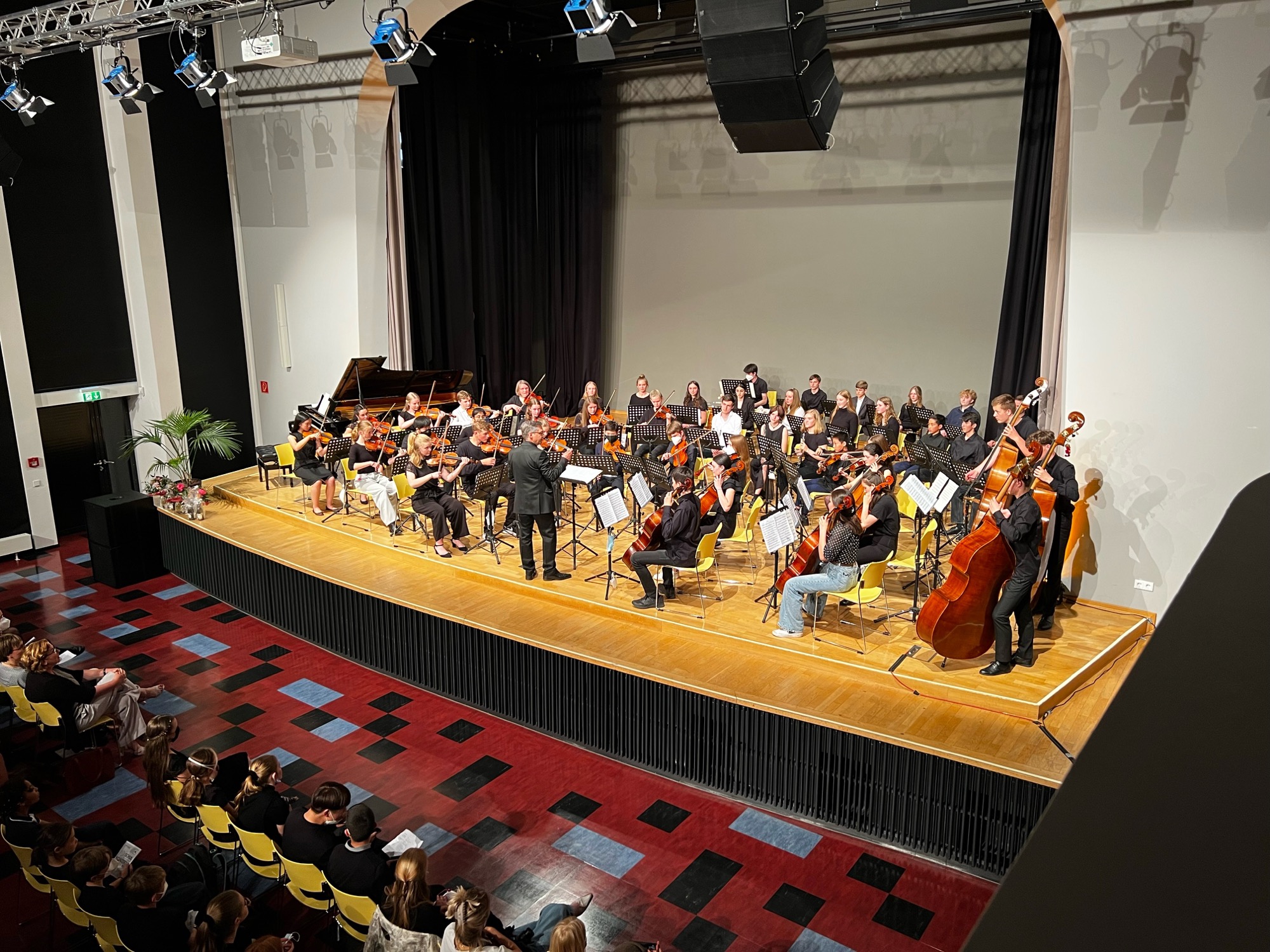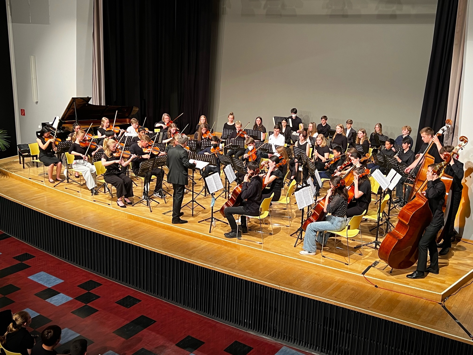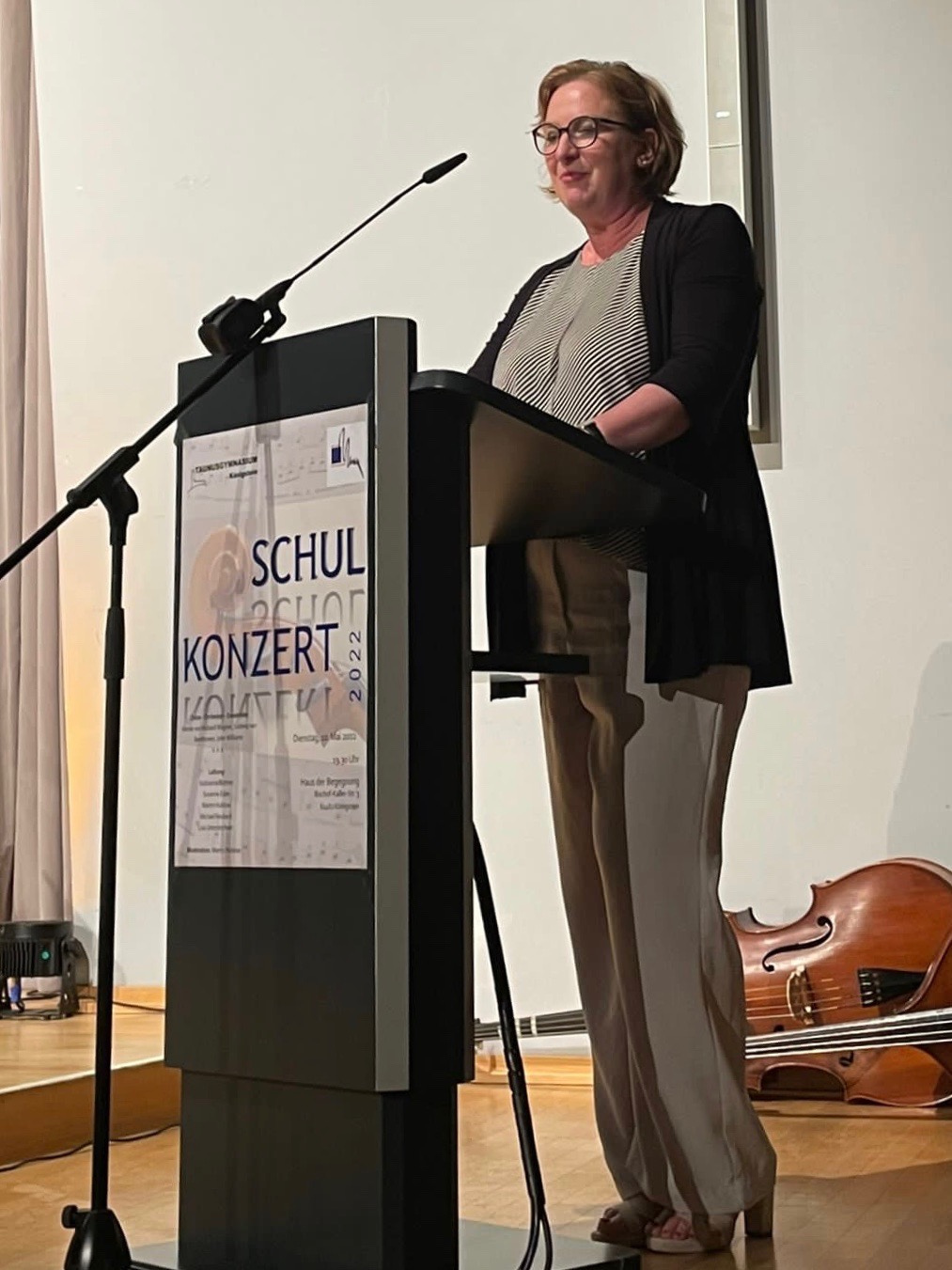 In ihrer Begrüßungsansprache bezog sich Schulleiterin Frau Herbst auf die besonderen Umstände des Abends. Ausgehend von einem Schiller-Zitat, „der Mensch ist nur da ganz Mensch, wo er spielt“, nahm sie die beiden vergangenen Jahre in den Blick, die von umfassenden Entbehrungen gerade auch seitens der musizierenden Schüler*innen und Lehrkräfte geprägt waren. Und sie lobte die Teilnehmenden dafür, nicht aufgegeben zu haben bei all der Probenarbeit, die innerhalb kürzester Zeit stattfinden musste – denn beispielsweise das gemeinsame Singen war erst seit wenigen Wochen wieder möglich. Und zuletzt hob Frau Herbst die inspirierende Wirkung der Musik hervor, da die Musiker*innen „uns auch in diesen recht düsteren Wochen immer wieder daran erinnern, was der Mensch ist und was er sein kann, wenn er friedlich und gemeinsam spielt.“