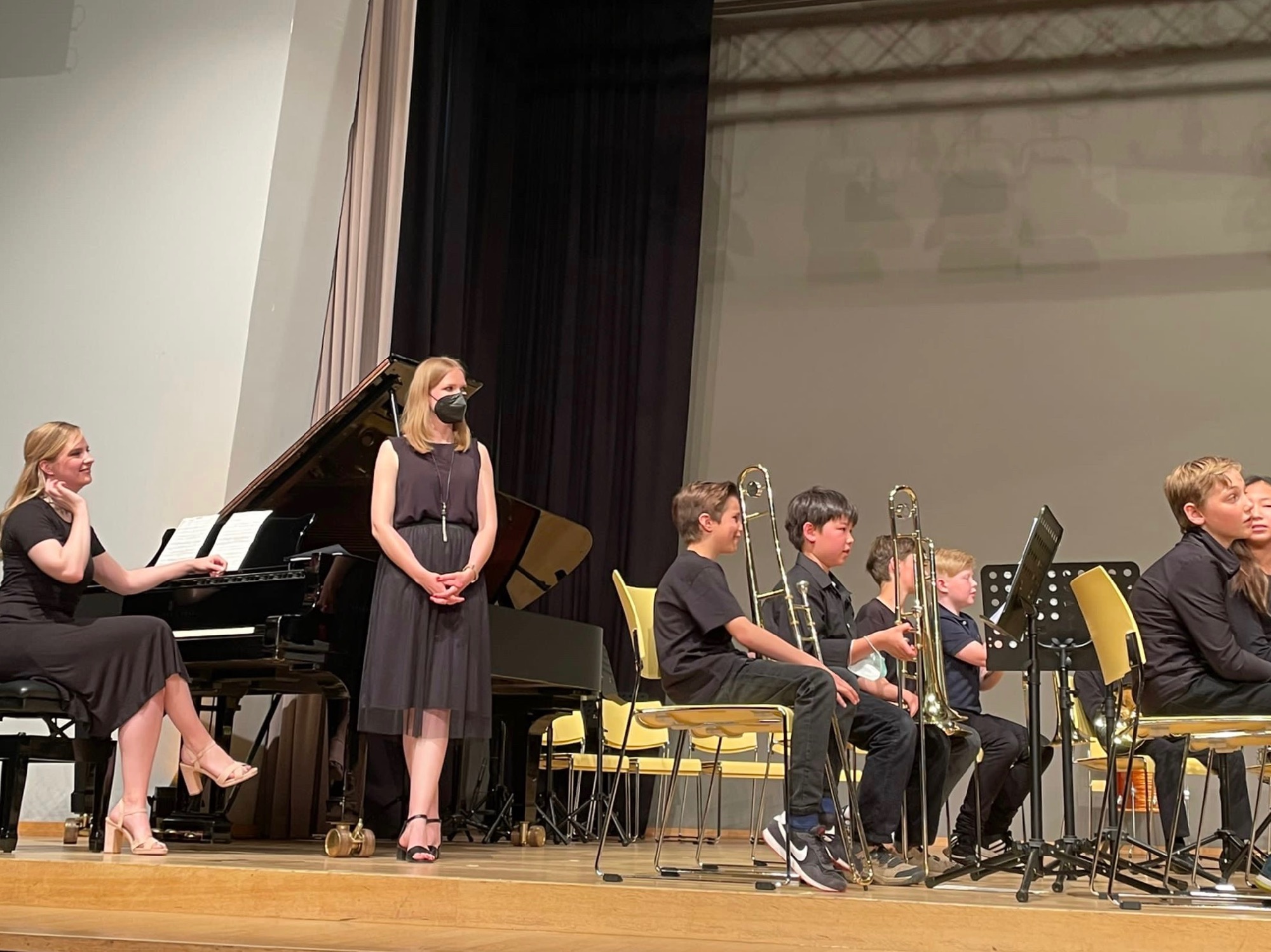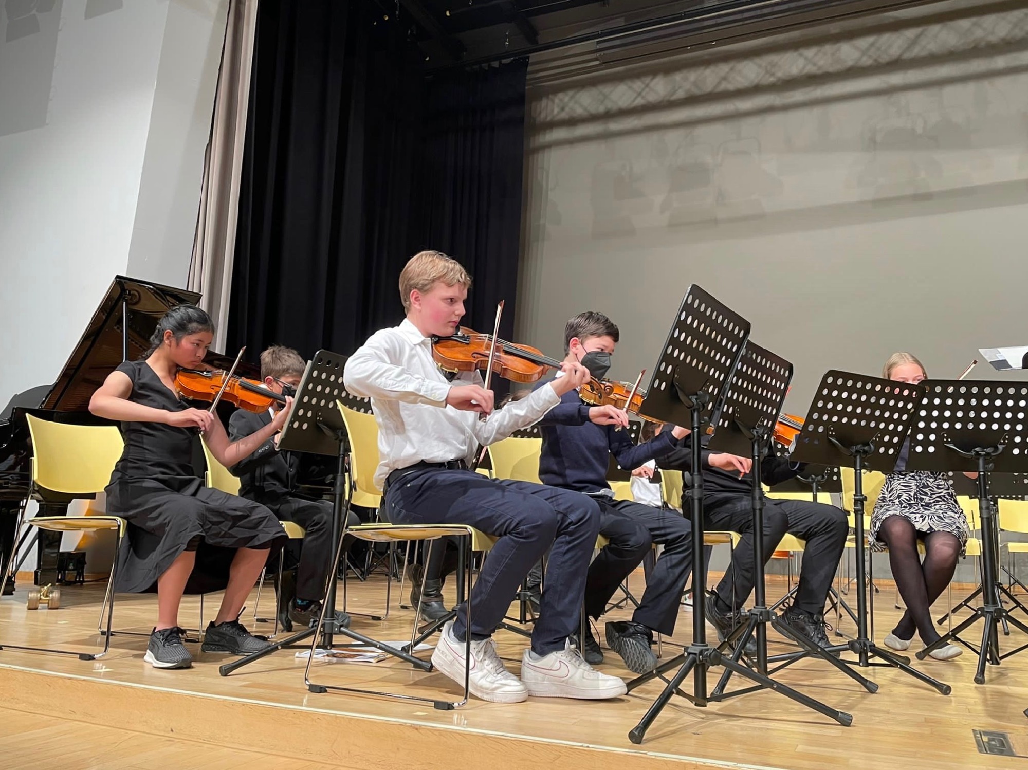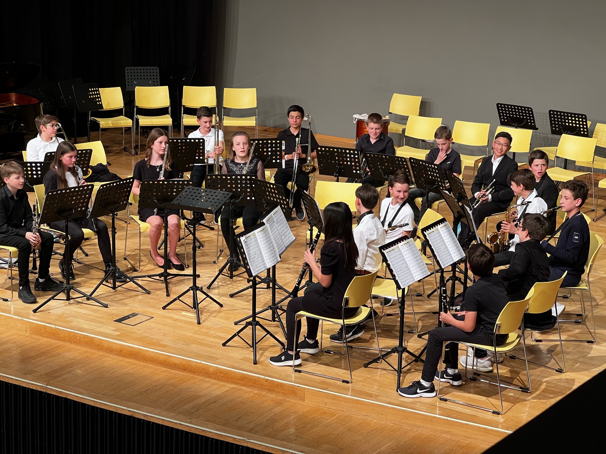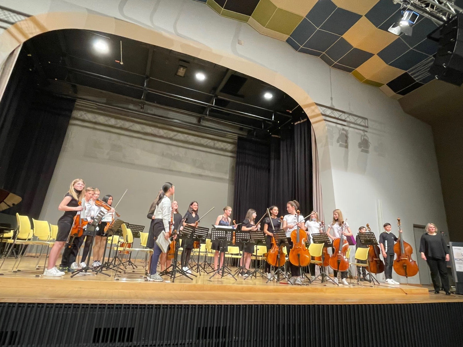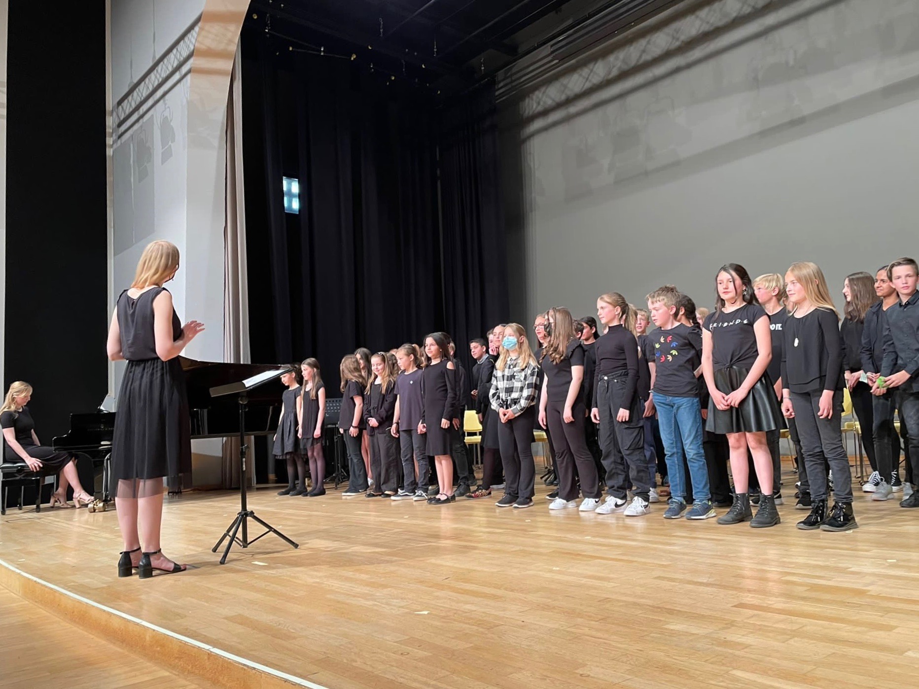 In ihrer Begrüßungsansprache bezog sich Schulleiterin Frau Herbst auf die besonderen Umstände des Abends. Ausgehend von einem Schiller-Zitat, „der Mensch ist nur da ganz Mensch, wo er spielt“, nahm sie die beiden vergangenen Jahre in den Blick, die von umfassenden Entbehrungen gerade auch seitens der musizierenden Schüler*innen und Lehrkräfte geprägt waren. Und sie lobte die Teilnehmenden dafür, nicht aufgegeben zu haben bei all der Probenarbeit, die innerhalb kürzester Zeit stattfinden musste – denn beispielsweise das gemeinsame Singen war erst seit wenigen Wochen wieder möglich. Und zuletzt hob Frau Herbst die inspirierende Wirkung der Musik hervor, da die Musiker*innen „uns auch in diesen recht düsteren Wochen immer wieder daran erinnern, was der Mensch ist und was er sein kann, wenn er friedlich und gemeinsam spielt.“