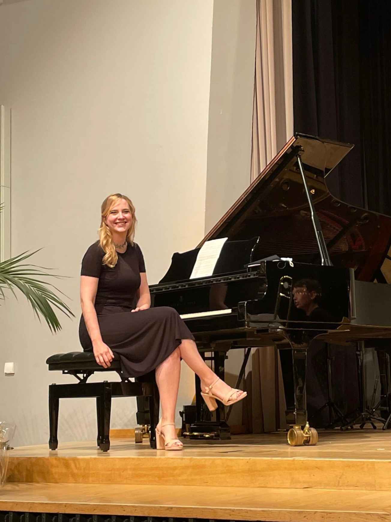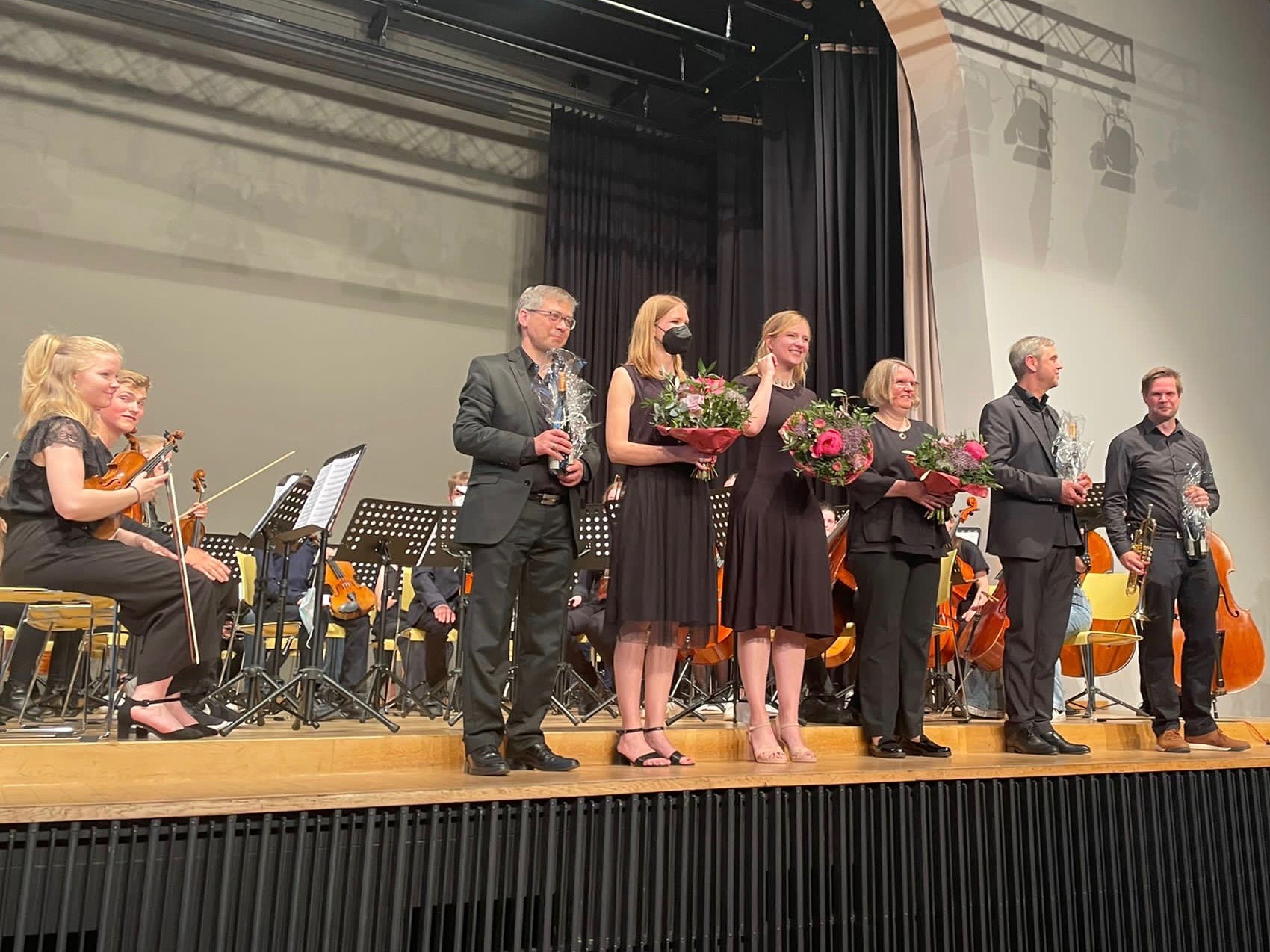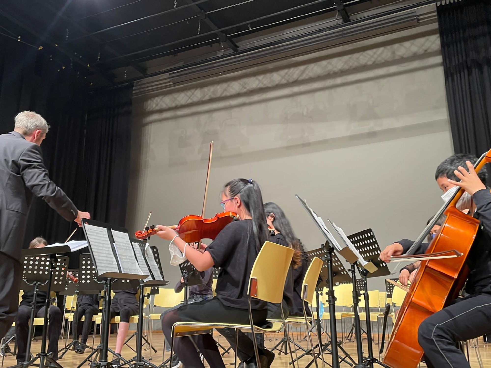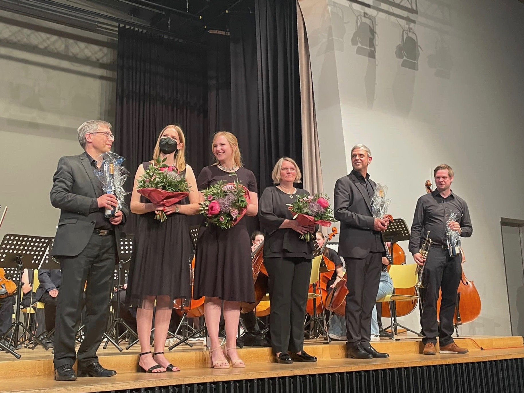 In ihrer Begrüßungsansprache bezog sich Schulleiterin Frau Herbst auf die besonderen Umstände des Abends. Ausgehend von einem Schiller-Zitat, „der Mensch ist nur da ganz Mensch, wo er spielt“, nahm sie die beiden vergangenen Jahre in den Blick, die von umfassenden Entbehrungen gerade auch seitens der musizierenden Schüler*innen und Lehrkräfte geprägt waren. Und sie lobte die Teilnehmenden dafür, nicht aufgegeben zu haben bei all der Probenarbeit, die innerhalb kürzester Zeit stattfinden musste – denn beispielsweise das gemeinsame Singen war erst seit wenigen Wochen wieder möglich. Und zuletzt hob Frau Herbst die inspirierende Wirkung der Musik hervor, da die Musiker*innen „uns auch in diesen recht düsteren Wochen immer wieder daran erinnern, was der Mensch ist und was er sein kann, wenn er friedlich und gemeinsam spielt.“