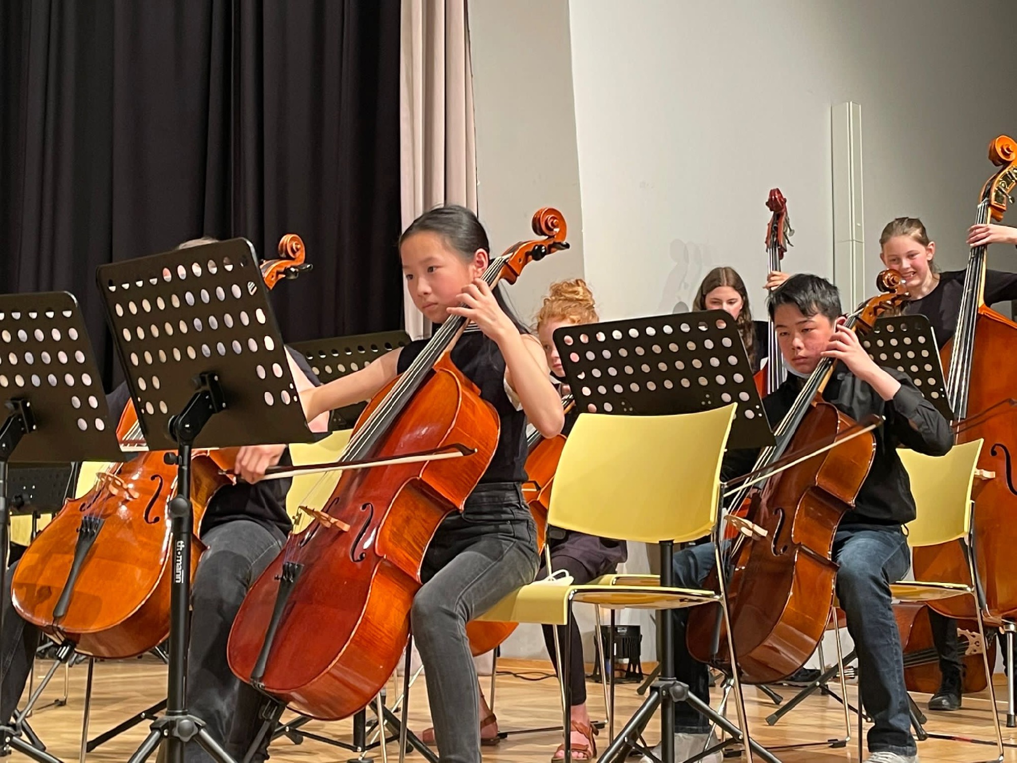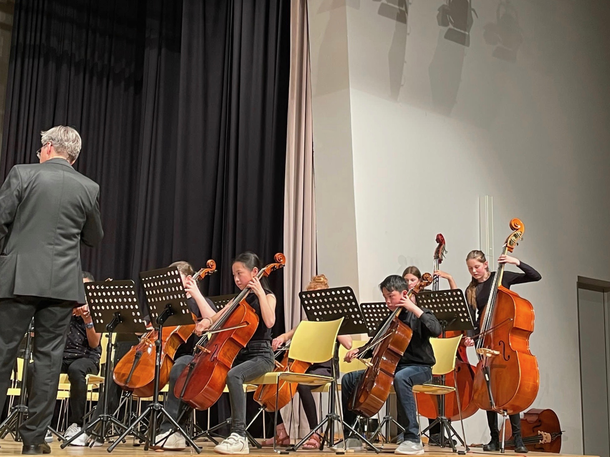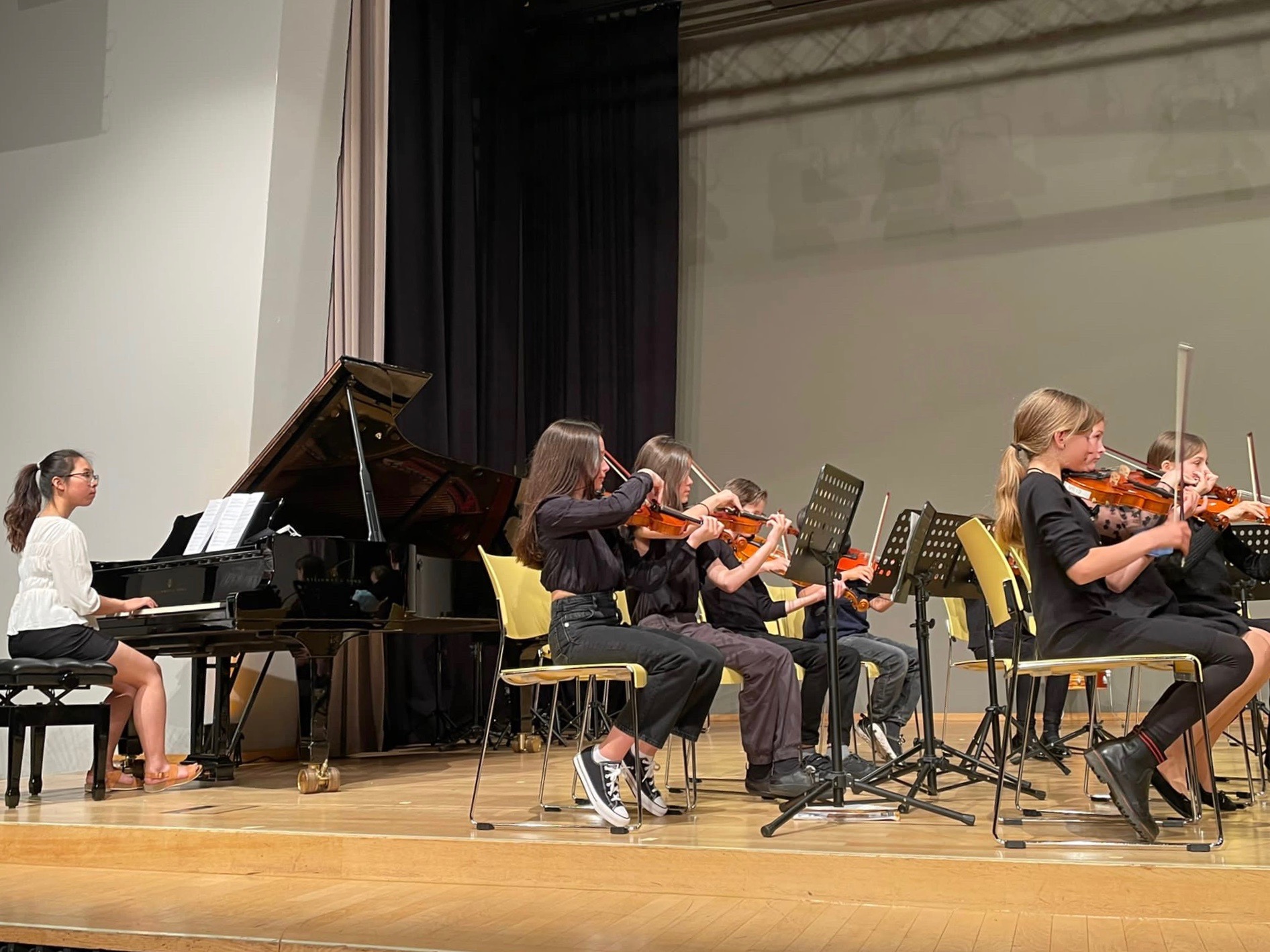 Die Streichergruppe der Klasse 5 brachte unter der Leitung von Herrn Hublow das französische Volkslied „Au clair de la lune“ zum Vortrag sowie das von Mozart inspirierte „Twinkle, Twinkle Little Star“ – auch hier begleitete wiederum Ajin Jeong am Flügel.