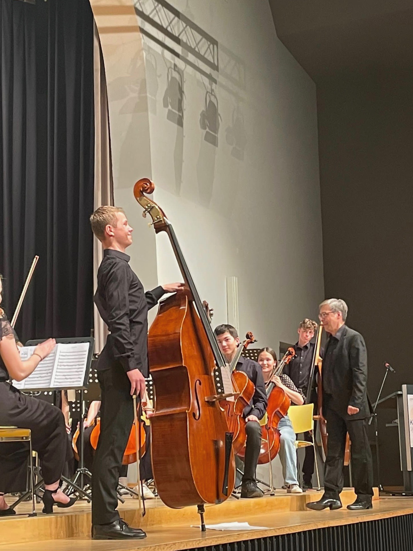 Das Große Orchester bestreitet traditionell den letzten Abschnitt des Schulkonzerts – und tat dies mit einer Klangfülle und Dynamik, die das Publikum zu Begeisterungsstürmen hinriss. Zunächst war der 4. Satz, betitelt „Cakewalk“, aus der „Serenade For String Orchestra“ zu hören. Beim anschließenden 3. Satz aus dem Konzert D-Dur für Kontrabass und Orchester von Antonio Capuzzi brillierte Reinhold Wandel (Q2) am Kontrabass, der dabei mit dem Orchester zu einer fulminanten Einheit verschmolz. Das berühmte Hauptthema von John Williams aus dem Spielberg-Film „Jurassic Park“ riss das Publikum durch seinen bombastischen, energiegeladenen Klang mit. Das Stück „The Syncopated Clock“ von Leroy Anderson wurde prägnant bestimmt durch das Percussion-Solo von Liam Wurl (Q2). Den erhabenen Abschluss bildete der „Einzug der Gäste“ aus dem 2. Akt des „Tannhäuser“ von Richard Wagner. Dirigiert wurde das Große Orchester mit mitreißender Energie von Herrn Neubeck.
