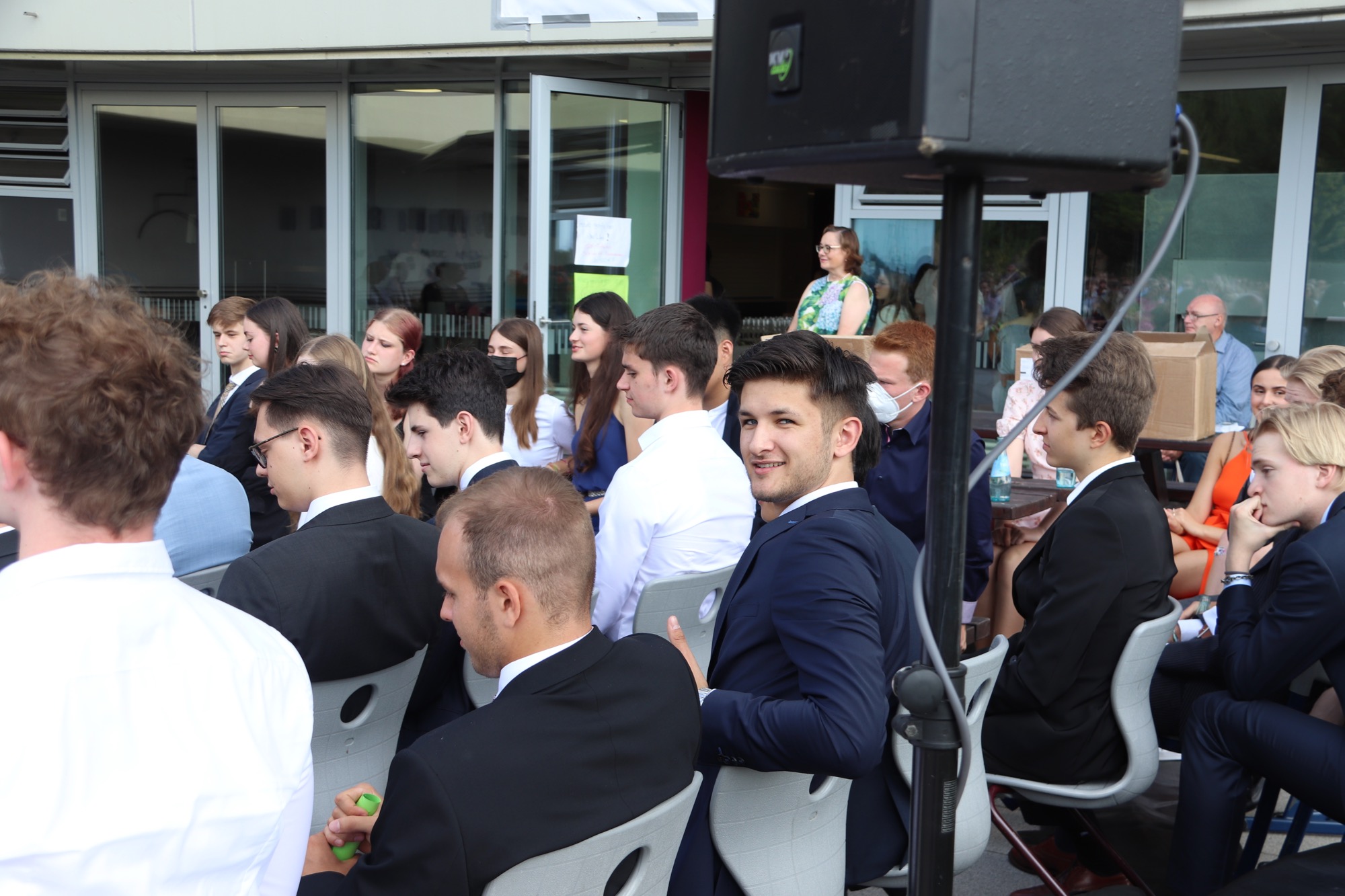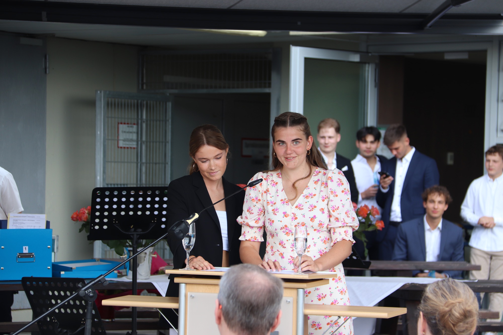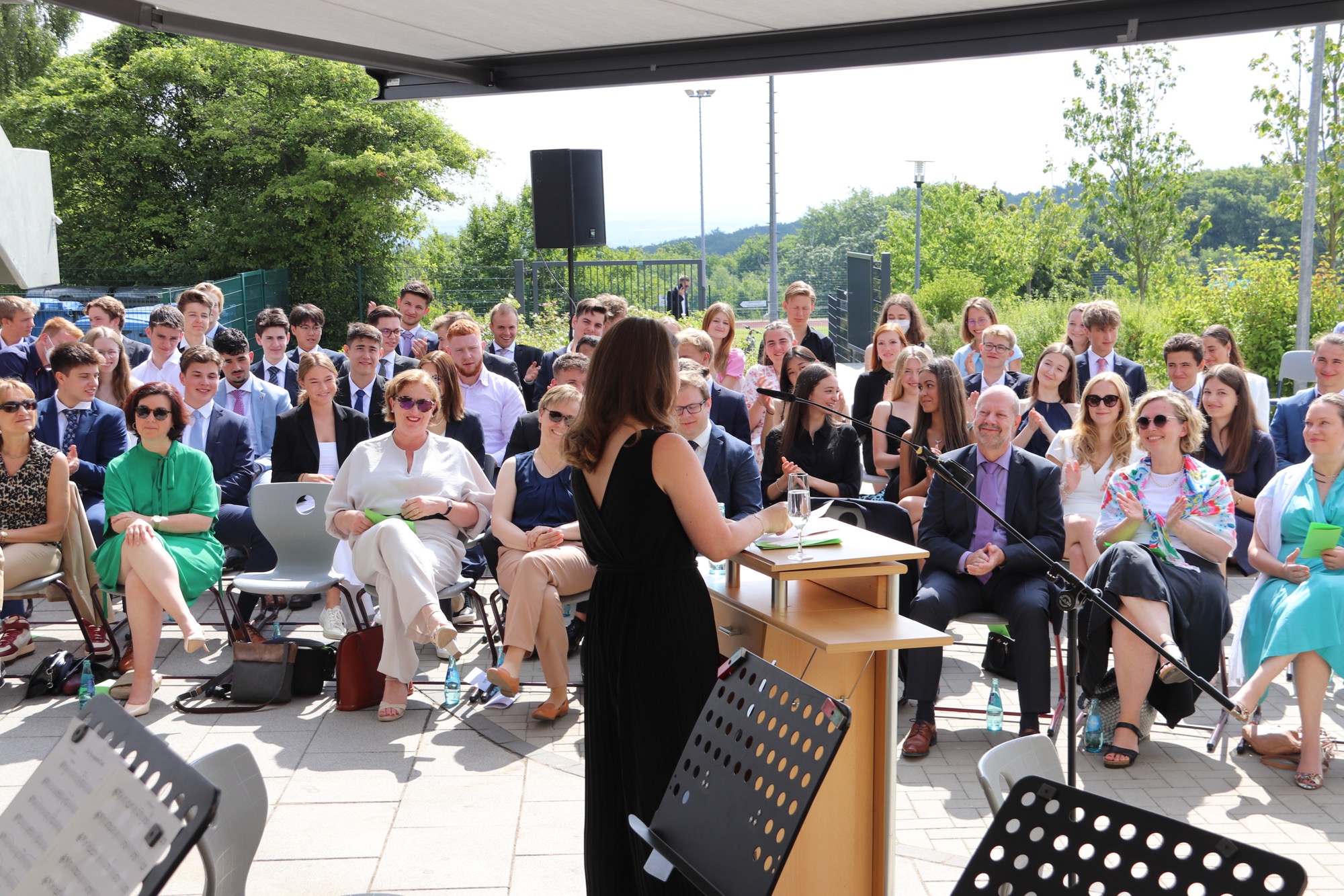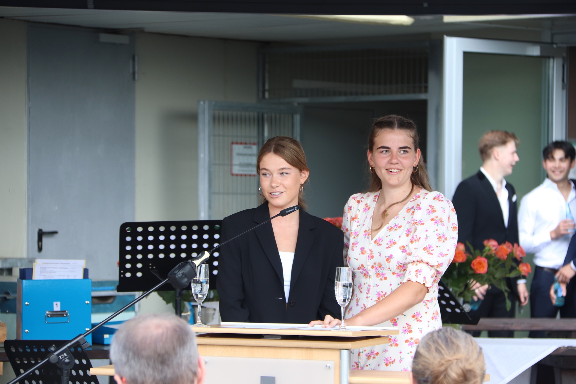 Als Vertreterin der Elternschaft bekräftigte Frau Köpf in ihrer Rede, wie herausfordernd die letzten Jahre für alle Familien gewesen seien, und gab den Absolvent*innen einige gute Ratschläge und Gedanken mit auf den Weg. In ihrer Rede von Seiten der Abiturient*innen ließen Lina Schumann und Charlotte Peeters zahlreiche Schlüsselerlebnisse der gemeinsamen Schulzeit Revue passieren und gratulierten ihren Weggefährt*innen zum erreichten Abitur – gefolgt von großem Applaus.