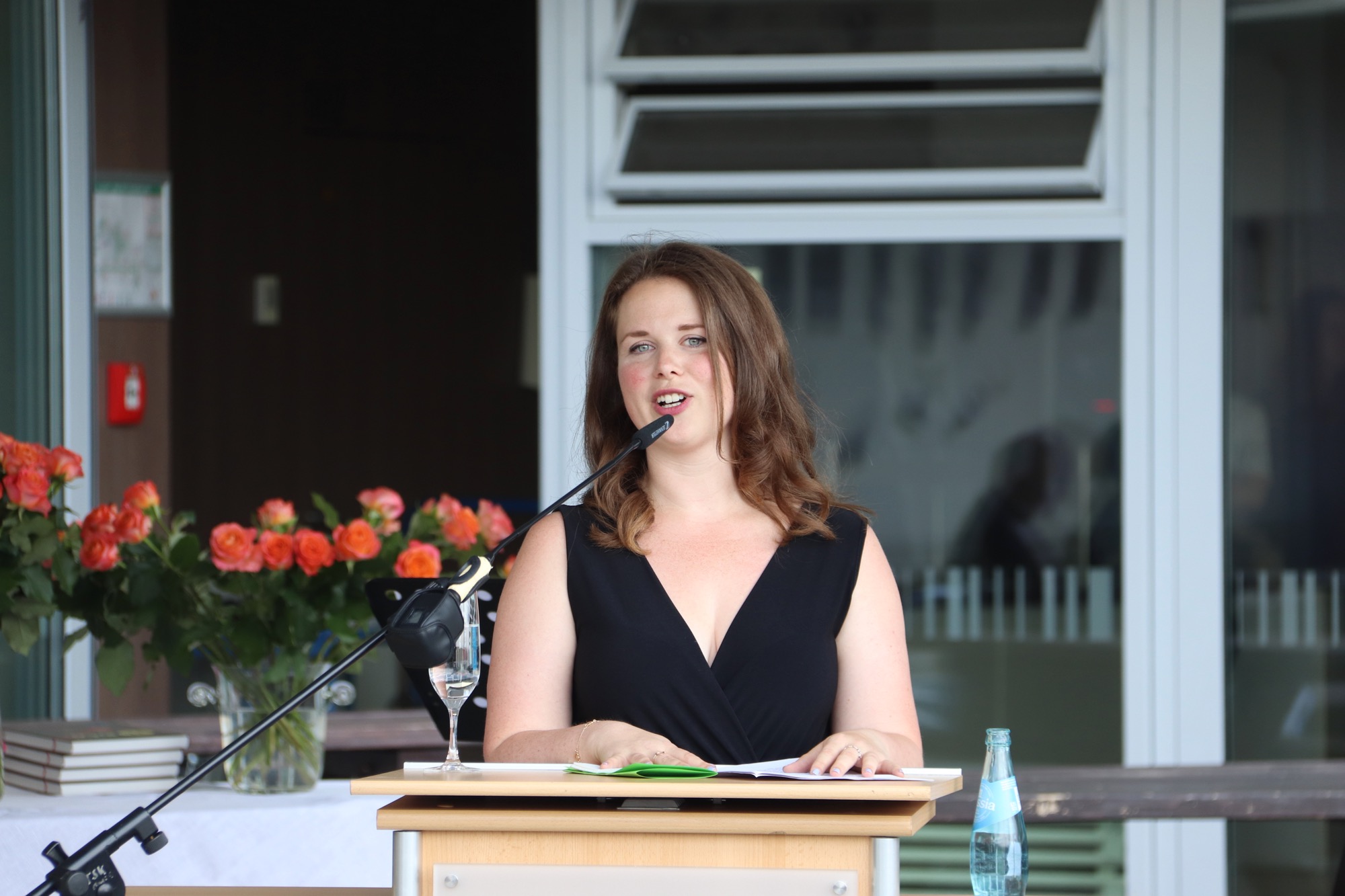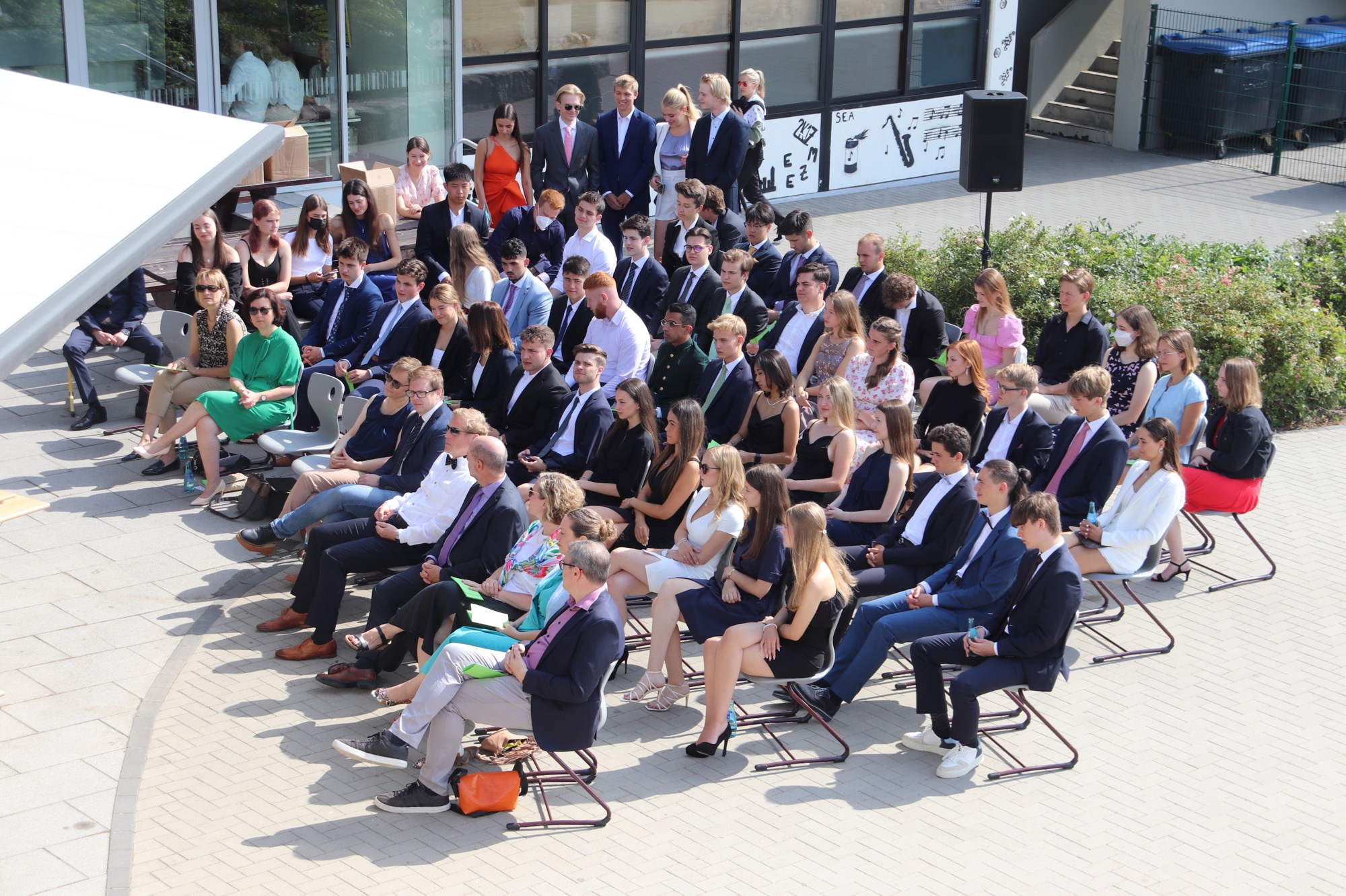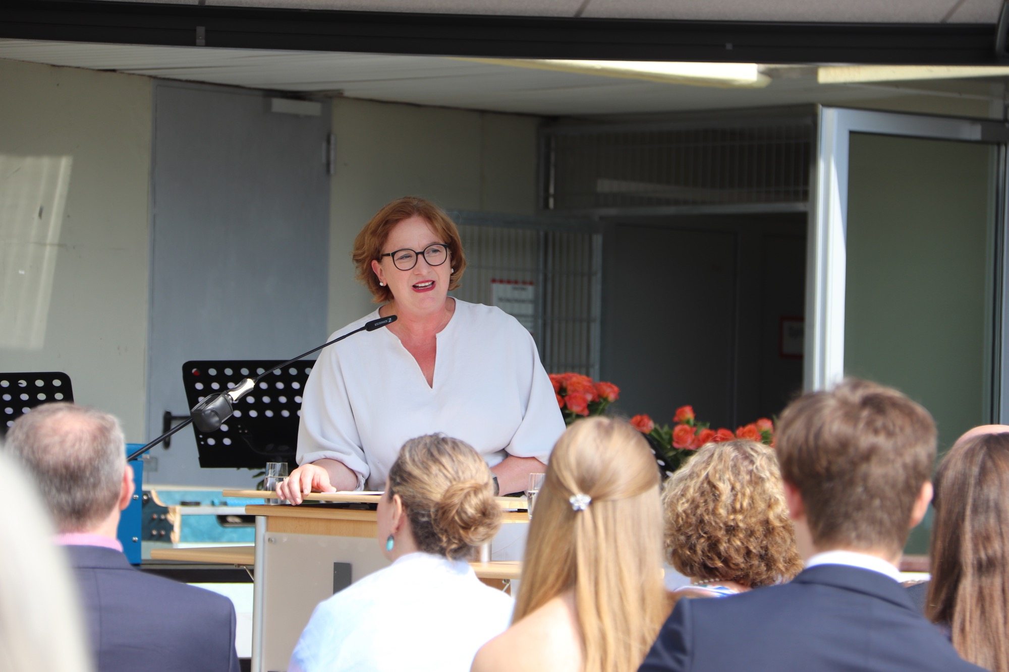 Als Vertreterin der Elternschaft bekräftigte Frau Köpf in ihrer Rede, wie herausfordernd die letzten Jahre für alle Familien gewesen seien, und gab den Absolvent*innen einige gute Ratschläge und Gedanken mit auf den Weg. In ihrer Rede von Seiten der Abiturient*innen ließen Lina Schumann und Charlotte Peeters zahlreiche Schlüsselerlebnisse der gemeinsamen Schulzeit Revue passieren und gratulierten ihren Weggefährt*innen zum erreichten Abitur – gefolgt von großem Applaus.