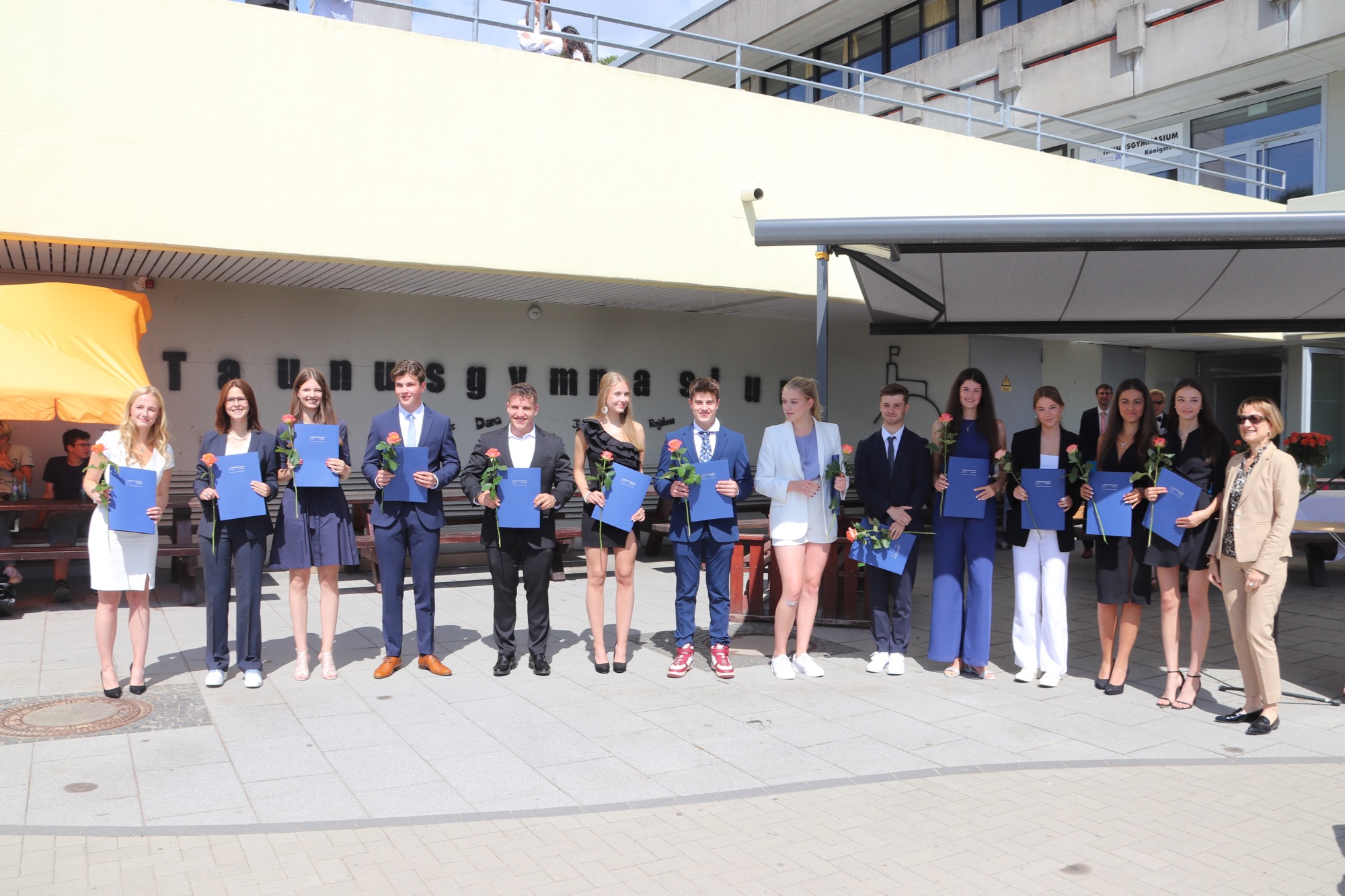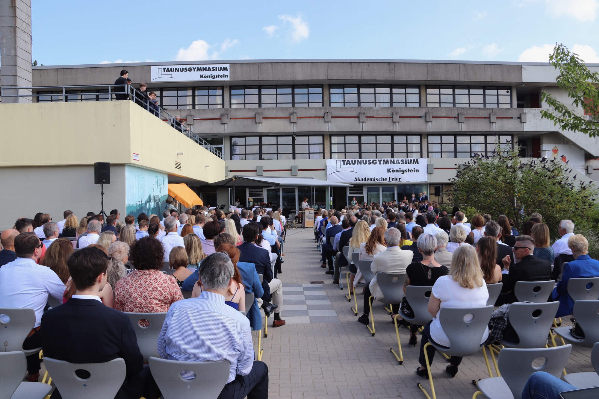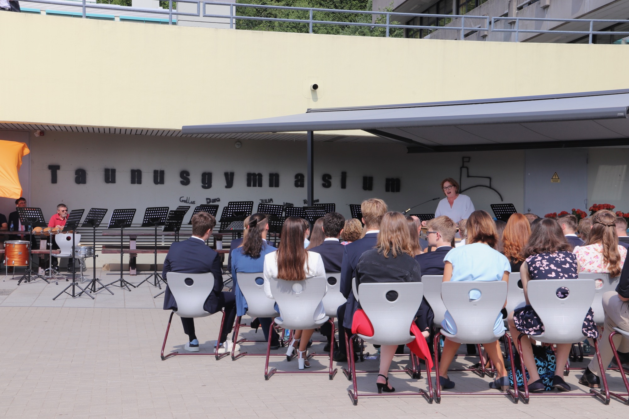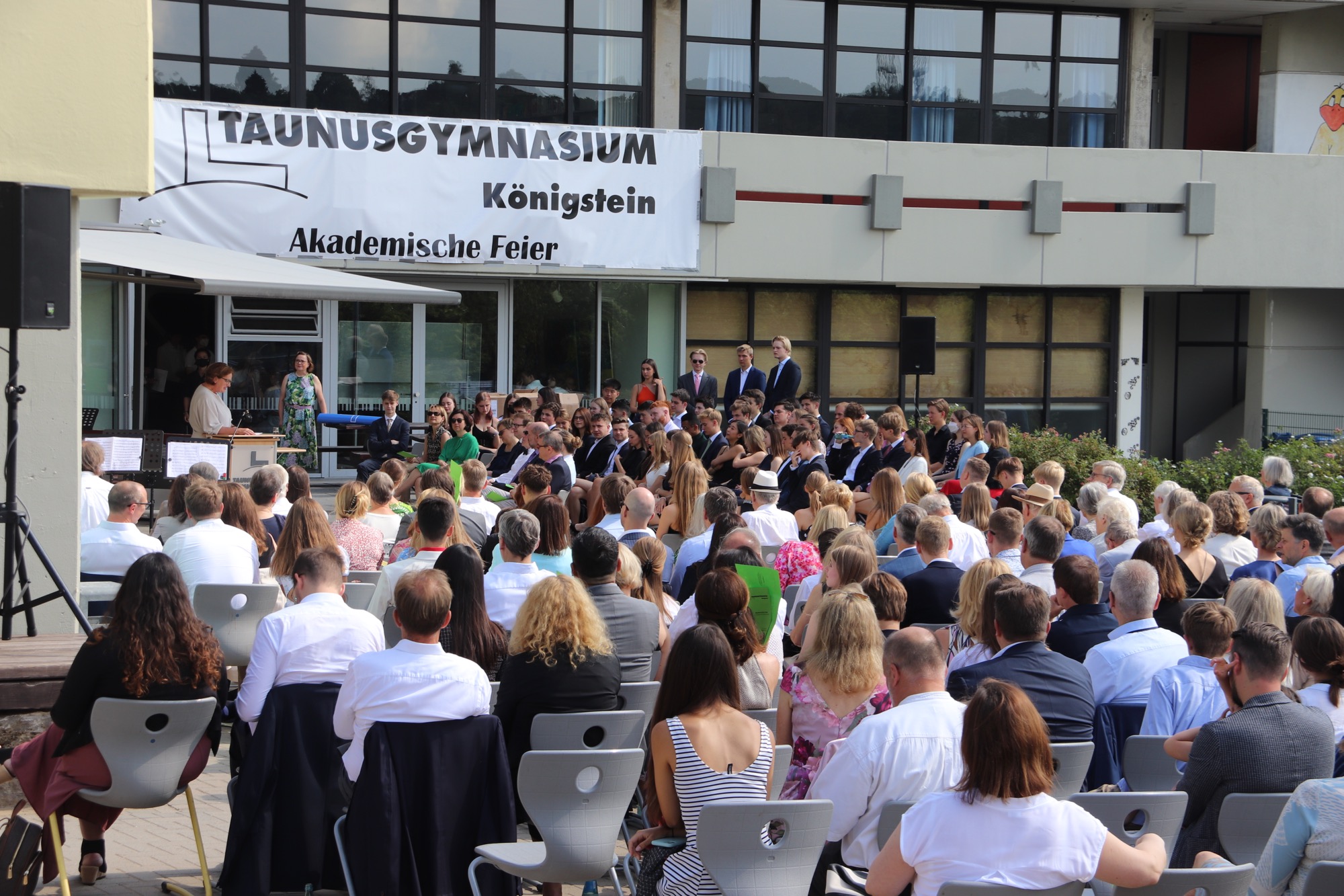 Ein besonderer Abiturjahrgang war es, der im Rahmen einer stimmungsvollen Akademischen Feier vom Taunusgymnasium verabschiedet wurde: Als erster G8-Jahrgang des Gymnasiums, der das Abitur erreichte, waren es diesmal besonders junge und ungewöhnlich wenige Abiturient*innen, die ihre Reifezeugnisse und weitere Ehrungen in Empfang nahmen. Wie im letzten Jahr fanden sich die Absolvent*innen, Eltern und Freunde sowie Lehrkräfte bei strahlendem Sommerwetter auf dem festlich geschmückten Schulhof ein und begingen den denkwürdigen Tag mit Musik, inspirierenden Ansprachen und gekühltem Sekt.