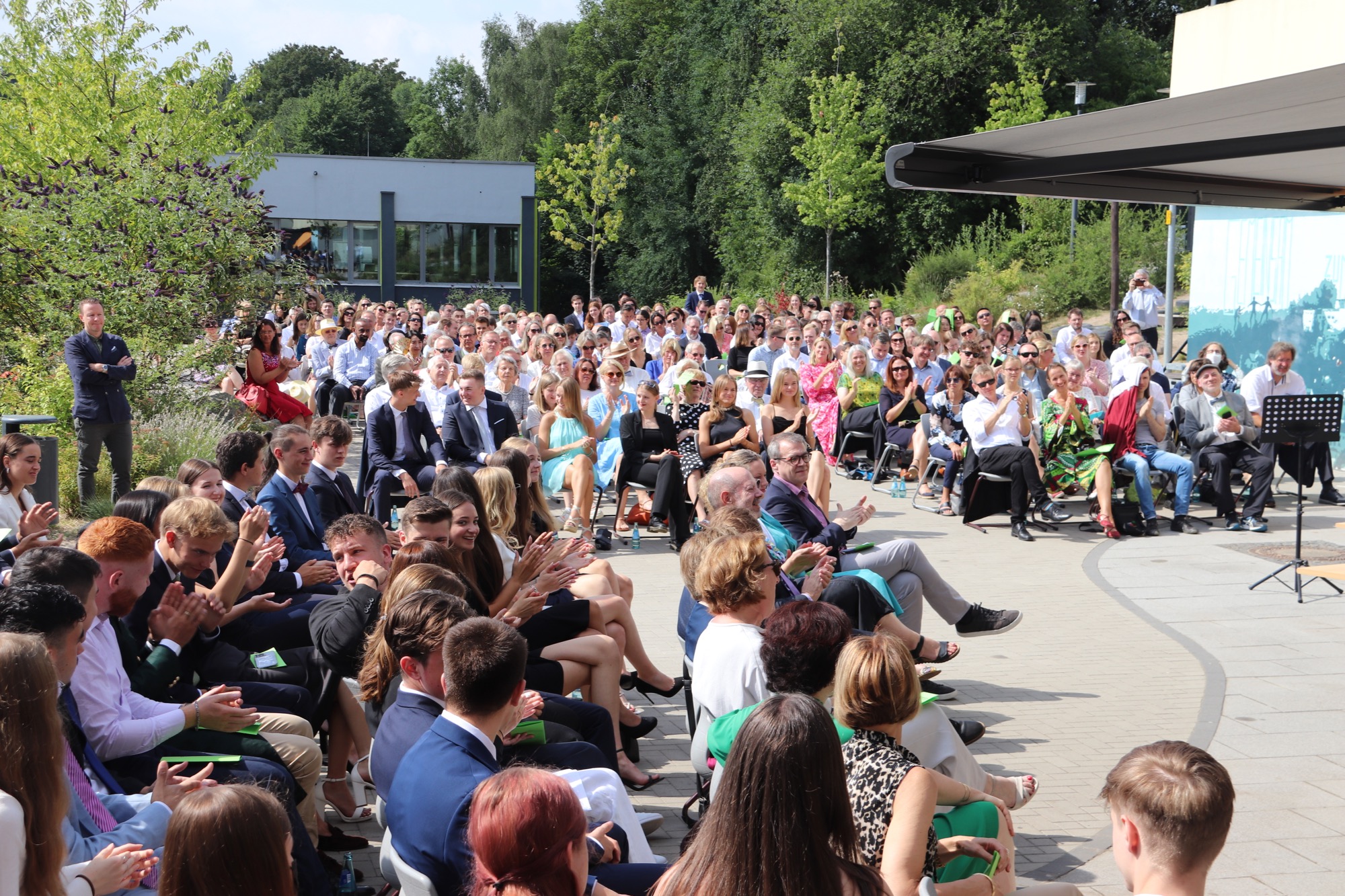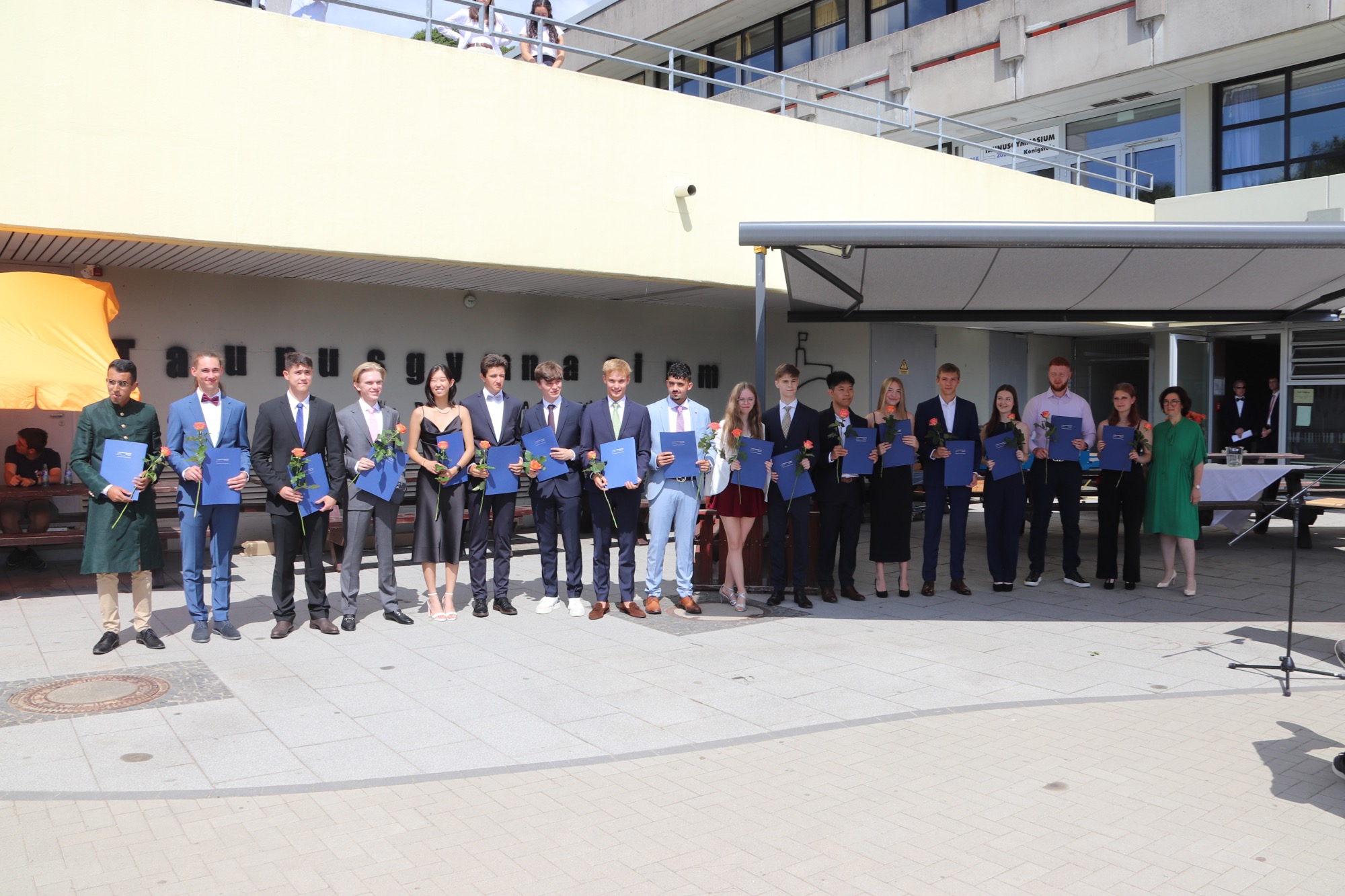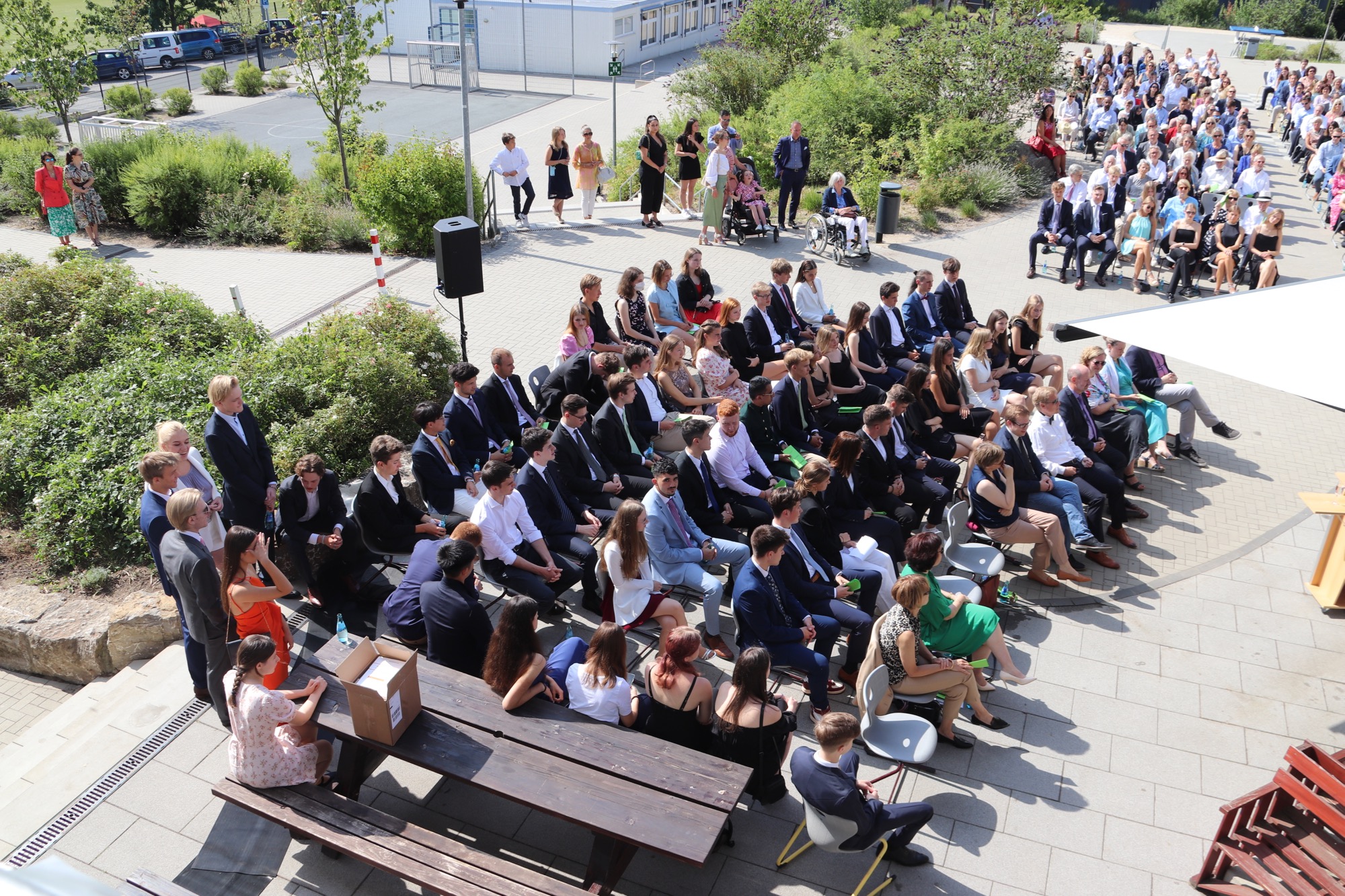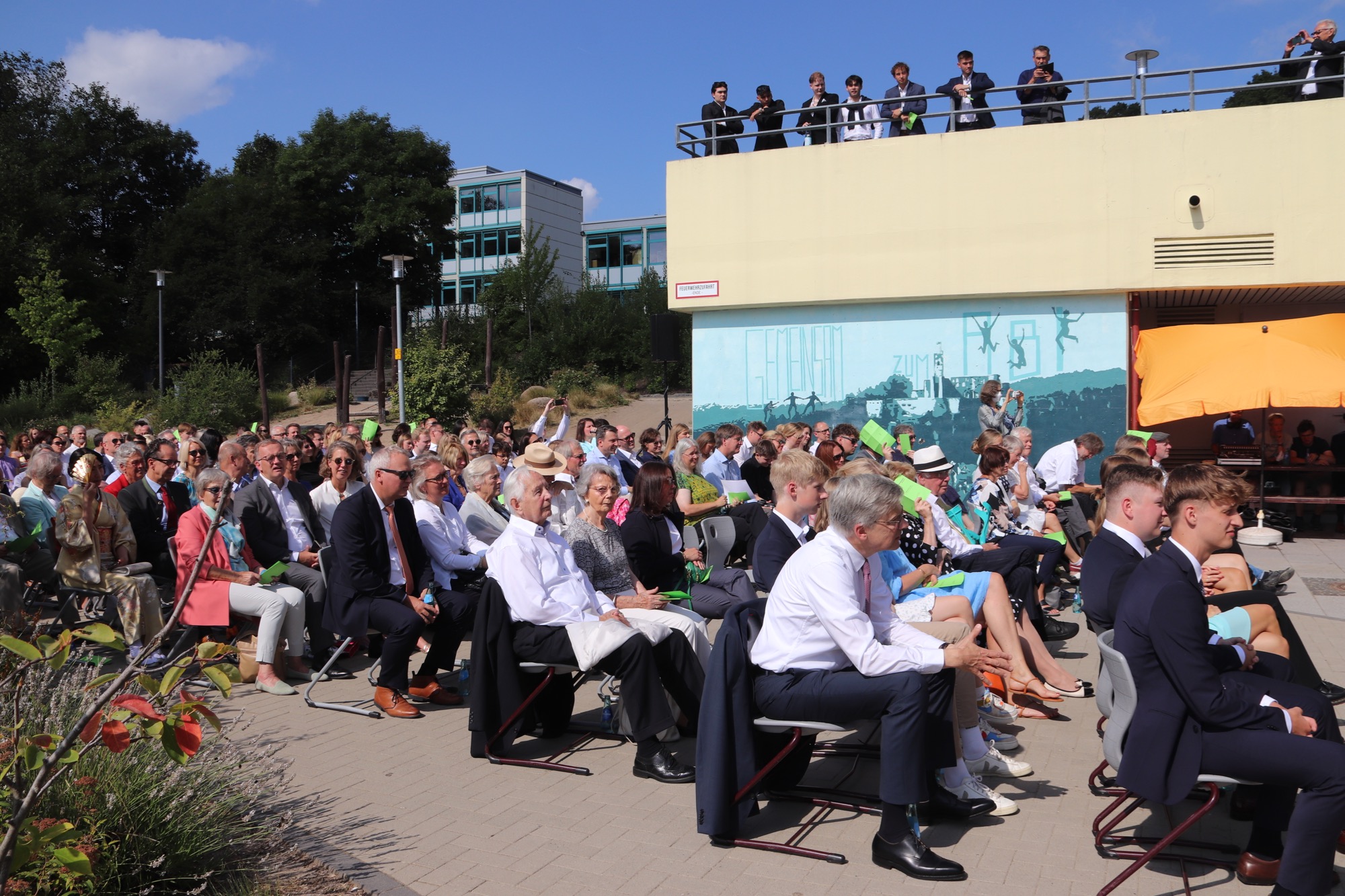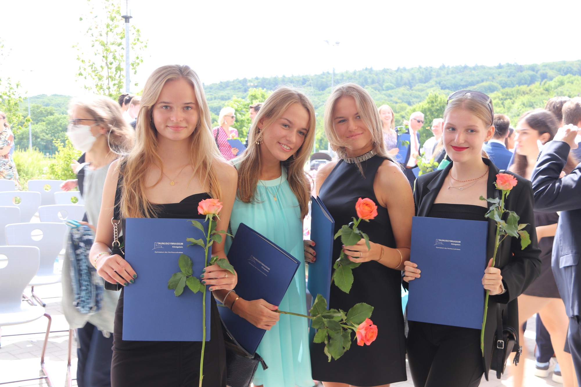Ein besonderer Abiturjahrgang war es, der im Rahmen einer stimmungsvollen Akademischen Feier vom Taunusgymnasium verabschiedet wurde: Als erster G8-Jahrgang des Gymnasiums, der das Abitur erreichte, waren es diesmal besonders junge und ungewöhnlich wenige Abiturient*innen, die ihre Reifezeugnisse und weitere Ehrungen in Empfang nahmen. Wie im letzten Jahr fanden sich die Absolvent*innen, Eltern und Freunde sowie Lehrkräfte bei strahlendem Sommerwetter auf dem festlich geschmückten Schulhof ein und begingen den denkwürdigen Tag mit Musik, inspirierenden Ansprachen und gekühltem Sekt.