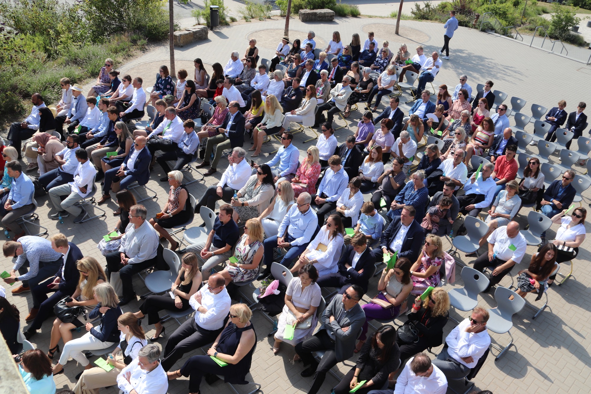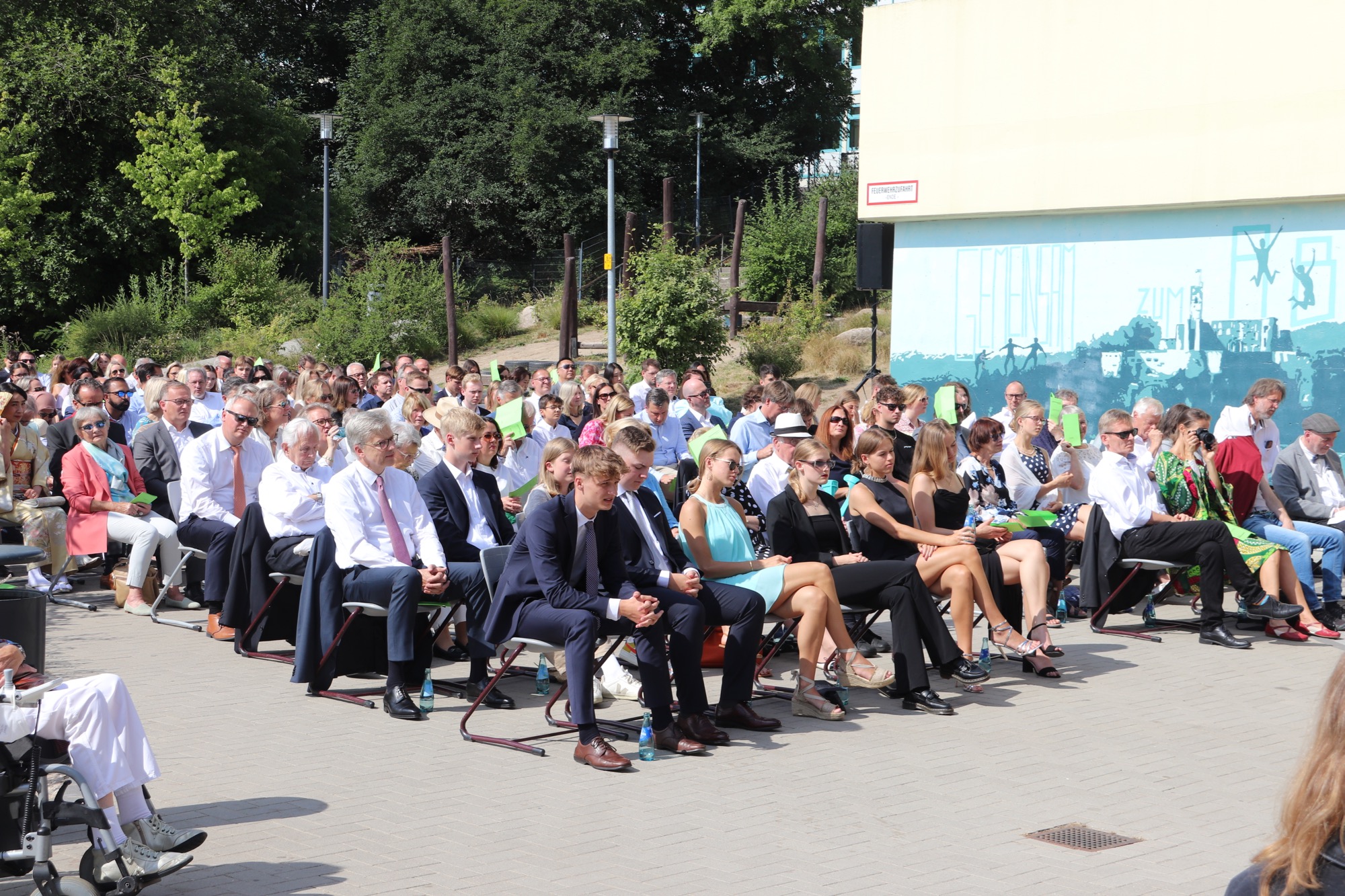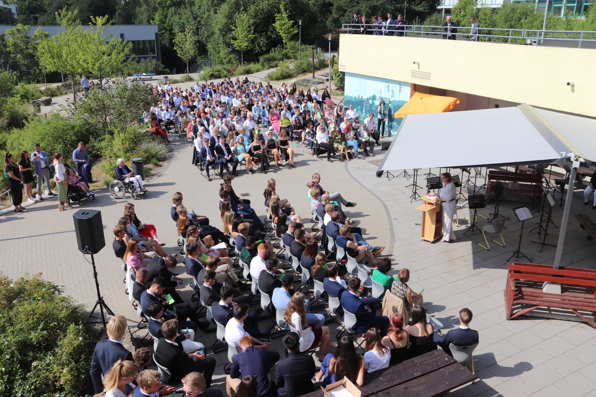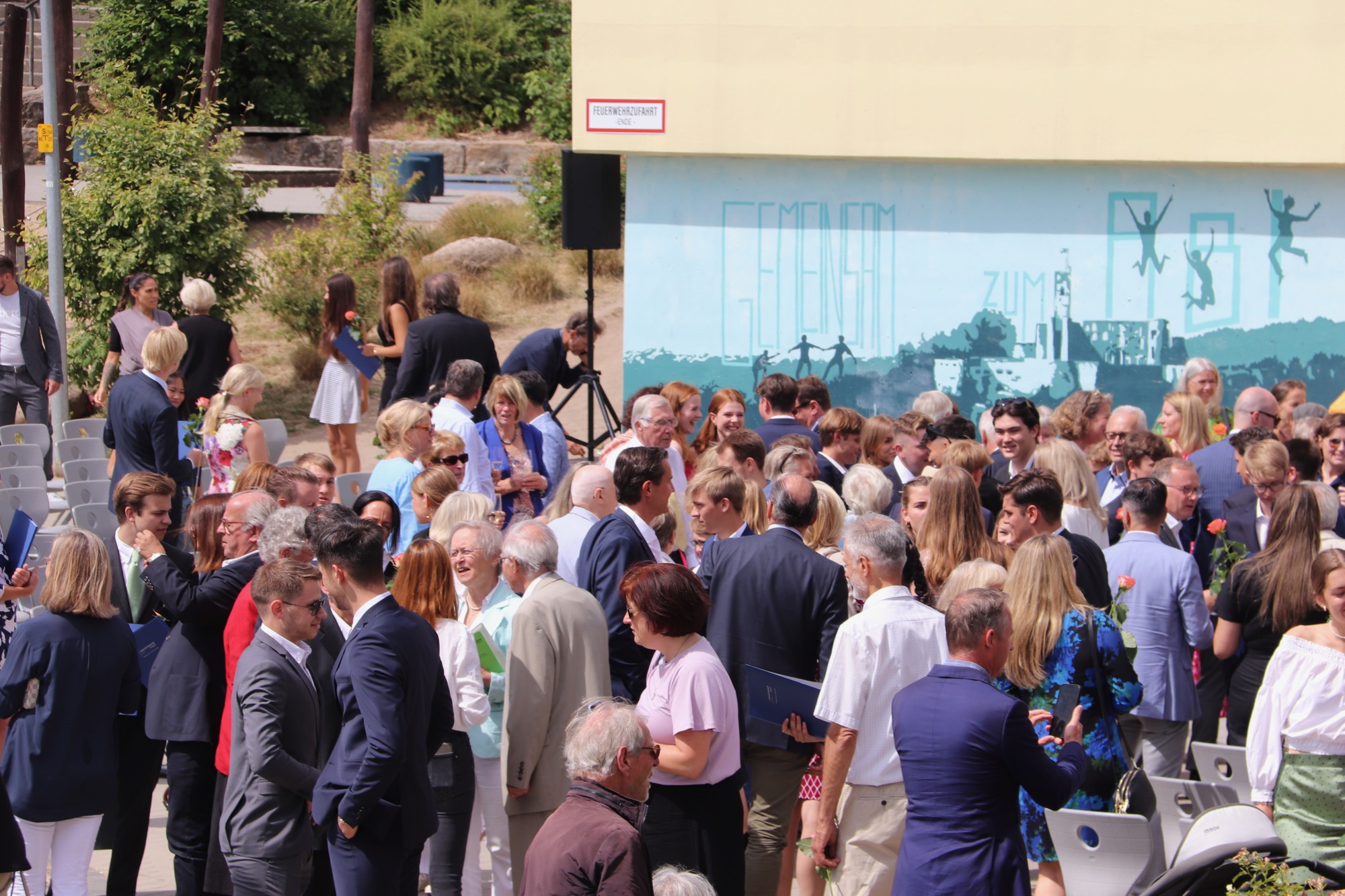Ein besonderer Abiturjahrgang war es, der im Rahmen einer stimmungsvollen Akademischen Feier vom Taunusgymnasium verabschiedet wurde: Als erster G8-Jahrgang des Gymnasiums, der das Abitur erreichte, waren es diesmal besonders junge und ungewöhnlich wenige Abiturient*innen, die ihre Reifezeugnisse und weitere Ehrungen in Empfang nahmen. Wie im letzten Jahr fanden sich die Absolvent*innen, Eltern und Freunde sowie Lehrkräfte bei strahlendem Sommerwetter auf dem festlich geschmückten Schulhof ein und begingen den denkwürdigen Tag mit Musik, inspirierenden Ansprachen und gekühltem Sekt.