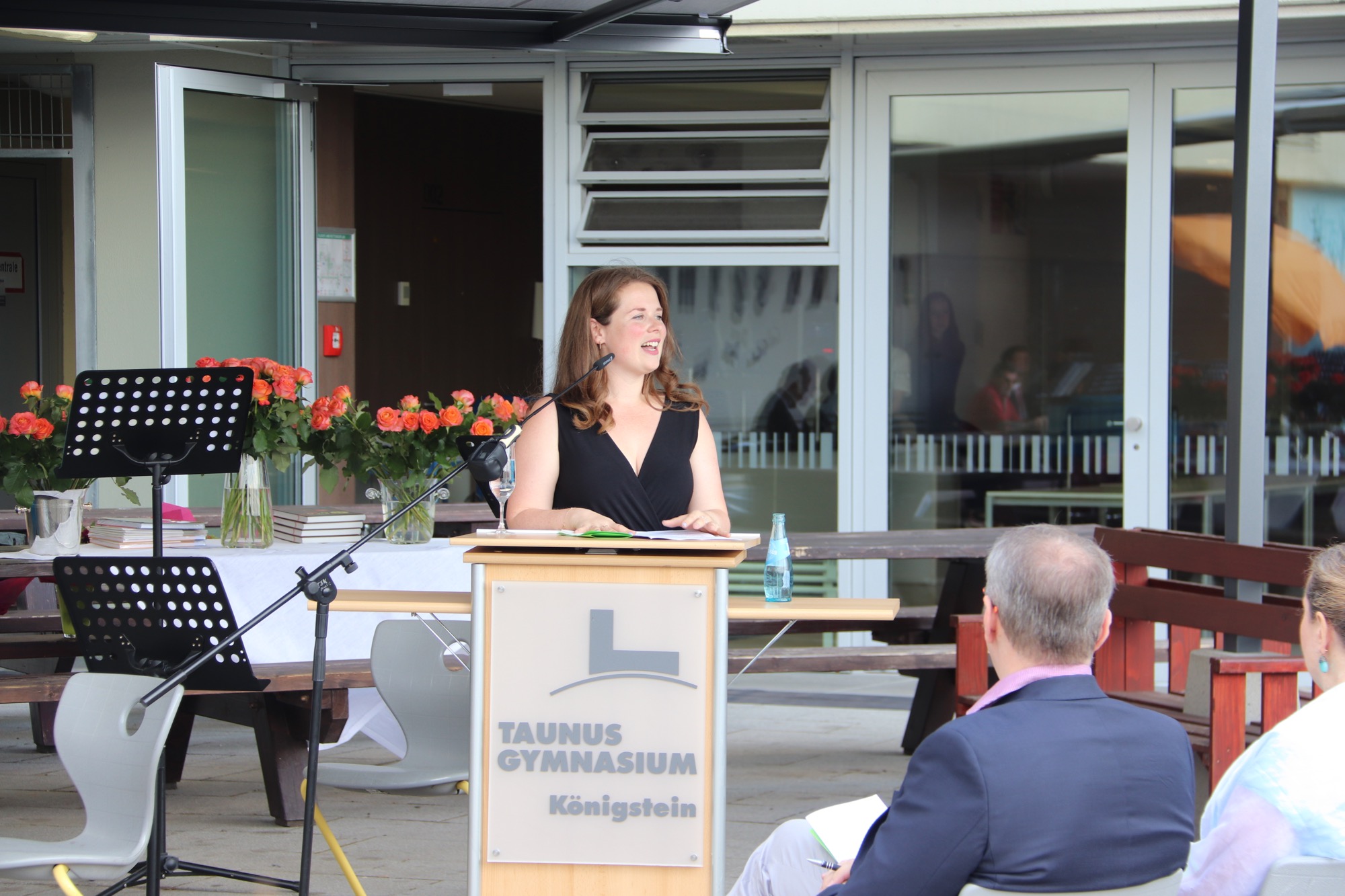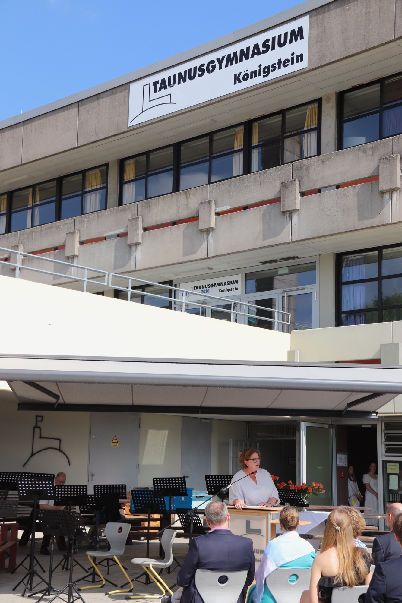 In ihrer inspirierenden Begrüßungsrede betonte Frau Herbst, Schulleiterin des Taunusgymnasiums, die durchaus privilegierten Voraussetzungen, mit denen einige der Abiturient*innen starten durften, etwa die geduldige und umfassende Unterstützung seitens der Eltern. Wieder einmal liege der Abiturdurchschnitt mit 2,18 weit über dem Landesdurchschnitt, mit dreimal der Note 1,0. Was das Besondere daran sei? „Ihr seid es, mit all euren Möglichkeiten“, so Frau Herbst. Sie ermutigte die Abiturient*innen, nun aus alldem, was sie erreicht und bekommen hätten, „etwas Besonderes zu machen“. Die Schulleiterin weiter: „Haltet euch nicht auf mit Dingen, für die ihr nicht brennt. Widersteht den Verlockungen der schönen Warenwelt, dem Schimmer des Geldes, der lähmenden Selbstzufriedenheit.“ Sie appellierte an die Absolvent*innen, ein erfülltes Leben zu suchen, und dieser Weg sei nicht immer bequem. „Strengt euch an! Achtet die Interessen der anderen und lernt – alles, was sich euch bietet.“ Frau Herbst ermunterte die jungen Menschen, sich etwas zuzutrauen, sich einzumischen, Verantwortung für das eigene Leben zu übernehmen und das von anderen. „Wer, wenn nicht ihr? Ihr seid großartige jünge Männer und Frauen. Das Besondere ist das, was jetzt beginnt. Das, was kommt. Das, was ihr anpackt. Das, wozu ihr fähig seid. Dazu wünsche ich euch alles Gute.“